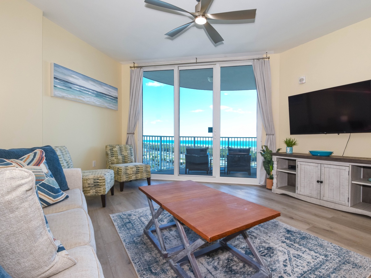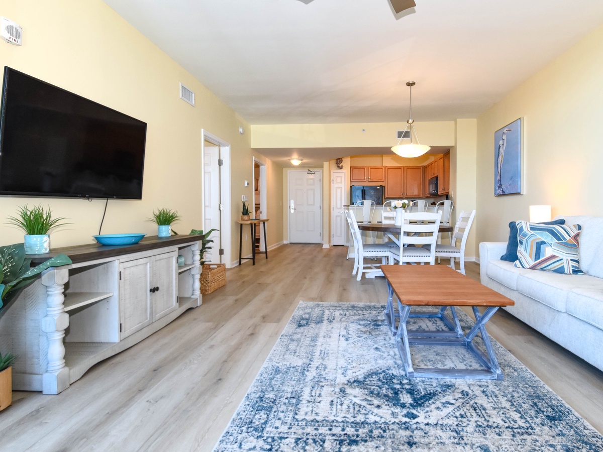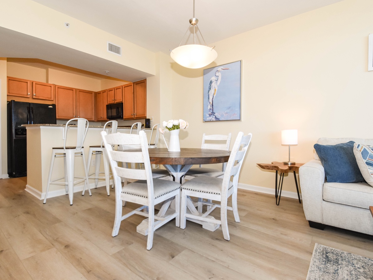 Welcome to The Palms of Destin 11208 Junior! Located on the 12th floor, this charming two-bedroom, two-bathroom condo vacation rental offers the perfect blend of comfort and convenience in the heart of Destin, Florida. Inside the condo, you'll find an open concept living and dining area that leads to an inviting balcony with stunning views from the 12th floor of the first tower. The comfortable living space features a large flat-screen TV, while the fully equipped kitchen makes preparing meals a breeze. The spacious primary bedroom features a plush king bed and an attached bathroom with tub/shower combo. The guest bedroom is perfect for children with a twin-over-full bunk bed adjacent next to a guest bathroom with a walk-in shower. For added convenience, this condo also includes a washer and dryer, secure Wi-Fi, and all the essentials for a comfortable stay. Whether you're here to relax by the pool, explore Destin’s attractions, or spend your days on the sand, The Palms of Destin 11208 is your perfect beach retreat!