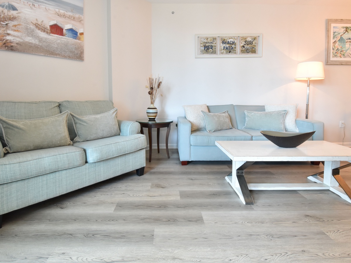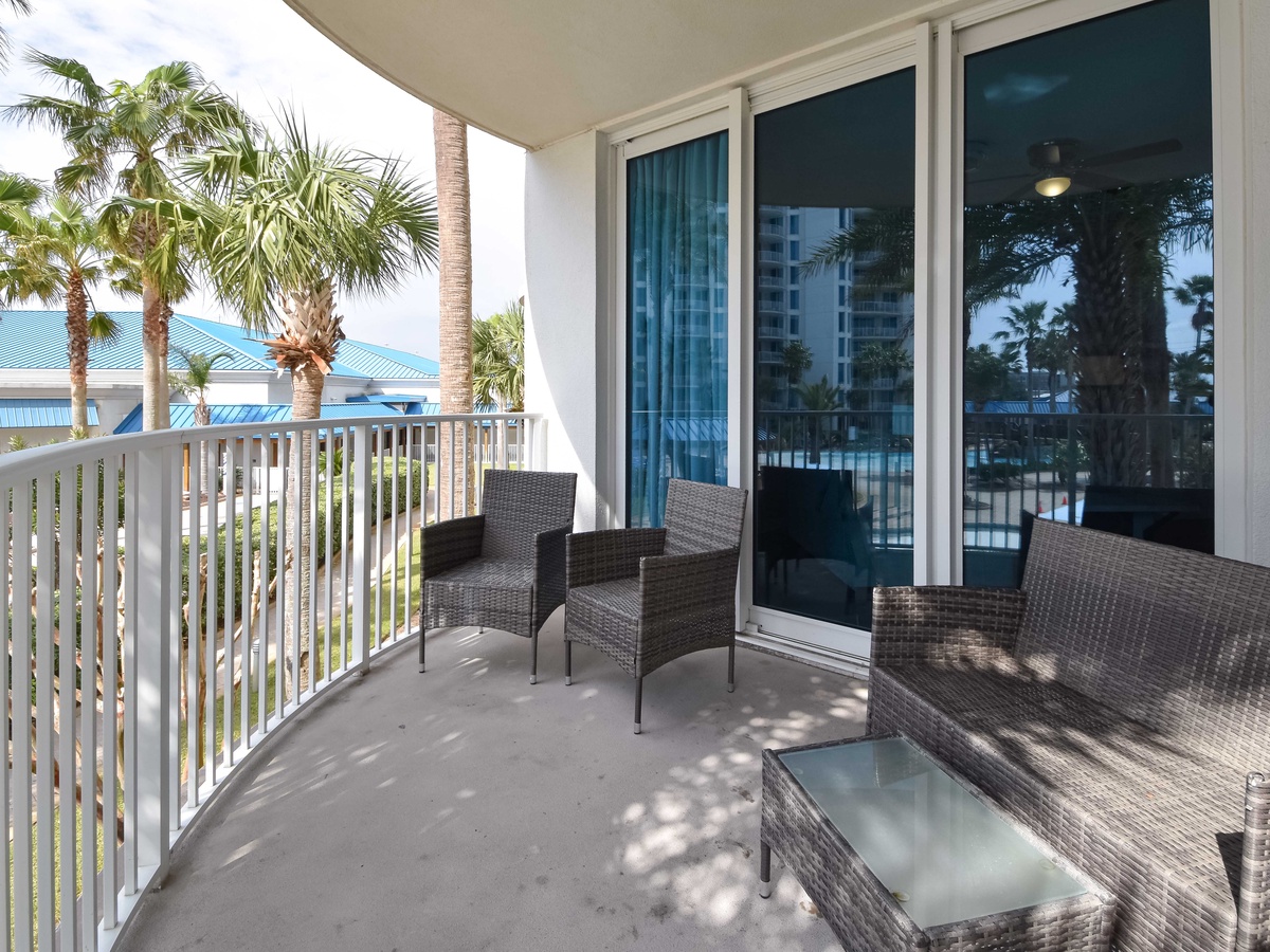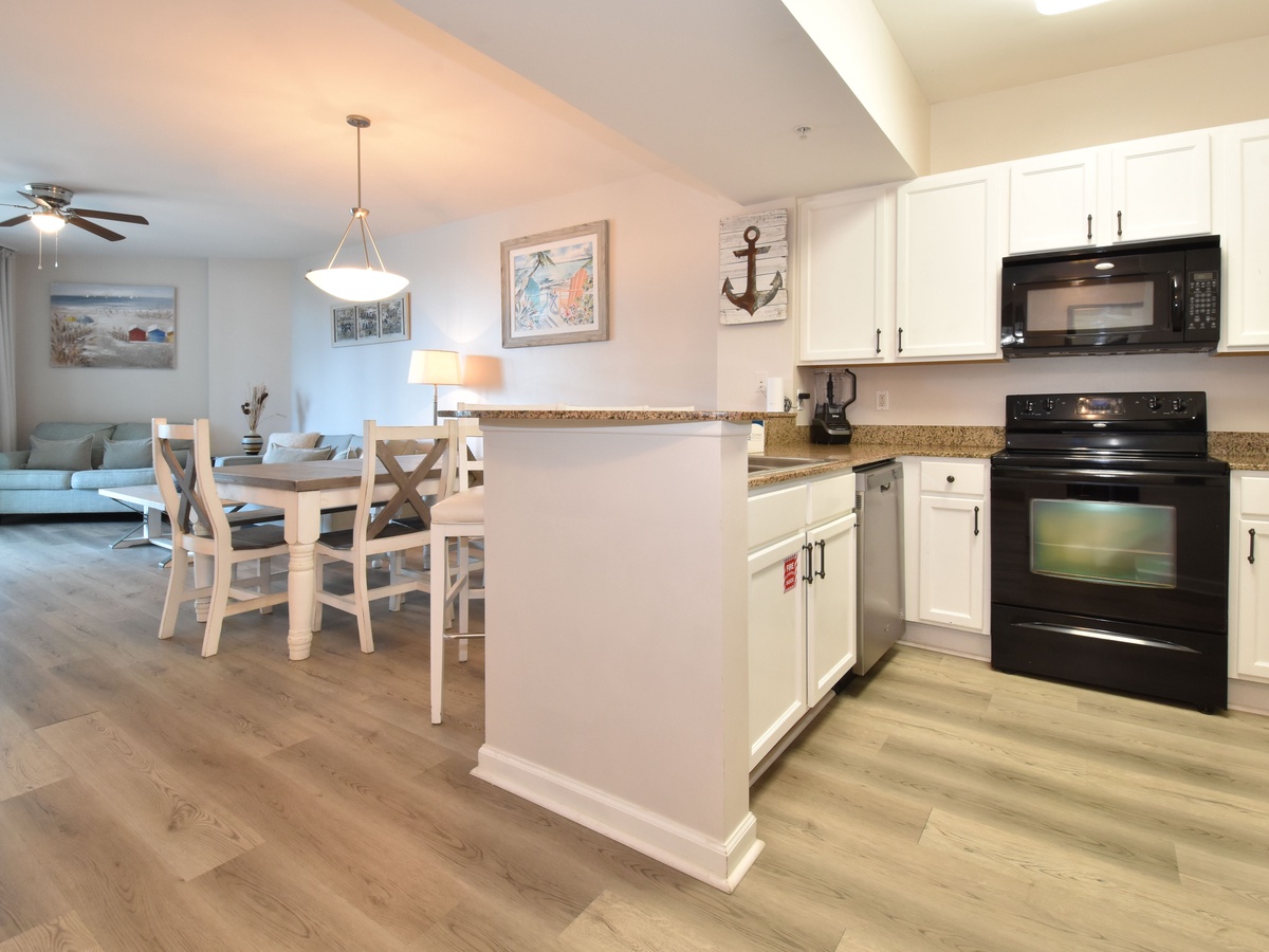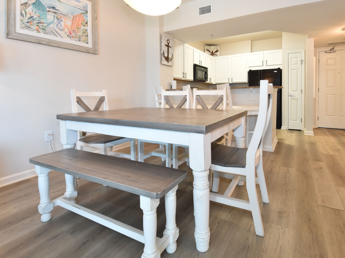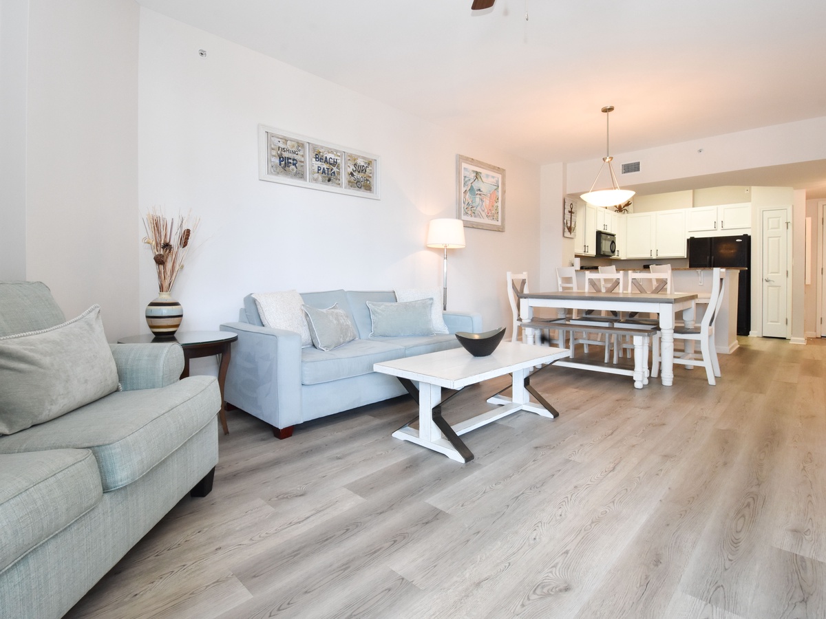 Welcome to The Palms of Destin 1209 Junior! Located on the second floor, this two-bedroom, two-bathroom condo offers everything you need for a relaxing beach getaway in the heart of Destin, Florida. The open-concept living and dining area features a flat-screen TV, queen sleeper sofa, and access to a private balcony with second-floor views, perfect for sipping coffee in the morning or unwinding after a day in the sun. The fully equipped kitchen includes modern appliances, granite countertops, and a breakfast bar for casual dining, along with an adjacent dining area ideal for meals or game nights. The spacious primary bedroom features a king bed and a private bathroom with a shower/tub combo. The guest bedroom is perfect for kids or extra guests with its twin over full bunk bed and has easy access to the second full bathroom with a walk-in shower. For added convenience, the condo includes a washer and dryer, secure Wi-Fi, and all the essentials to make your stay comfortable. Whether you’re lounging by the resort-style pool, catching the complimentary beach shuttle, or exploring Destin, 1209 Junior is your perfect home base.