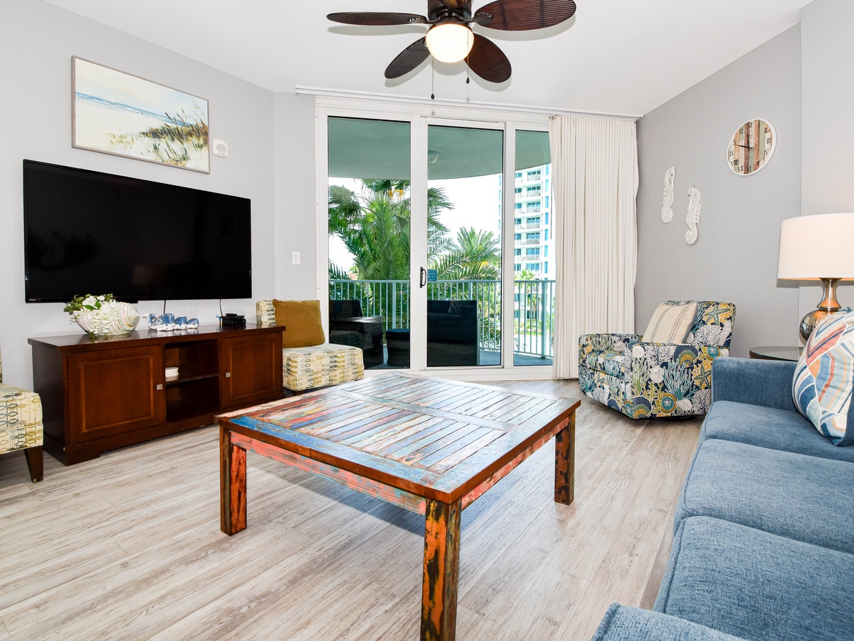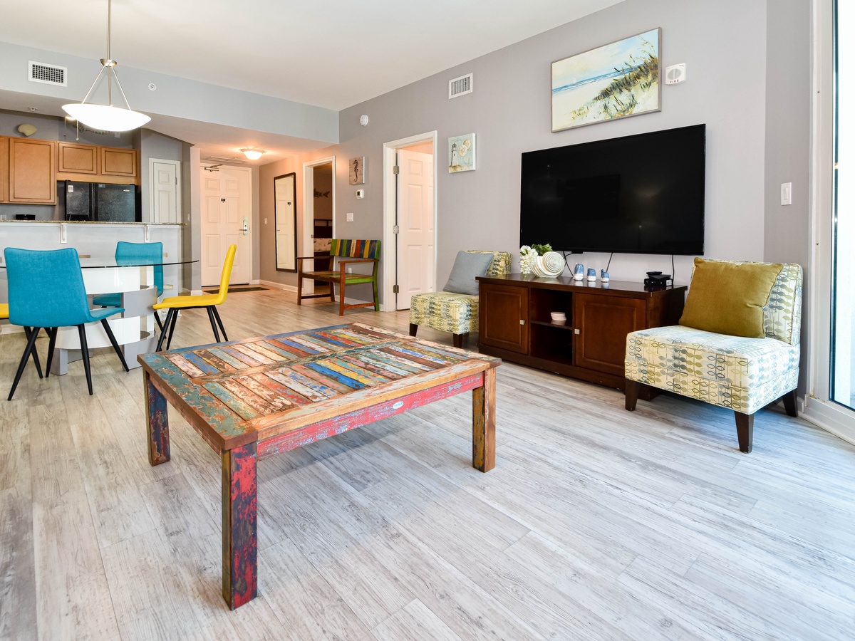 Welcome to The Palms of Destin 1309 Junior! Located on the third floor, this charming two-bedroom, two-bathroom condo offers a relaxing retreat in the heart of Destin. With an inviting open-concept layout, you’ll enjoy a spacious living area, fully equipped kitchen, and access to a private balcony with serene views. The living area features a queen sleeper sofa, large flat-screen TV, and plenty of seating for relaxing after a day at the beach. The primary bedroom offers a king-sized bed, private bathroom with a shower/tub combo, flat-screen TV, and ample closet space. The guest bedroom features a twin bed with an attached twin trundle, flat-screen TV, and easy access to the second full bathroom with a walk-in shower. For added convenience, this condo includes an in-unit washer and dryer. Make unforgettable beach memories at The Palms of Destin 1309, your coastal getaway awaits!