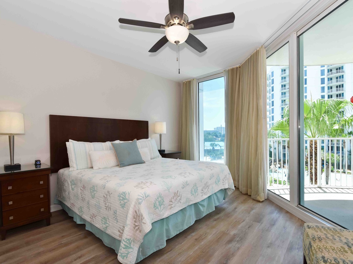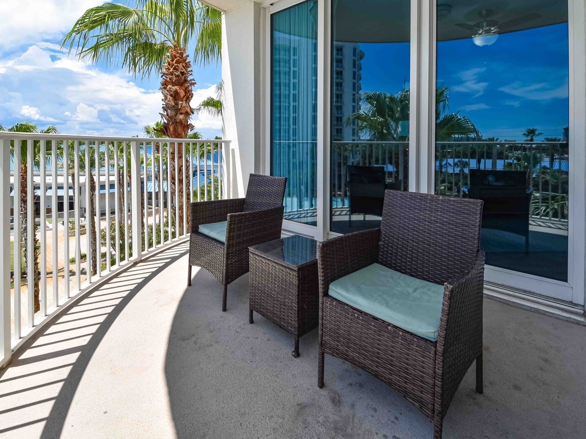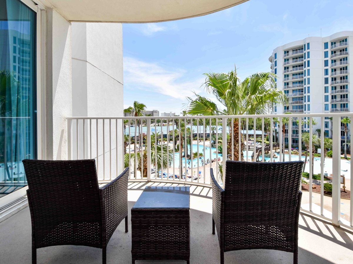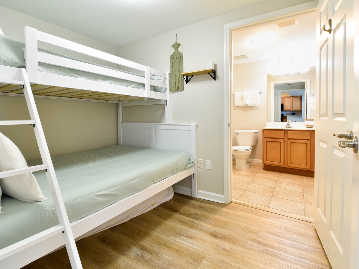 Unwind at The Palms of Destin 1413 Junior! Escape to this two-bedroom, two-bathroom condo on your next beach vacation. Perched on the fourth floor, the balcony offers cozy furniture overlooking the largest resort lagoon pool in Destin making it the perfect spot to start or end your day. Inside, whip up a delicious meal in the fully equipped kitchen with plenty of prep space with granite counters. After preparing a delicious meal, gather around the dining table with space for four with three bar stools at the breakfast bar to savor your meal and share your favorite vacation moments. The living room provides a cozy retreat, ideal for unwinding after a day of exploration. Relax and enjoy a movie on the large flat screen TV with a delicious snack. The primary bedroom features a plush king bed, balcony access, and an attached bathroom with a tub/shower combo. The guest bedroom includes a twin-over-full bunk bed and direct access to the guest bathroom with a walk-in shower. Additional features include a sleeper sofa in the living room and convenient in-unit laundry with a washer and dryer. Come make lasting memories at The Palms of Destin 1413.