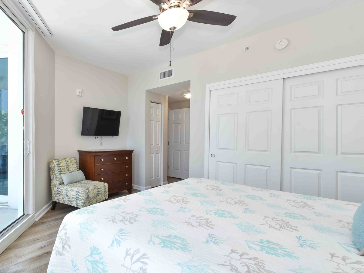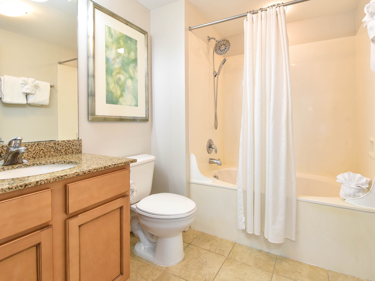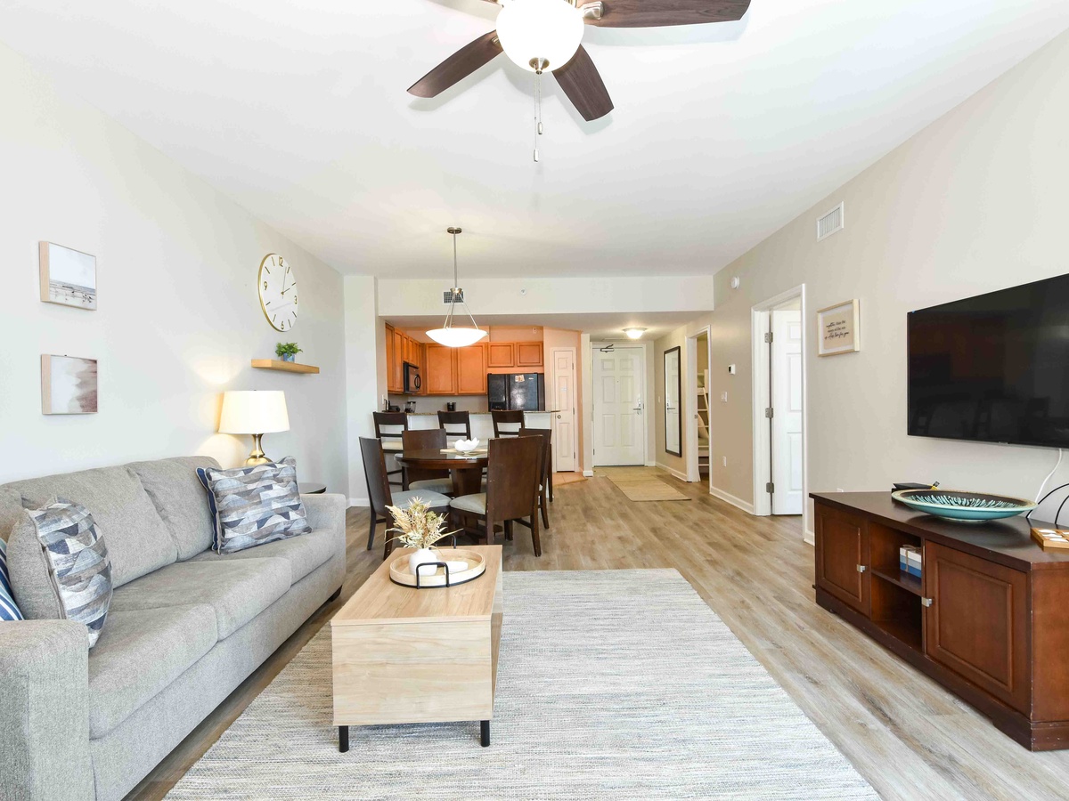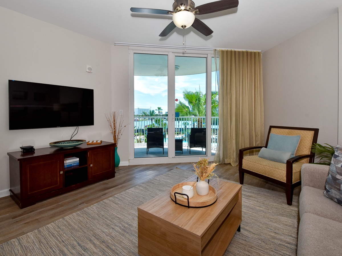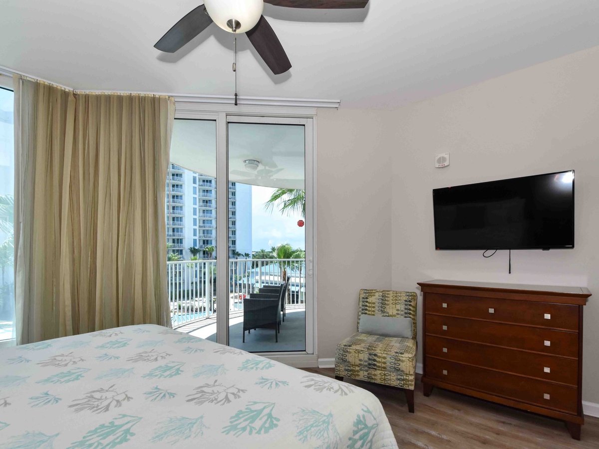 Unwind at The Palms of Destin 1413 Junior! Escape to this two-bedroom, two-bathroom condo on your next beach vacation. Perched on the fourth floor, the balcony offers cozy furniture overlooking the largest resort lagoon pool in Destin making it the perfect spot to start or end your day. Inside, whip up a delicious meal in the fully equipped kitchen with plenty of prep space with granite counters. After preparing a delicious meal, gather around the dining table with space for four with three bar stools at the breakfast bar to savor your meal and share your favorite vacation moments. The living room provides a cozy retreat, ideal for unwinding after a day of exploration. Relax and enjoy a movie on the large flat screen TV with a delicious snack. The primary bedroom features a plush king bed, balcony access, and an attached bathroom with a tub/shower combo. The guest bedroom includes a twin-over-full bunk bed and direct access to the guest bathroom with a walk-in shower. Additional features include a sleeper sofa in the living room and convenient in-unit laundry with a washer and dryer. Come make lasting memories at The Palms of Destin 1413.
