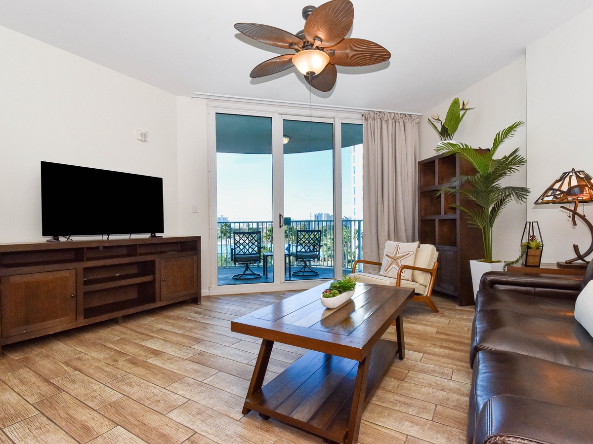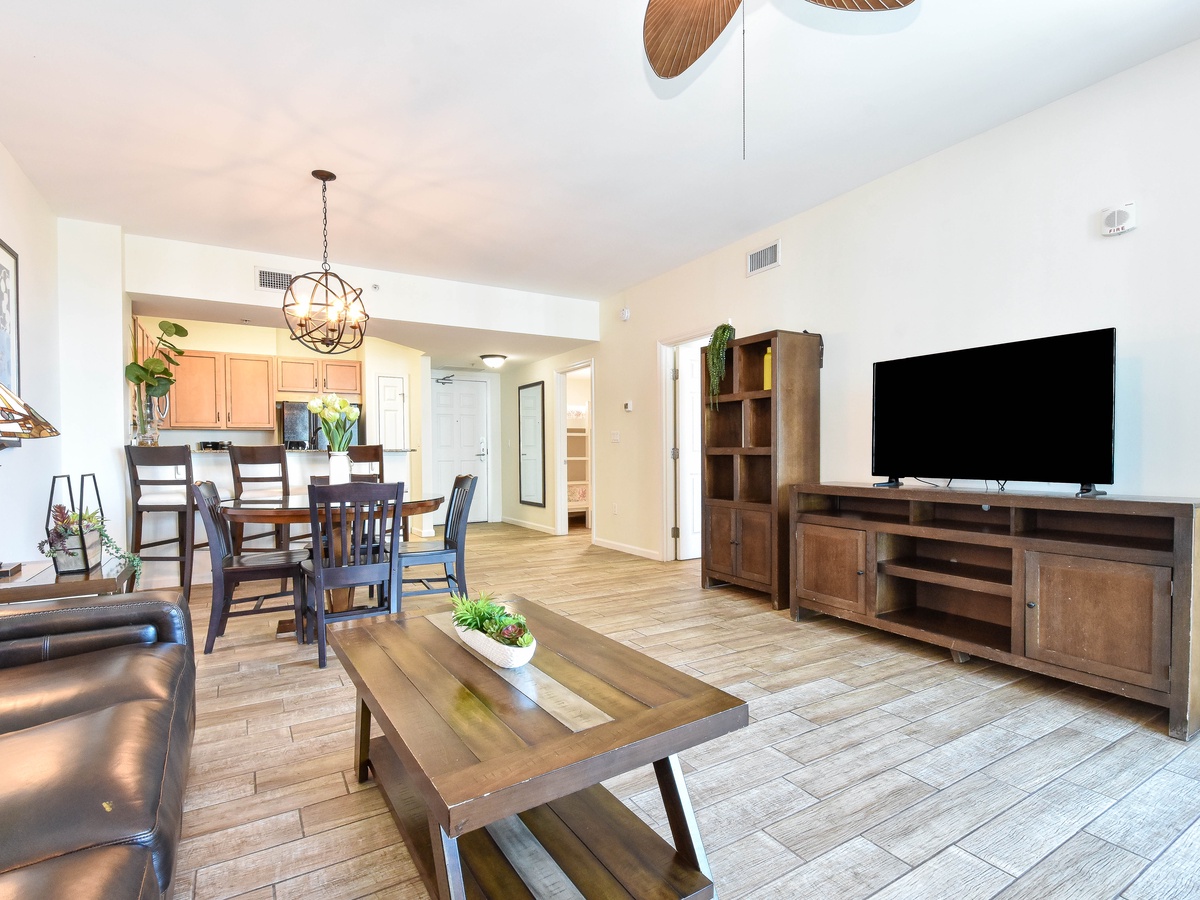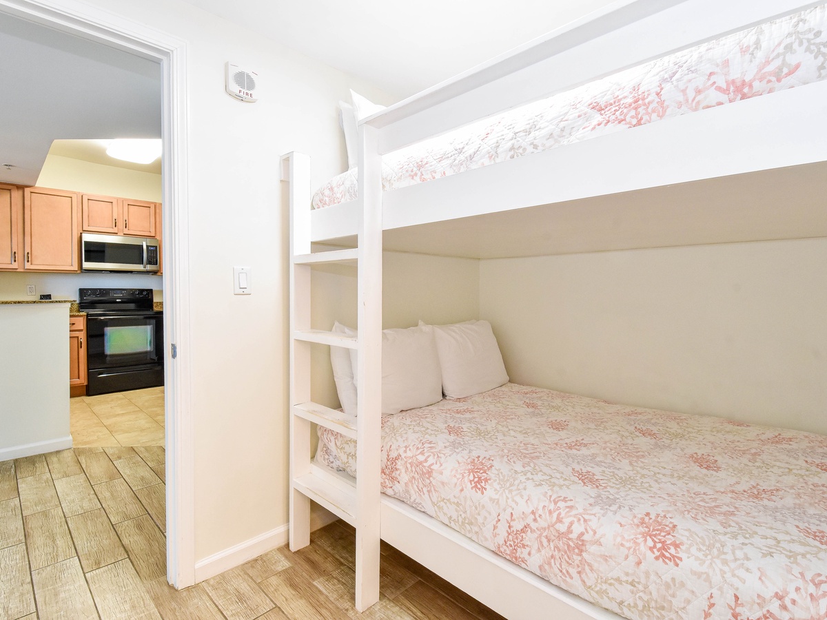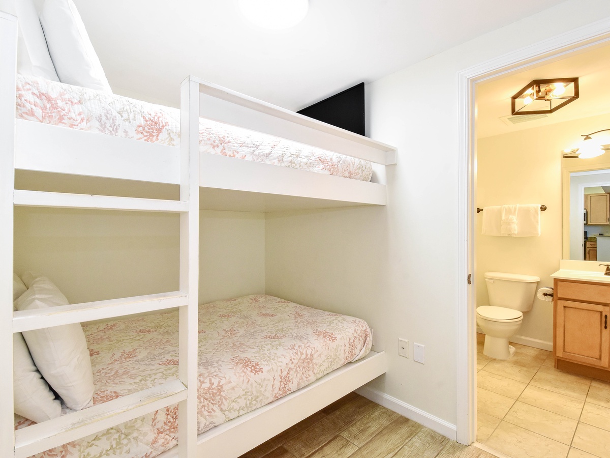 Discover The Palms of Destin 1511 Junior! This two-bedroom, two-bathroom condo is located on the fifth floor of The Palms of Destin Resort and offers the perfect blend of comfort, convenience, and resort-style living. With an open-concept living and dining area, a fully equipped kitchen, and an inviting balcony with resort and lagoon pool views, this vacation rental is ideal for families or couples looking for a fun and relaxing Destin getaway. In the living area, you’ll find cozy seating, a flat-screen TV, and a queen sleeper sofa for additional sleeping space. The primary bedroom features rustic wood accents, a king bed, flat-screen TV, and a private bathroom with a tub/shower combo, creating a perfect place to unwind after a day in the sun. The guest bedroom is furnished with a full-over-full bunk bed and an en suite bathroom with a walk-in shower, making it perfect for kids or extra guests. For added convenience, the condo is also equipped with a washer and dryer. Make unforgettable memories at The Palms of Destin 1511, your home away from home in the heart of Destin.