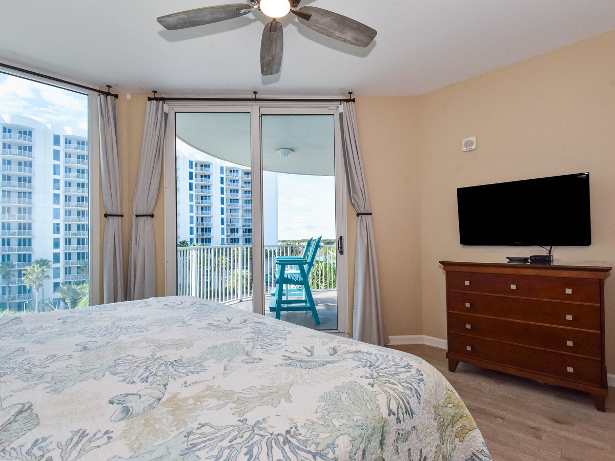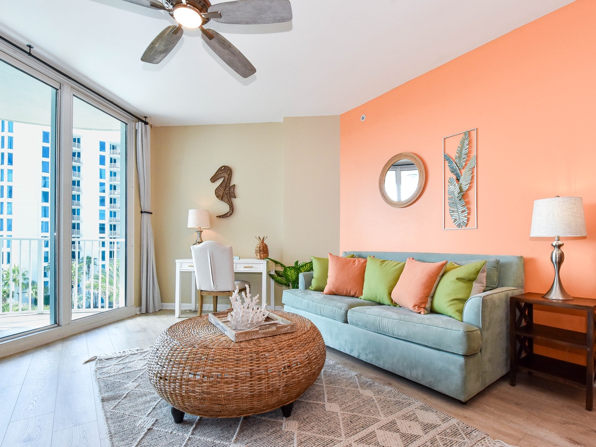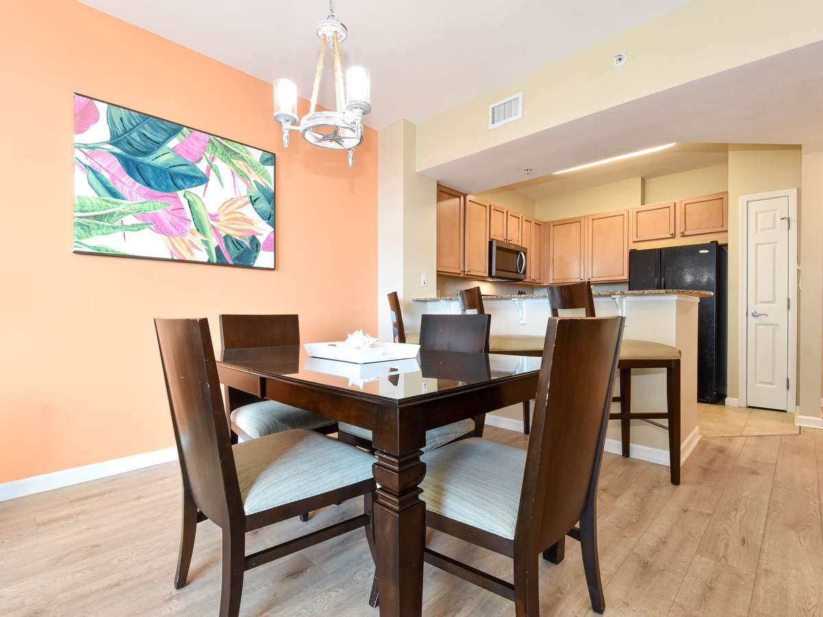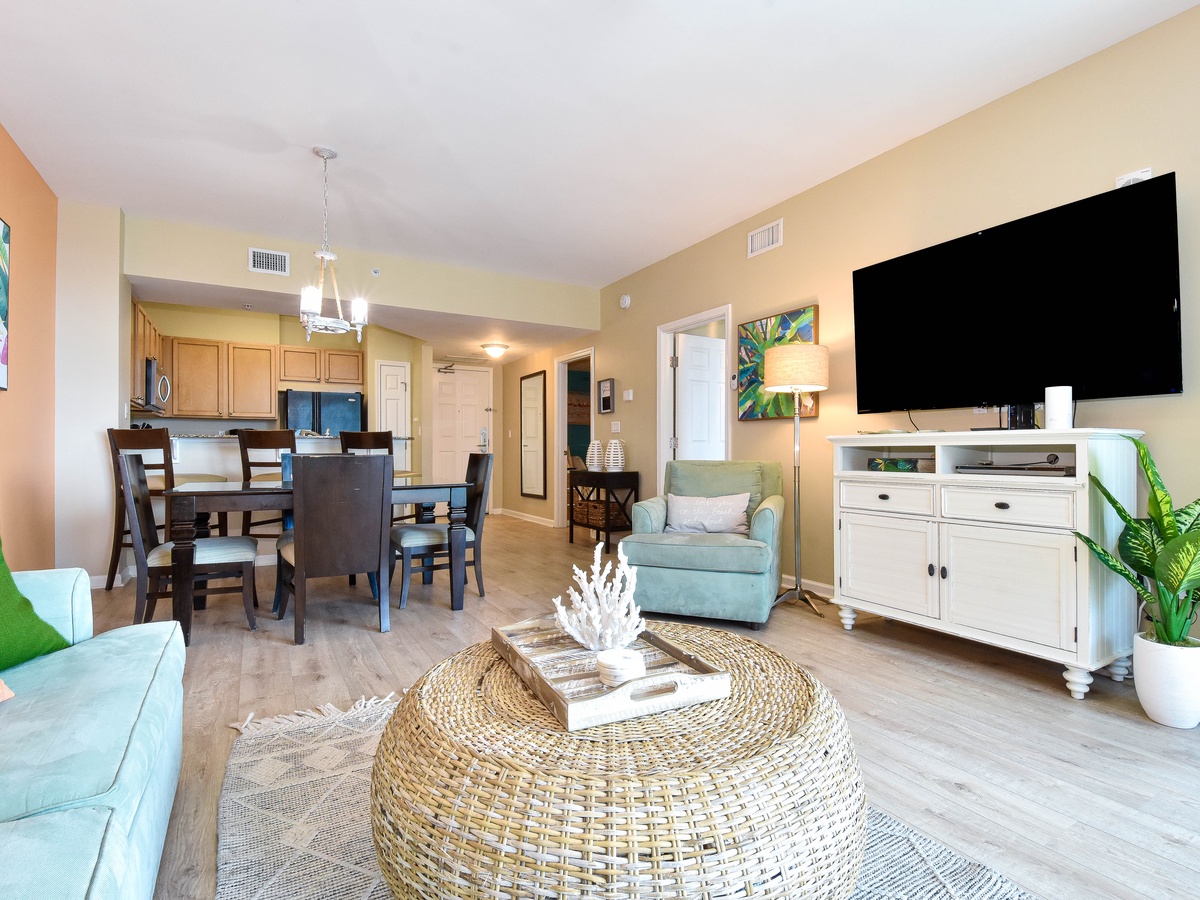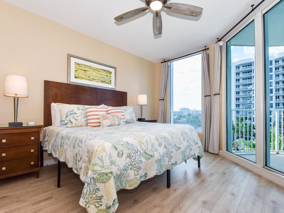 Experience The Palms of Destin 1513 Junior! This colorful, beachy two-bedroom, two-bathroom condo is located on the fifth floor of The Palms of Destin Resort and offers the perfect setting for a fun and relaxing getaway. Recently updated with a coastal chic design and hard flooring throughout, this vibrant vacation rental captures the essence of Destin’s laid-back charm. An open floor plan flows seamlessly from the fully equipped kitchen through the dining and living areas, leading out to a private balcony overlooking the resort’s stunning lagoon pool. The living area offers cozy seating, a flat-screen TV, and a queen sleeper sofa for extra guests. The primary bedroom features a king bed, private balcony access, and an ensuite bathroom with a tub/shower combo. The bonus bedroom is furnished with a full bed and has its own ensuite bathroom with a walk-in shower. For added convenience, the condo also includes a washer and dryer. Make your Destin vacation unforgettable at The Palms of Destin 1513, where bright, beachy style meets comfort and convenience.
