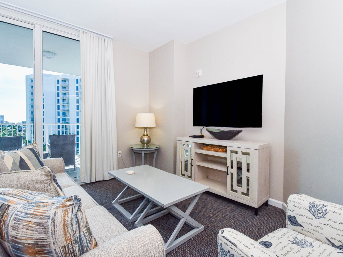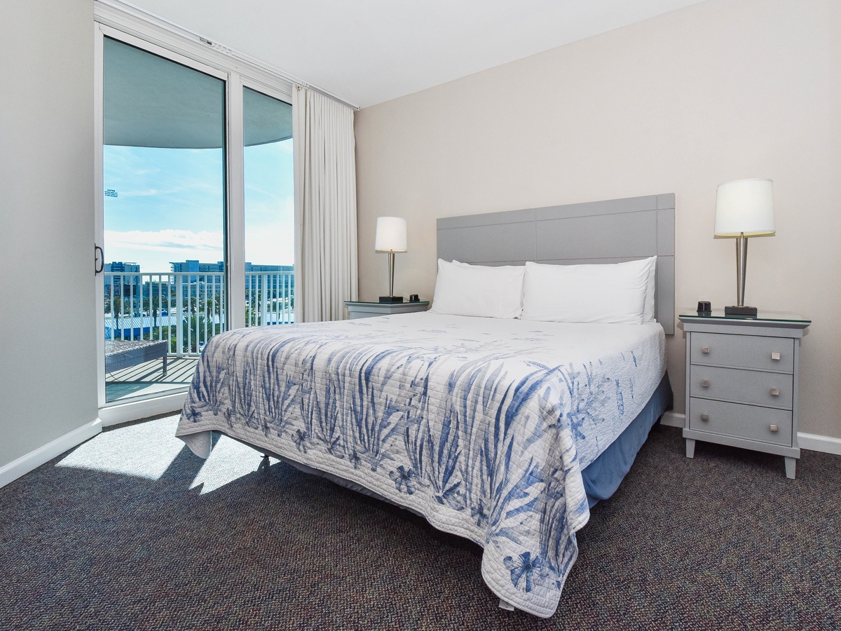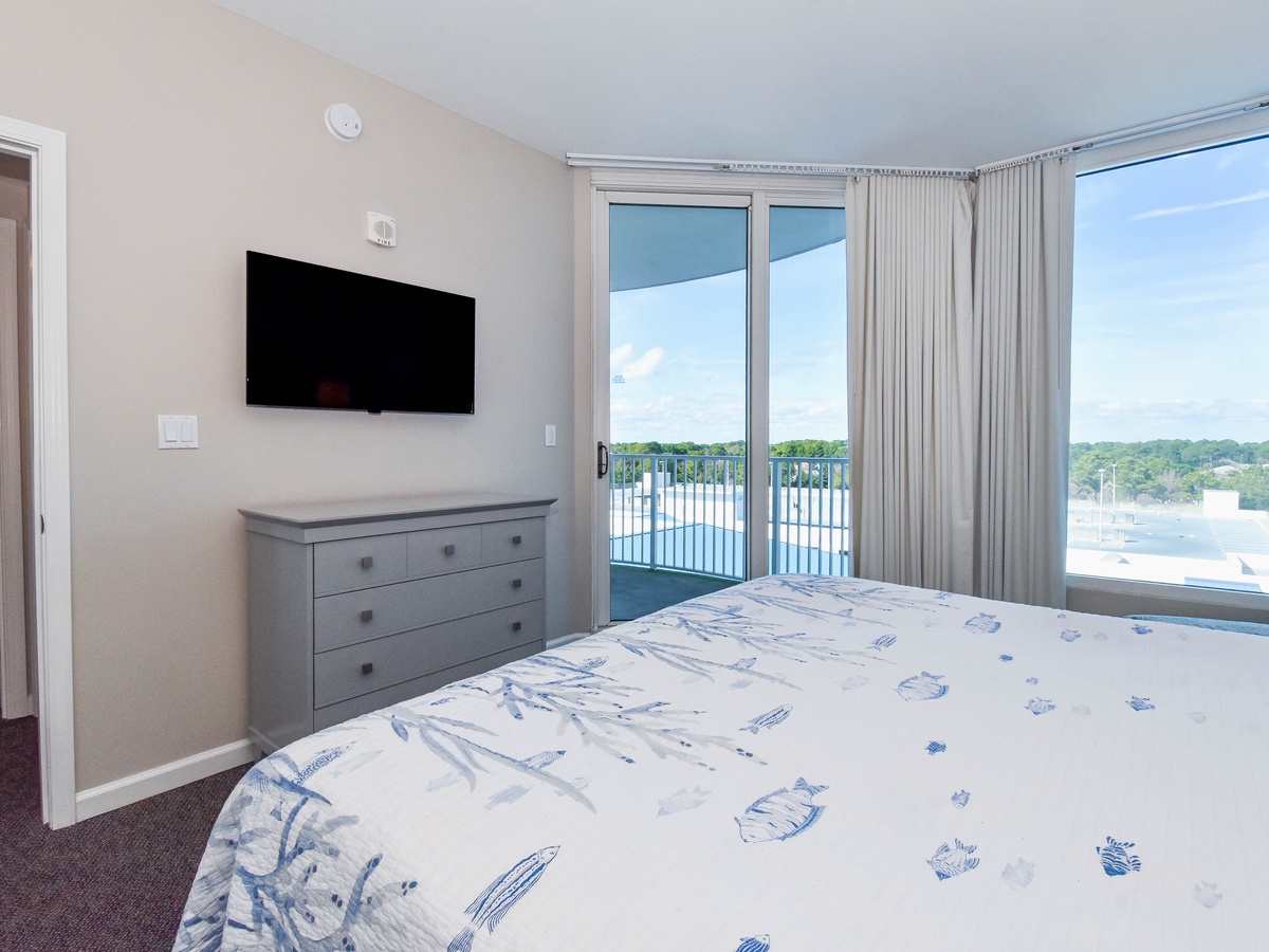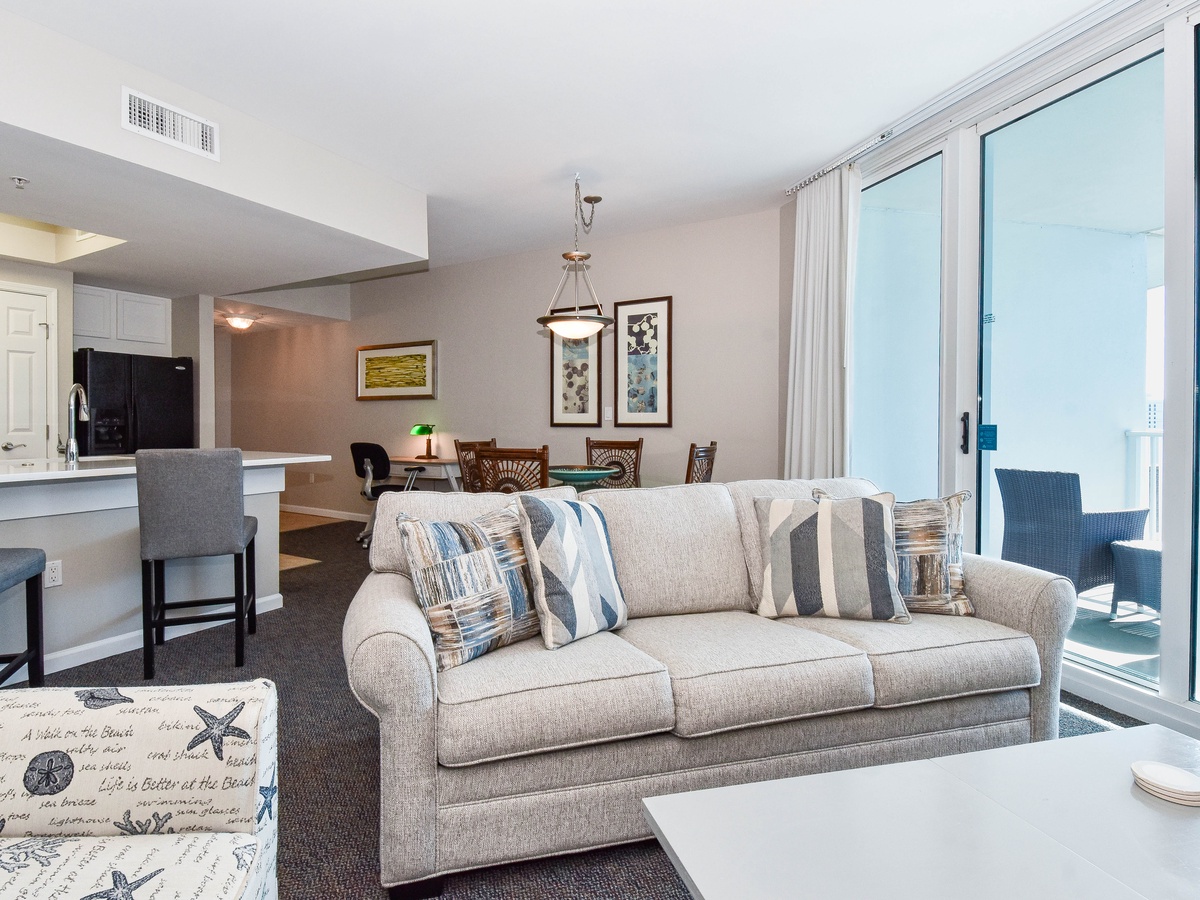 Welcome to The Palms of Destin 1601! This beautiful two-bedroom, two-bathroom condo is located on the sixth floor of The Palms of Destin Resort and offers stylish comfort with stunning views of the lagoon pool. The open-concept living and dining area creates a bright, welcoming space, while the private balcony is the perfect spot to relax and enjoy the resort atmosphere. In the living area, you’ll find cozy seating, a flat-screen TV, and a queen sleeper sofa for extra guests. A fully equipped kitchen features quartz countertops, a breakfast bar to seat two and a dining area to seat four. There is also a desk off the kitchen for when work follows you to the beach. The primary bedroom features a king bed, flat-screen TV, and private bathroom with a tub/shower combo for a restful retreat. The spacious guest bedroom also offers a king bed, a private balcony, and easy access to a nearby full bathroom with a walk-in shower. For added convenience there is an in unit washer and dryer and secure WIFI. Make your Destin escape unforgettable at The Palms of Destin 1601, where comfort and convenience come together in the heart of Destin.