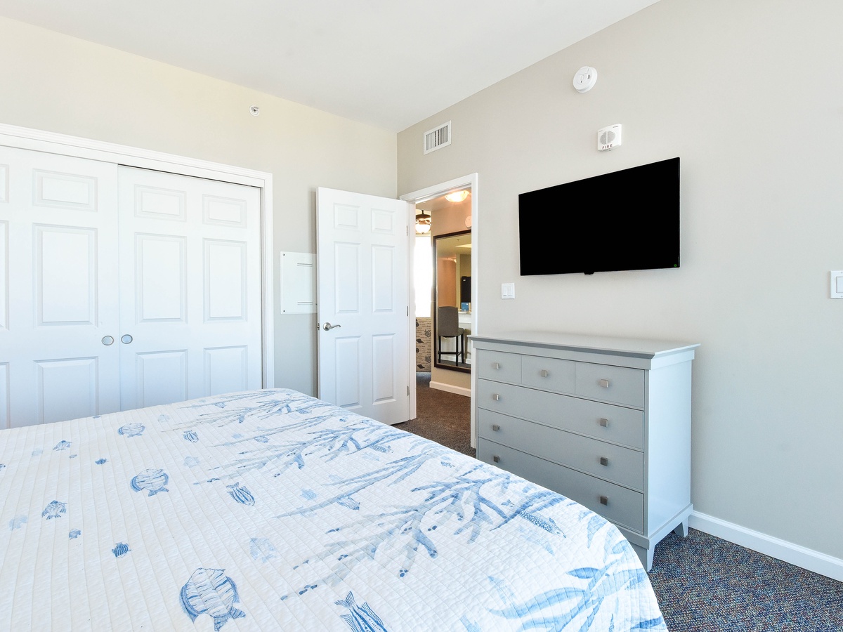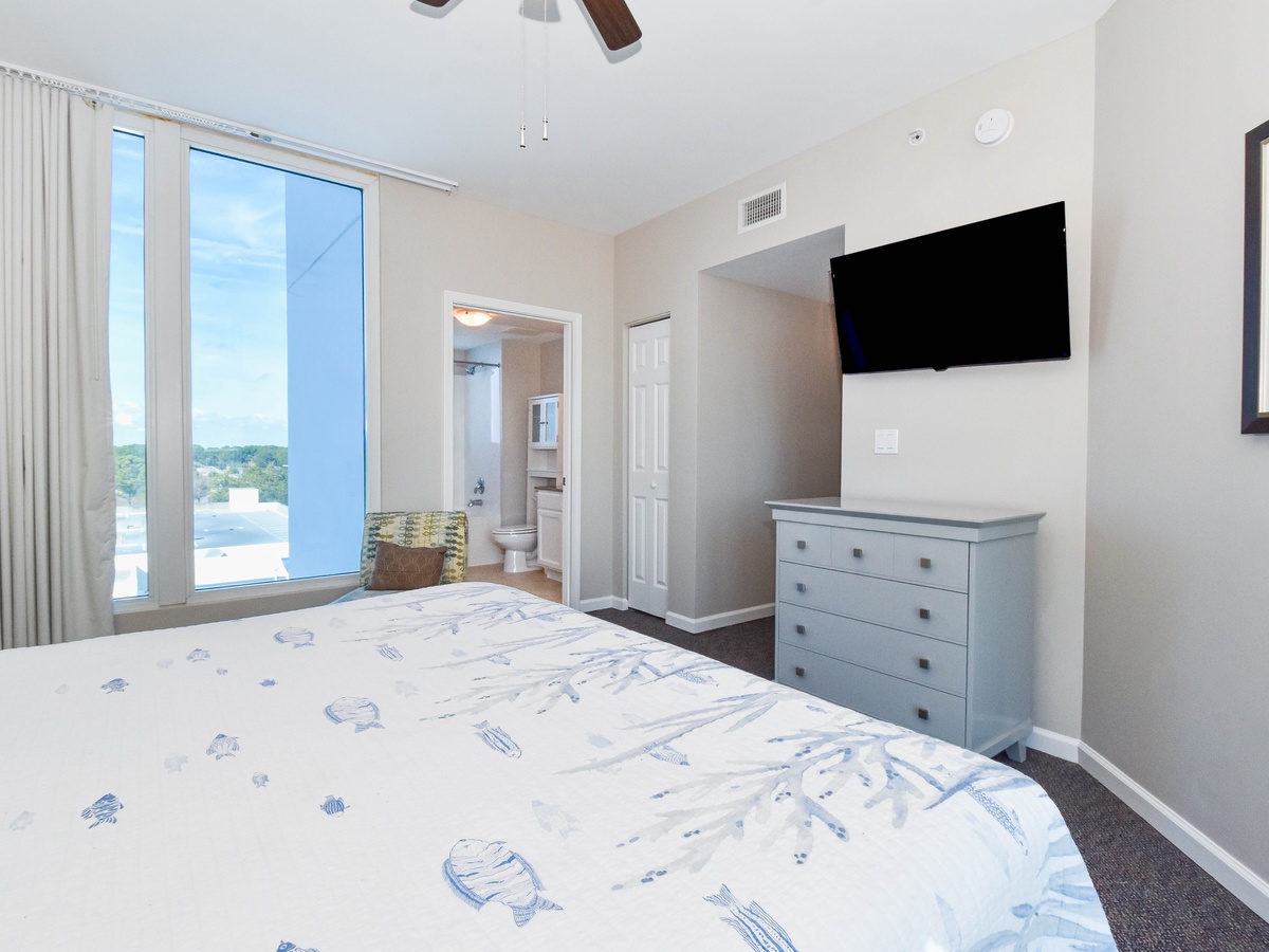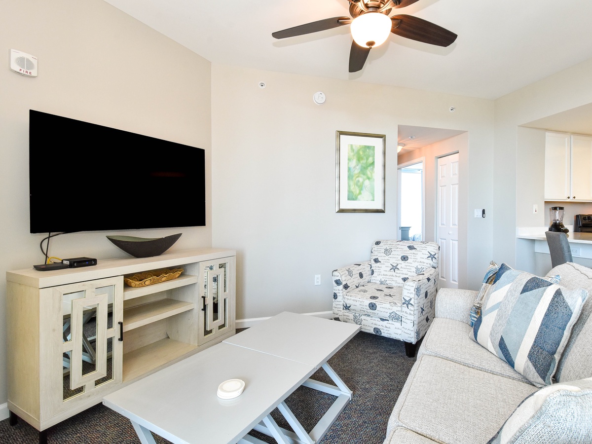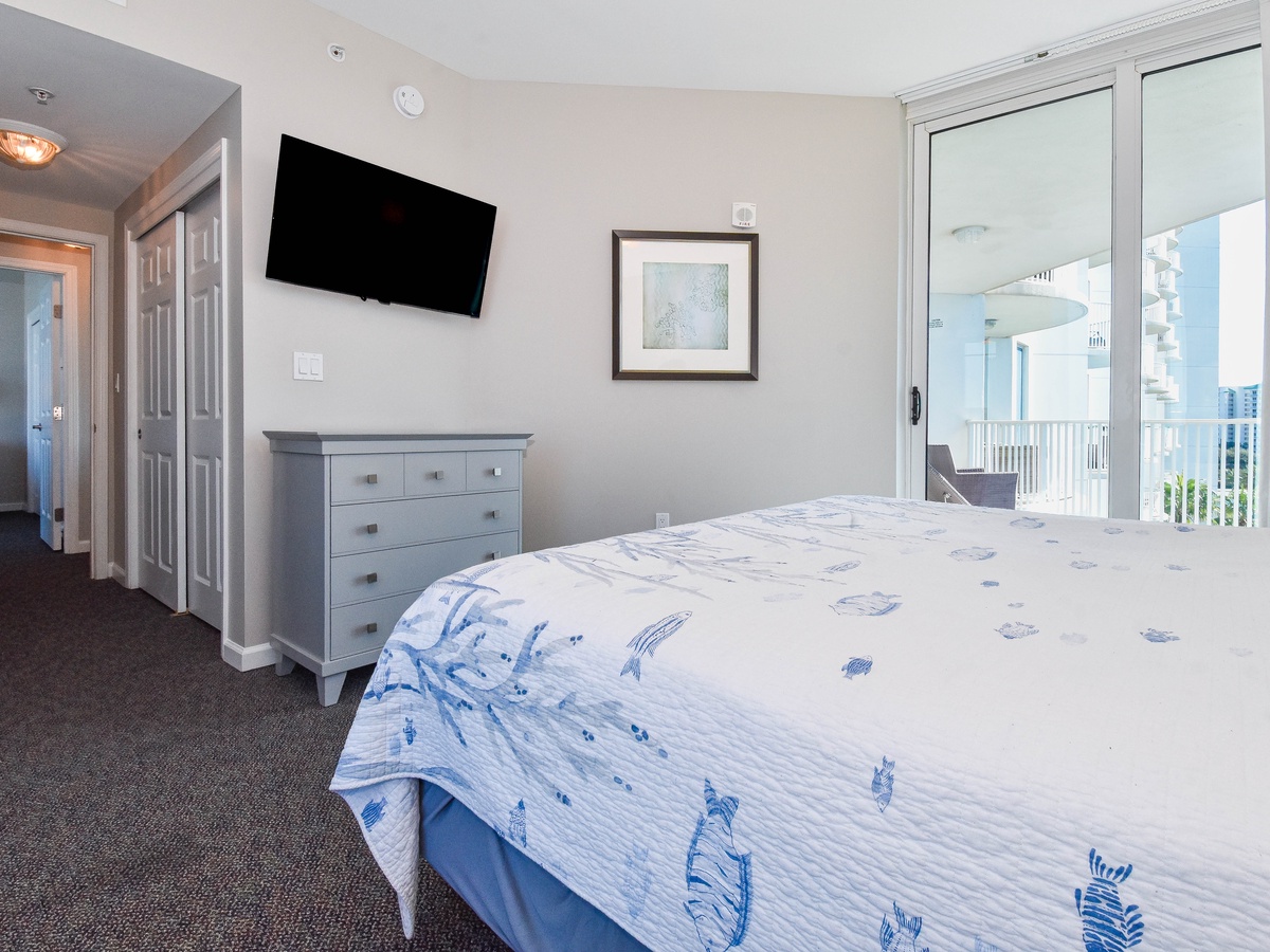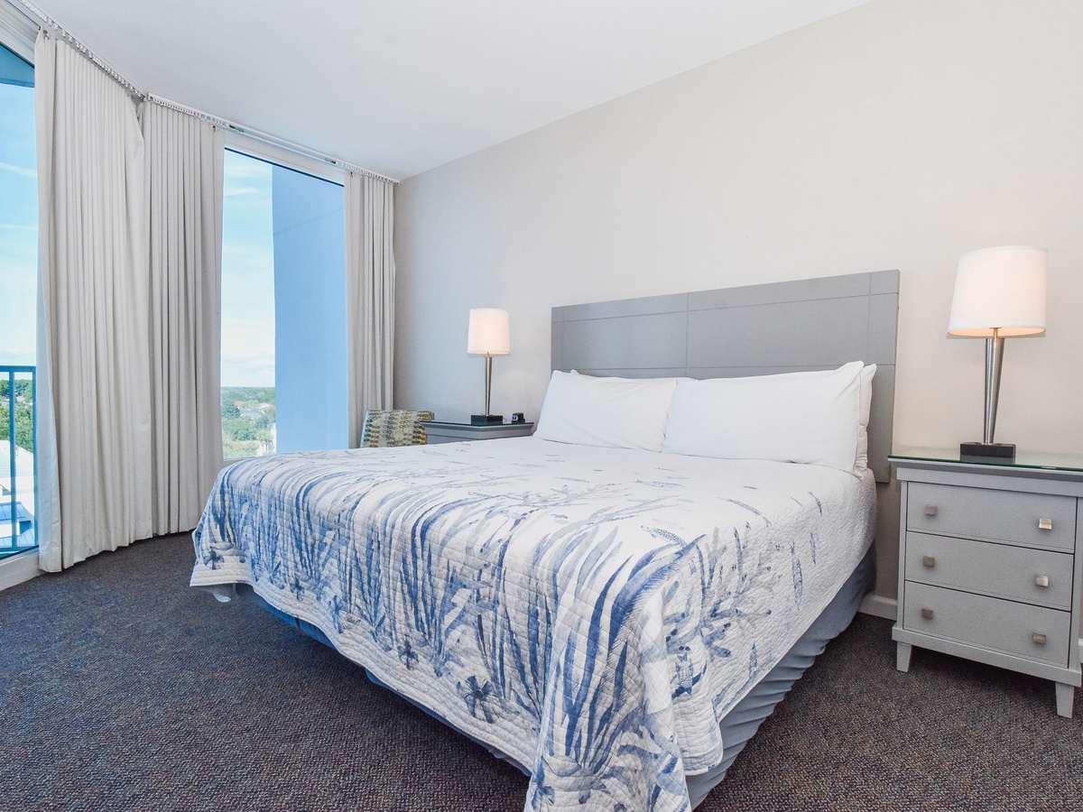 Welcome to The Palms of Destin 1601! This beautiful two-bedroom, two-bathroom condo is located on the sixth floor of The Palms of Destin Resort and offers stylish comfort with stunning views of the lagoon pool. The open-concept living and dining area creates a bright, welcoming space, while the private balcony is the perfect spot to relax and enjoy the resort atmosphere. In the living area, you’ll find cozy seating, a flat-screen TV, and a queen sleeper sofa for extra guests. A fully equipped kitchen features quartz countertops, a breakfast bar to seat two and a dining area to seat four. There is also a desk off the kitchen for when work follows you to the beach. The primary bedroom features a king bed, flat-screen TV, and private bathroom with a tub/shower combo for a restful retreat. The spacious guest bedroom also offers a king bed, a private balcony, and easy access to a nearby full bathroom with a walk-in shower. For added convenience there is an in unit washer and dryer and secure WIFI. Make your Destin escape unforgettable at The Palms of Destin 1601, where comfort and convenience come together in the heart of Destin.