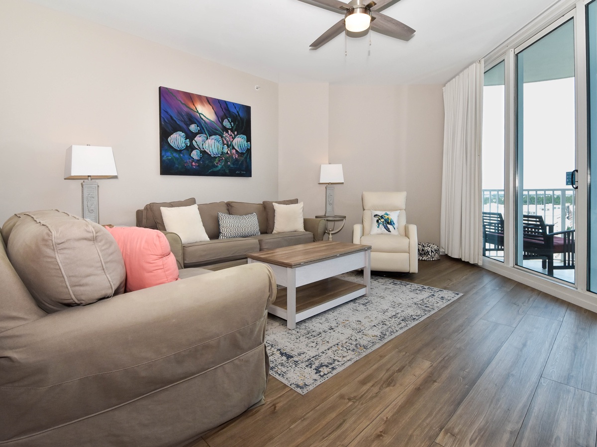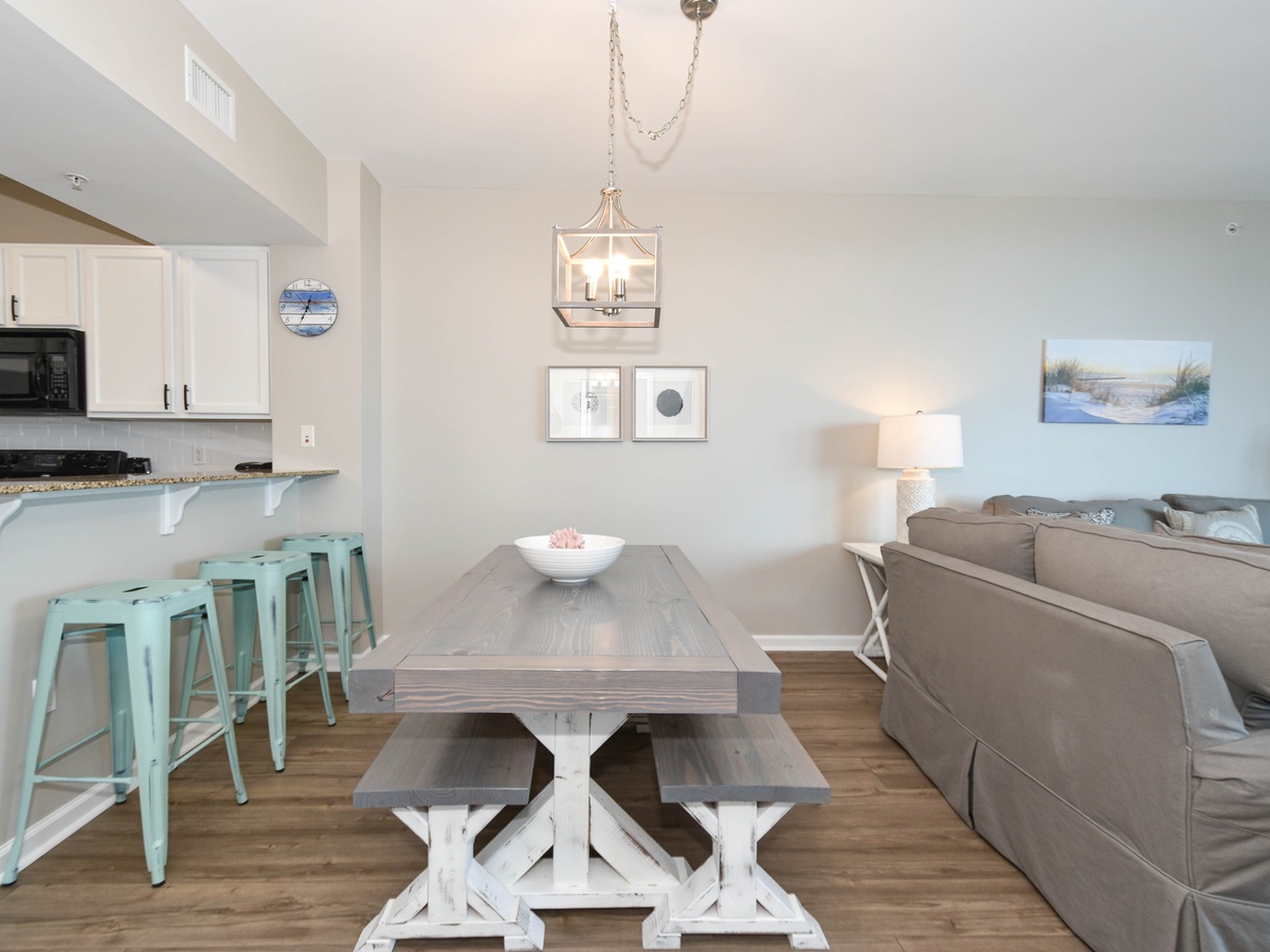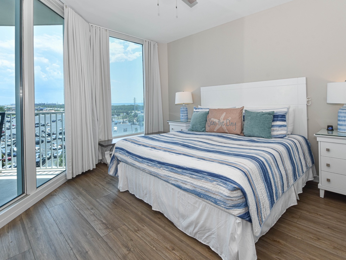 Welcome to The Palms of Destin 1610 Junior! Slip into vacation mode at this serene sixth-floor retreat, where relaxed coastal style and modern comfort set the tone for your perfect beach escape. With two bedrooms, two bathrooms, and plenty of space to accommodate up to six guests, this stylish condo has everything you need for an unforgettable Destin getaway. Floor-to-ceiling sliding glass doors lead out to your private balcony and offer glimpses of the sparkling Gulf, a perfect spot to sip your morning coffee or unwind at sunset with the warm sea breeze in the air. Inside, a fully equipped kitchen makes it easy to prepare everything from beach day snacks to fresh seafood dinners. The dining area seats four comfortably, with three additional barstools at the counter for casual bites or late-night treats. After a day of soaking up the sun at the beach or lounging by the resort’s iconic lagoon pool, relax in the spacious living room and watch a favorite movie on the flat-screen TV. Unwind in the primary bedroom featuring a plush king bed, flat-screen TV, balcony access, and an attached bathroom with a tub/shower combo. The guest bedroom offers a twin-over-full bunk bed, a TV, and is just steps away from a second bathroom with a walk-in shower. For added conveniences there is also a sleeper sofa in the living area, a washer and dryer, complimentary WiFi, and full access to The Palms of Destin’s resort-style amenities, everything designed to make your vacation seamless and stress-free. Soak up the sun, embrace the serene coastal vibes, and unwind in style—your dream Destin vacation starts here at The Palms of Destin 1610.