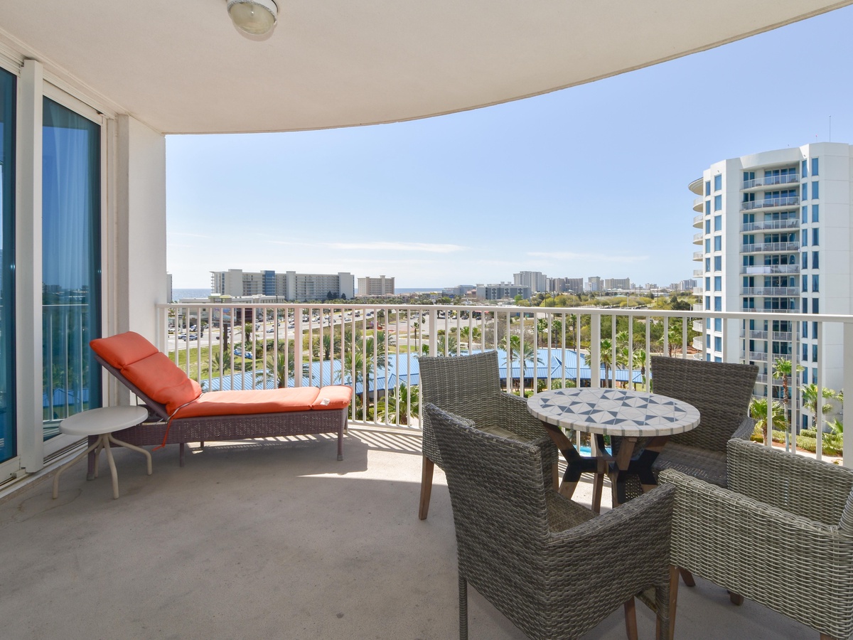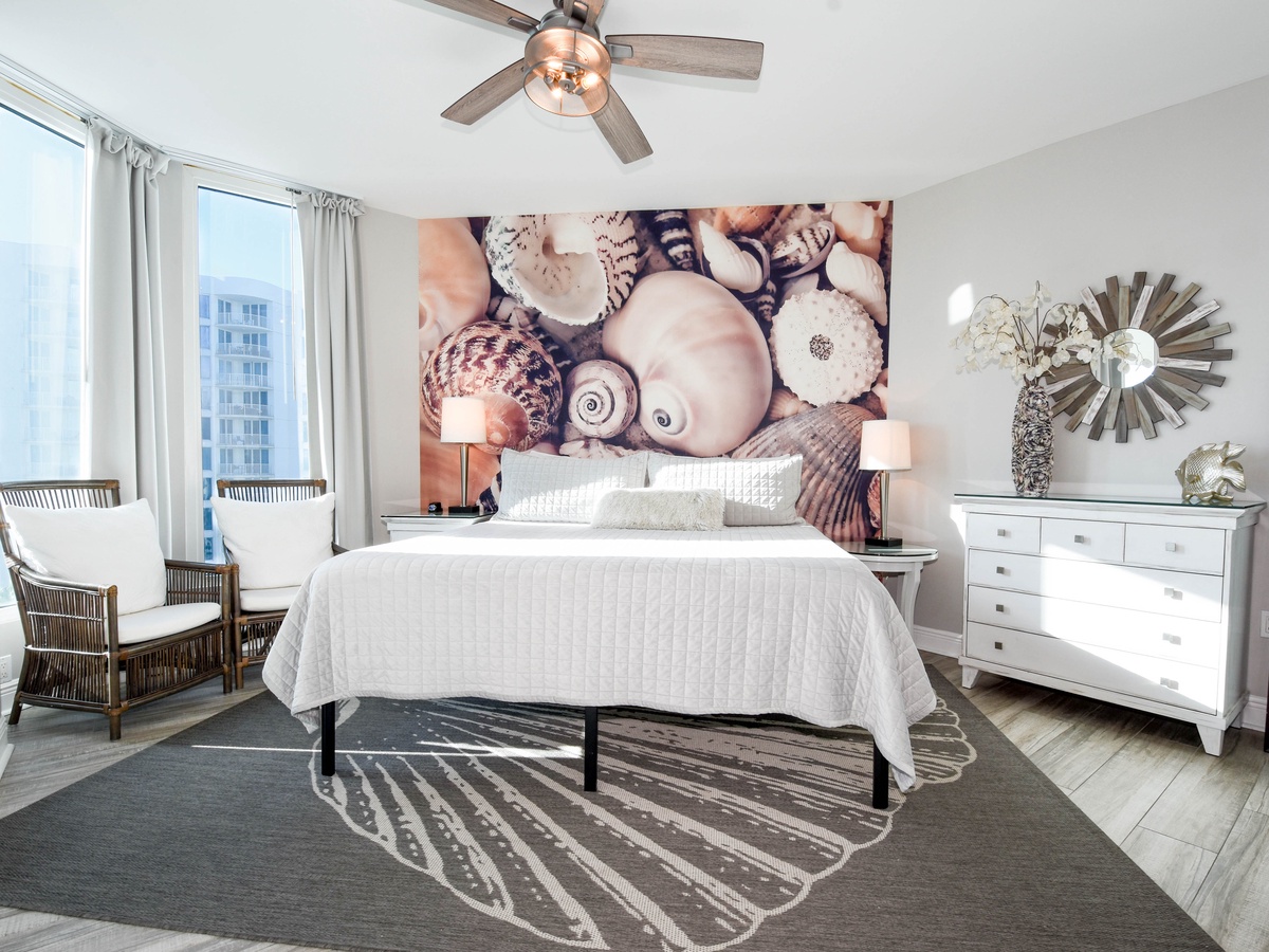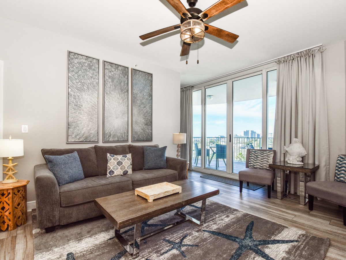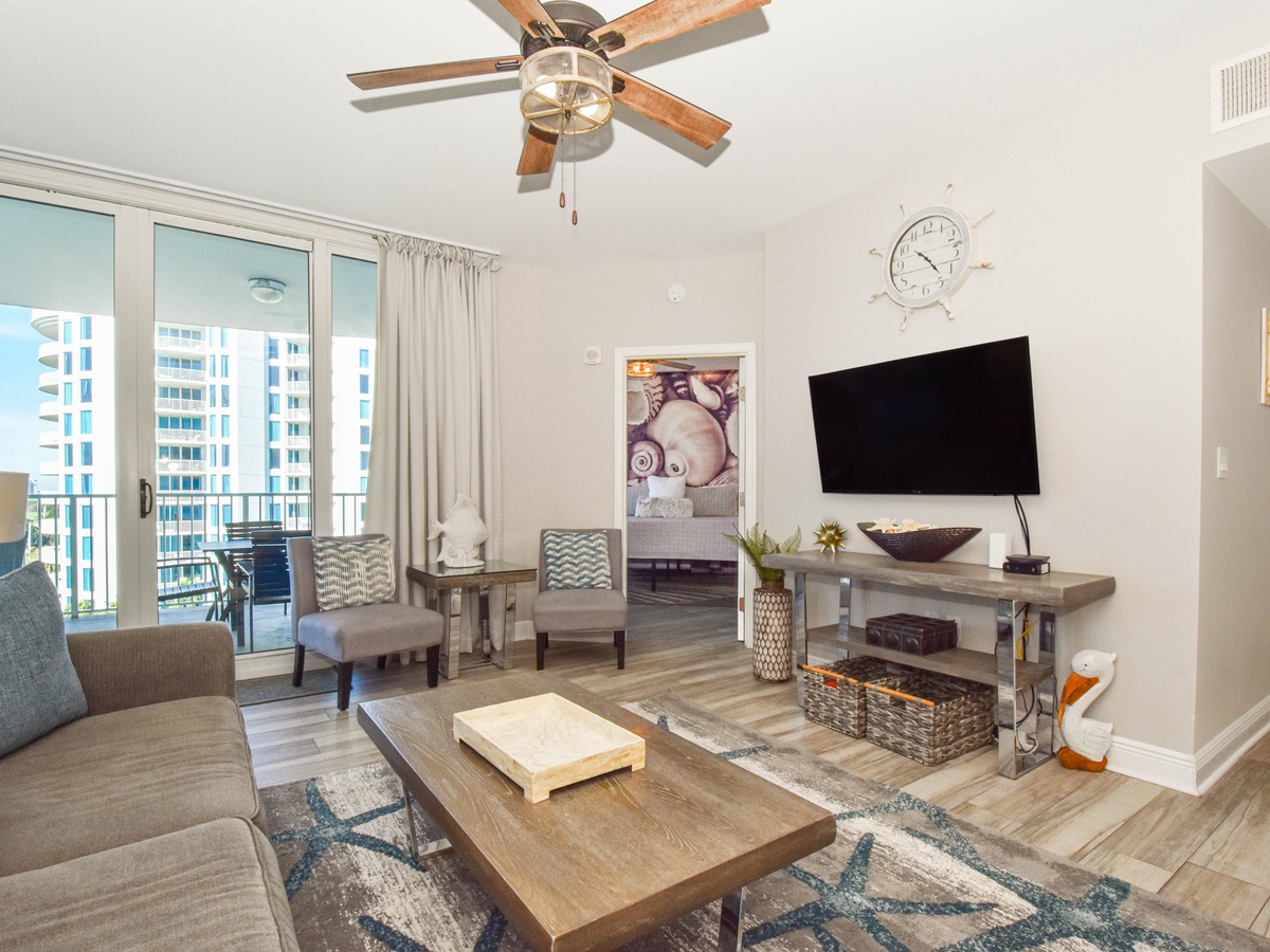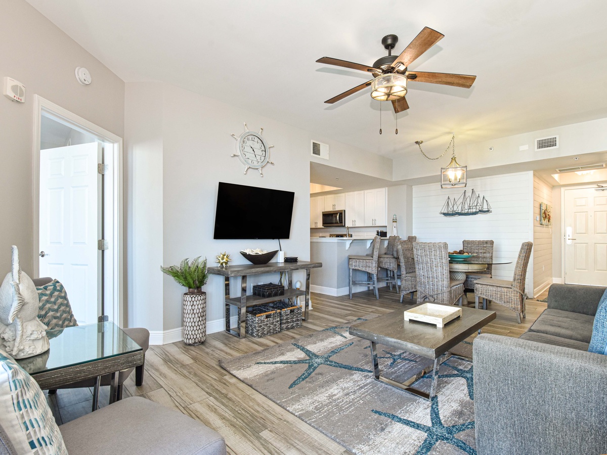 Welcome to The Palms of Destin 1715, your modern coastal escape in the heart of paradise. Perched on the seventh floor, this beautifully styled two-bedroom, two-bathroom condo comfortably sleeps up to six guests and delivers stunning views of the resort’s iconic lagoon-style pool. Step through the floor-to-ceiling sliding glass doors onto your private balcony and soak in the sunshine, swaying palms, and the vibrant energy that defines Destin. Inside, you’ll find a breezy, open-concept layout designed with coastal-modern flair. The living area invites you to kick back in comfort, with plush seating, a large flat-screen TV, and calming tones that set the scene for ultimate relaxation. The fully equipped kitchen features sleek quartz countertops, stainless steel appliances, and all the essentials for preparing anything from beach-day snacks to a full family dinner. Share meals and memories around the dining table for four, with extra seating for three at the breakfast bar. Retreat to the primary bedroom, where stylish tropical wallpaper adds a playful pop of personality. A king bed, flat-screen TV, private balcony access, and an attached bath with a walk-in shower completes this dreamy sanctuary. The guest bedroom also boasts a king bed, TV, balcony access, and is conveniently located next to the second bathroom, which features a tub/shower combo. For added conveniences there is also a sleeper sofa in the living room, a washer and dryer, complimentary WiFi, and full access to The Palms of Destin’s resort-style amenities, everything designed to make your vacation seamless and stress-free. Come soothe your soul at The Palms of Destin 1715!
