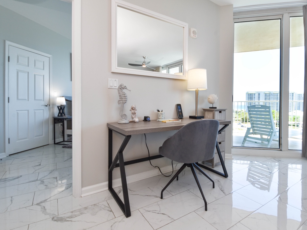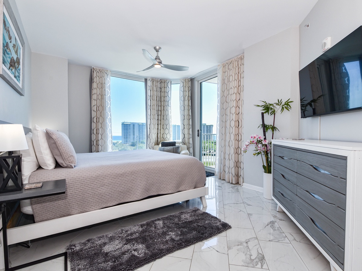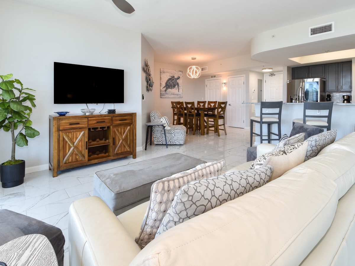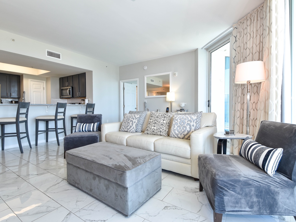 Welcome to The Palms of Destin 1717, an exquisite three-bedroom, three-bathroom condo where modern elegance meets coastal charm. This stunning retreat boasts a spacious private balcony offering breathtaking Gulf views, stretching from the serene Henderson State Park to the vibrant heart of Destin. Step inside to discover an open concept living space adorned with sleek marble flooring and stylish modern décor. The living area is designed for both relaxation and entertainment, featuring modern seating, a large flat-screen TV, and seamless balcony access. Need to catch up on work? A newly added workspace with a wireless printer makes remote work a breeze. Channel your inner chef in the fully equipped kitchen, complete with stainless steel appliances, a newly added coffee station, and all the essentials for preparing delicious meals. Gather around the dining table for six or enjoy casual bites at the breakfast bar with seating for three. The luxurious primary suite is a true sanctuary, featuring a king-size adjustable bed, flat-screen TV, private balcony access, and an ensuite bathroom with a tub/shower combo. The first guest bedroom offers a king-size bed, while the second guest bedroom features a queen bed—both providing comfort and tranquility. These rooms share a nearby full bathroom with a convenient shower/tub combination. Throughout the condo, you’ll find newly mounted 55-inch smart TVs in each bedroom and the living room, perfect for cozy movie nights. Stay connected with secure high-speed WiFi and enjoy the added convenience of an in-unit washer and dryer. Whether you're seeking relaxation, adventure, or a bit of both, The Palms of Destin 1717 offers the perfect blend of luxury, comfort, and coastal beauty. Book your stay today and create unforgettable memories by the Gulf!