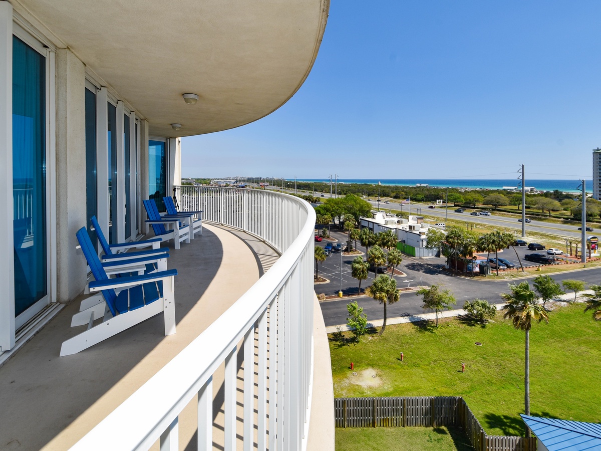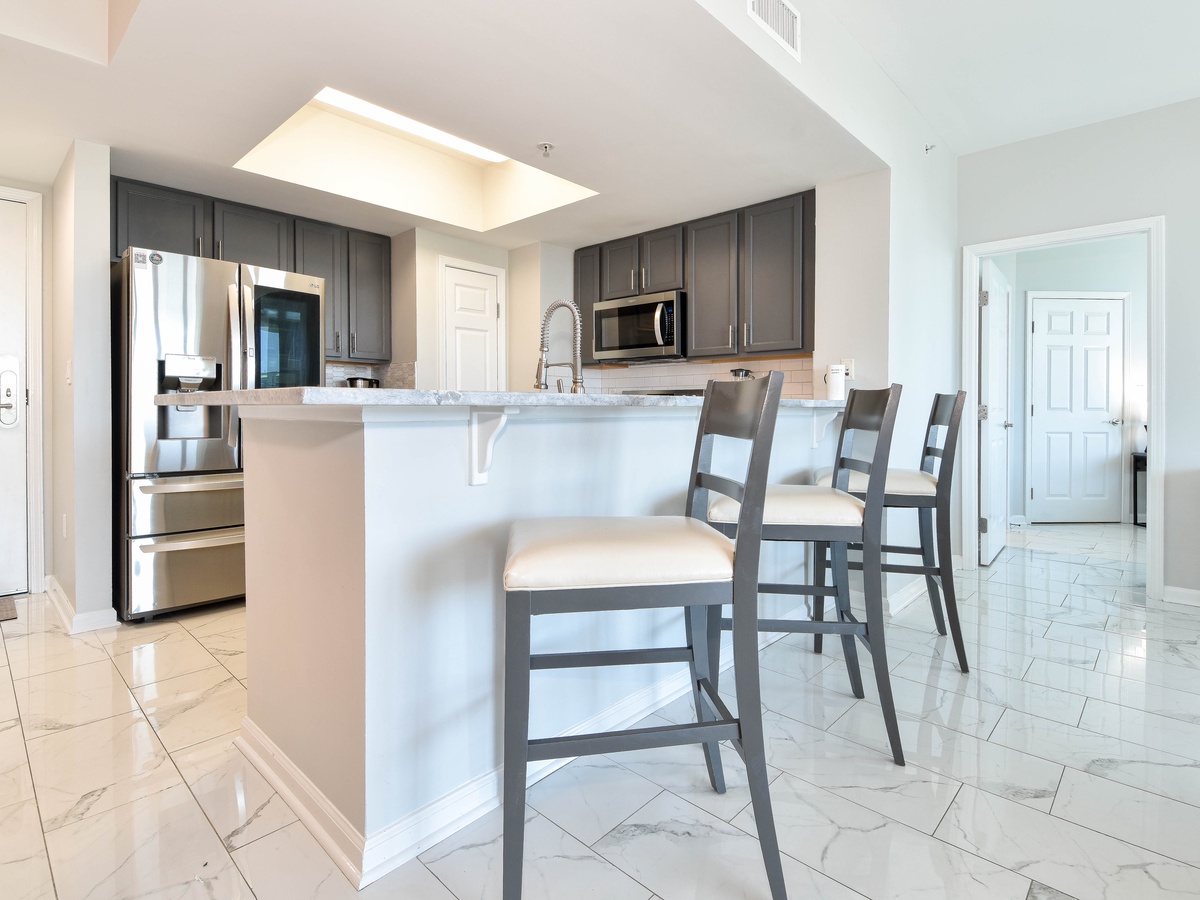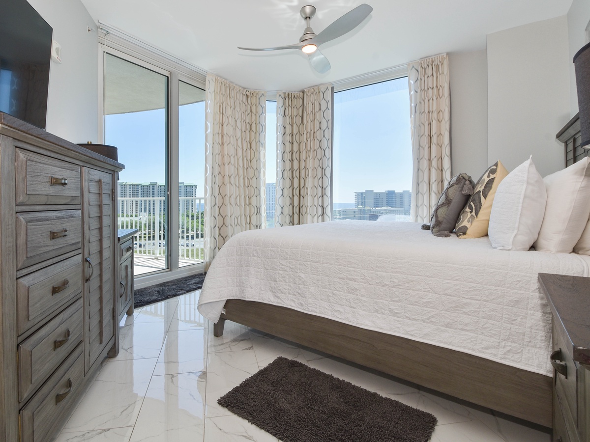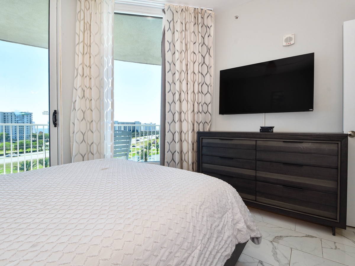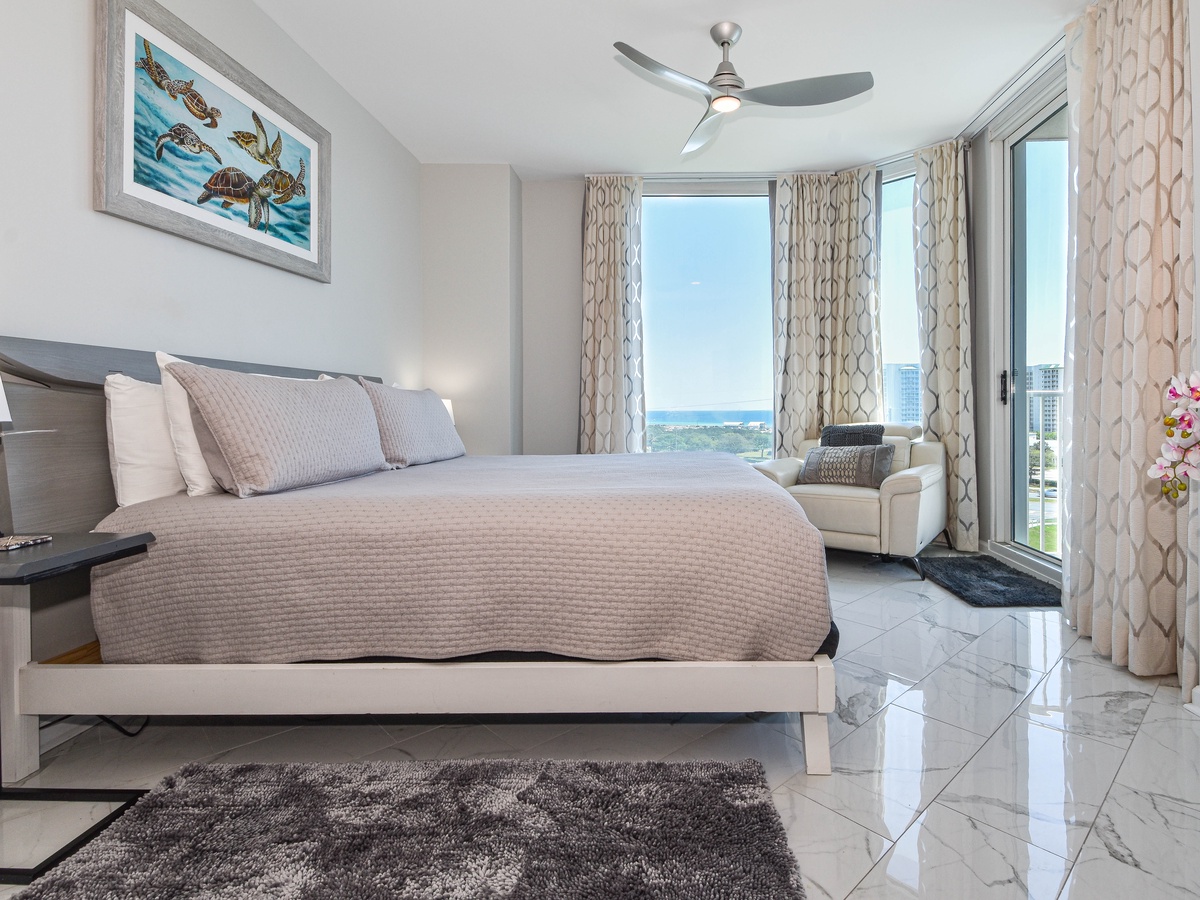 Welcome to The Palms of Destin 1717, an exquisite three-bedroom, three-bathroom condo where modern elegance meets coastal charm. This stunning retreat boasts a spacious private balcony offering breathtaking Gulf views, stretching from the serene Henderson State Park to the vibrant heart of Destin. Step inside to discover an open concept living space adorned with sleek marble flooring and stylish modern décor. The living area is designed for both relaxation and entertainment, featuring modern seating, a large flat-screen TV, and seamless balcony access. Need to catch up on work? A newly added workspace with a wireless printer makes remote work a breeze. Channel your inner chef in the fully equipped kitchen, complete with stainless steel appliances, a newly added coffee station, and all the essentials for preparing delicious meals. Gather around the dining table for six or enjoy casual bites at the breakfast bar with seating for three. The luxurious primary suite is a true sanctuary, featuring a king-size adjustable bed, flat-screen TV, private balcony access, and an ensuite bathroom with a tub/shower combo. The first guest bedroom offers a king-size bed, while the second guest bedroom features a queen bed—both providing comfort and tranquility. These rooms share a nearby full bathroom with a convenient shower/tub combination. Throughout the condo, you’ll find newly mounted 55-inch smart TVs in each bedroom and the living room, perfect for cozy movie nights. Stay connected with secure high-speed WiFi and enjoy the added convenience of an in-unit washer and dryer. Whether you're seeking relaxation, adventure, or a bit of both, The Palms of Destin 1717 offers the perfect blend of luxury, comfort, and coastal beauty. Book your stay today and create unforgettable memories by the Gulf!