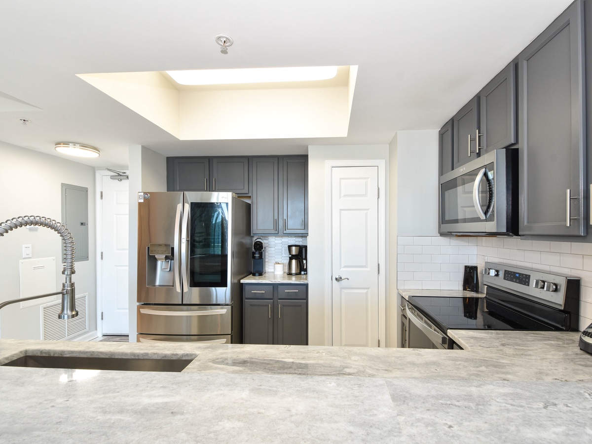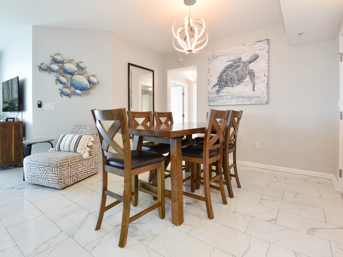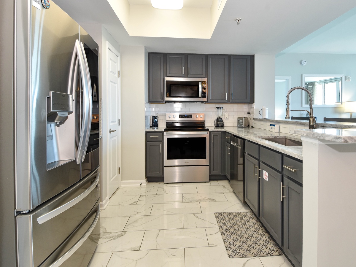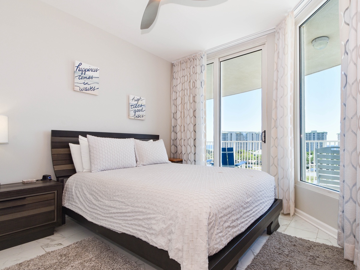 Welcome to The Palms of Destin 1717, an exquisite three-bedroom, three-bathroom condo where modern elegance meets coastal charm. This stunning retreat boasts a spacious private balcony offering breathtaking Gulf views, stretching from the serene Henderson State Park to the vibrant heart of Destin. Step inside to discover an open concept living space adorned with sleek marble flooring and stylish modern décor. The living area is designed for both relaxation and entertainment, featuring modern seating, a large flat-screen TV, and seamless balcony access. Need to catch up on work? A newly added workspace with a wireless printer makes remote work a breeze. Channel your inner chef in the fully equipped kitchen, complete with stainless steel appliances, a newly added coffee station, and all the essentials for preparing delicious meals. Gather around the dining table for six or enjoy casual bites at the breakfast bar with seating for three. The luxurious primary suite is a true sanctuary, featuring a king-size adjustable bed, flat-screen TV, private balcony access, and an ensuite bathroom with a tub/shower combo. The first guest bedroom offers a king-size bed, while the second guest bedroom features a queen bed—both providing comfort and tranquility. These rooms share a nearby full bathroom with a convenient shower/tub combination. Throughout the condo, you’ll find newly mounted 55-inch smart TVs in each bedroom and the living room, perfect for cozy movie nights. Stay connected with secure high-speed WiFi and enjoy the added convenience of an in-unit washer and dryer. Whether you're seeking relaxation, adventure, or a bit of both, The Palms of Destin 1717 offers the perfect blend of luxury, comfort, and coastal beauty. Book your stay today and create unforgettable memories by the Gulf!
