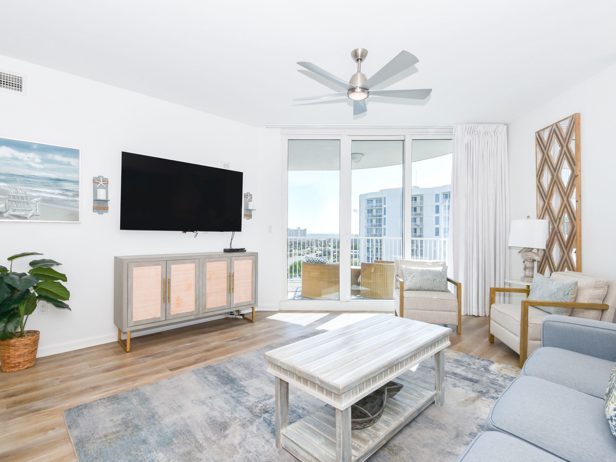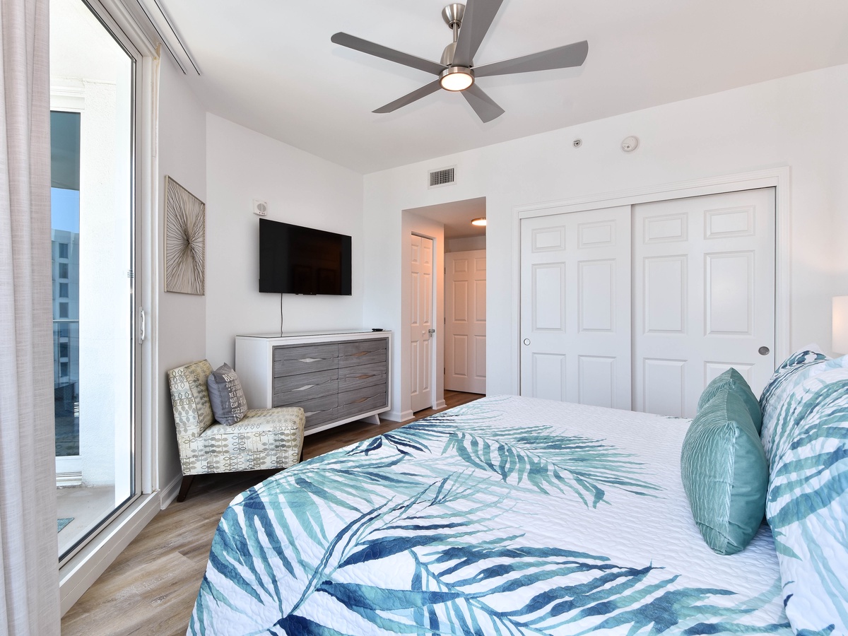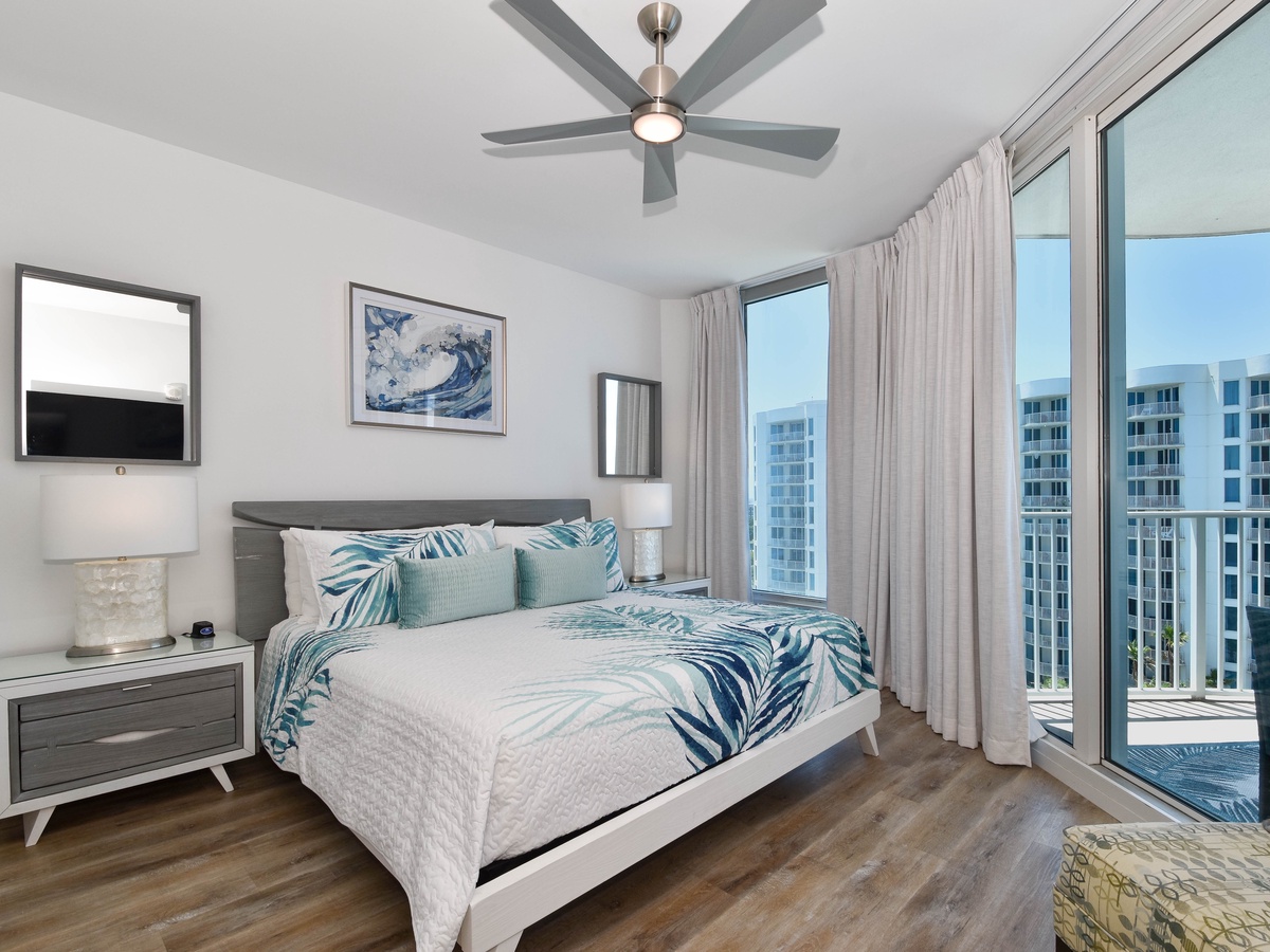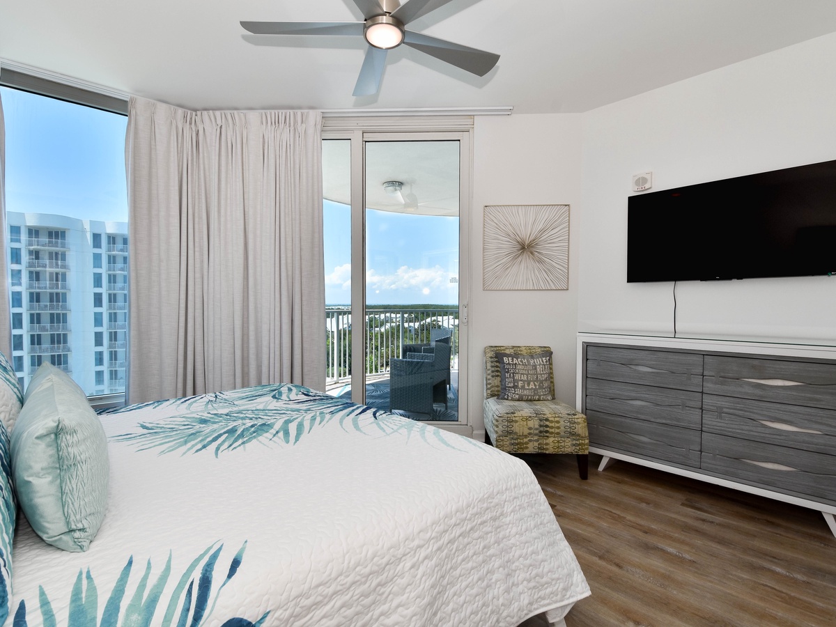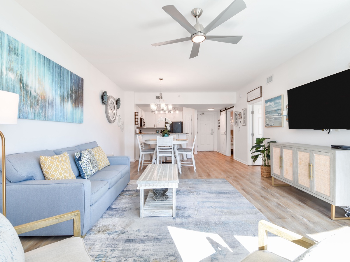 Welcome to The Palms of Destin 1905 Junior! Find calm in this two-bedroom, two-bathroom condo on the ninth floor and that comfortably sleeps up to six guests. Floor to ceiling sliding glass doors open onto your private balcony overlooking the fabulous lagoon pool that The Palms of Destin is known for. A fully equipped kitchen has everything needed to prepare a delicious meal and then gather around the dining table that seats four with additional seating at the bar for three while reflecting on the day’s best moments. The spa-like feel of the spacious living room will have you at ease instantly while watching a favorite movie after a full day in the sun. Unwind in the primary bedroom featuring a king bed, flat-screen TV, balcony access, and an attached bathroom with a tub/shower combo. The guest bedroom offers a full-over-full bunk bed, a TV, and is just steps away from a second bathroom with a walk-in shower. For added conveniences there is also a sleeper sofa in the living room, a washer and dryer, complimentary WiFi, and full access to The Palms of Destin’s resort-style amenities, everything designed to make your vacation seamless and stress-free. Come soothe your soul at The Palms of Destin 1905!