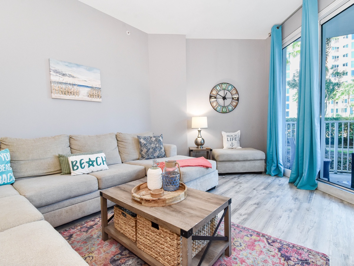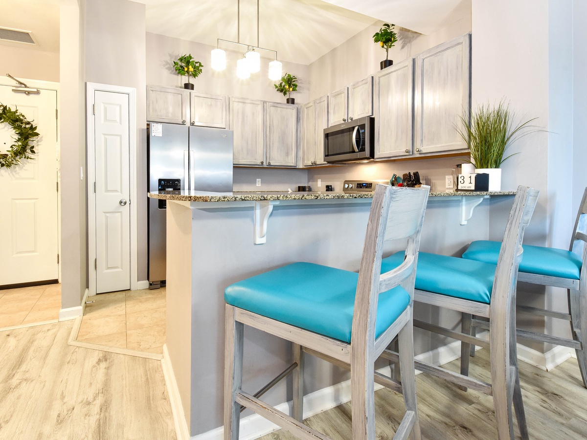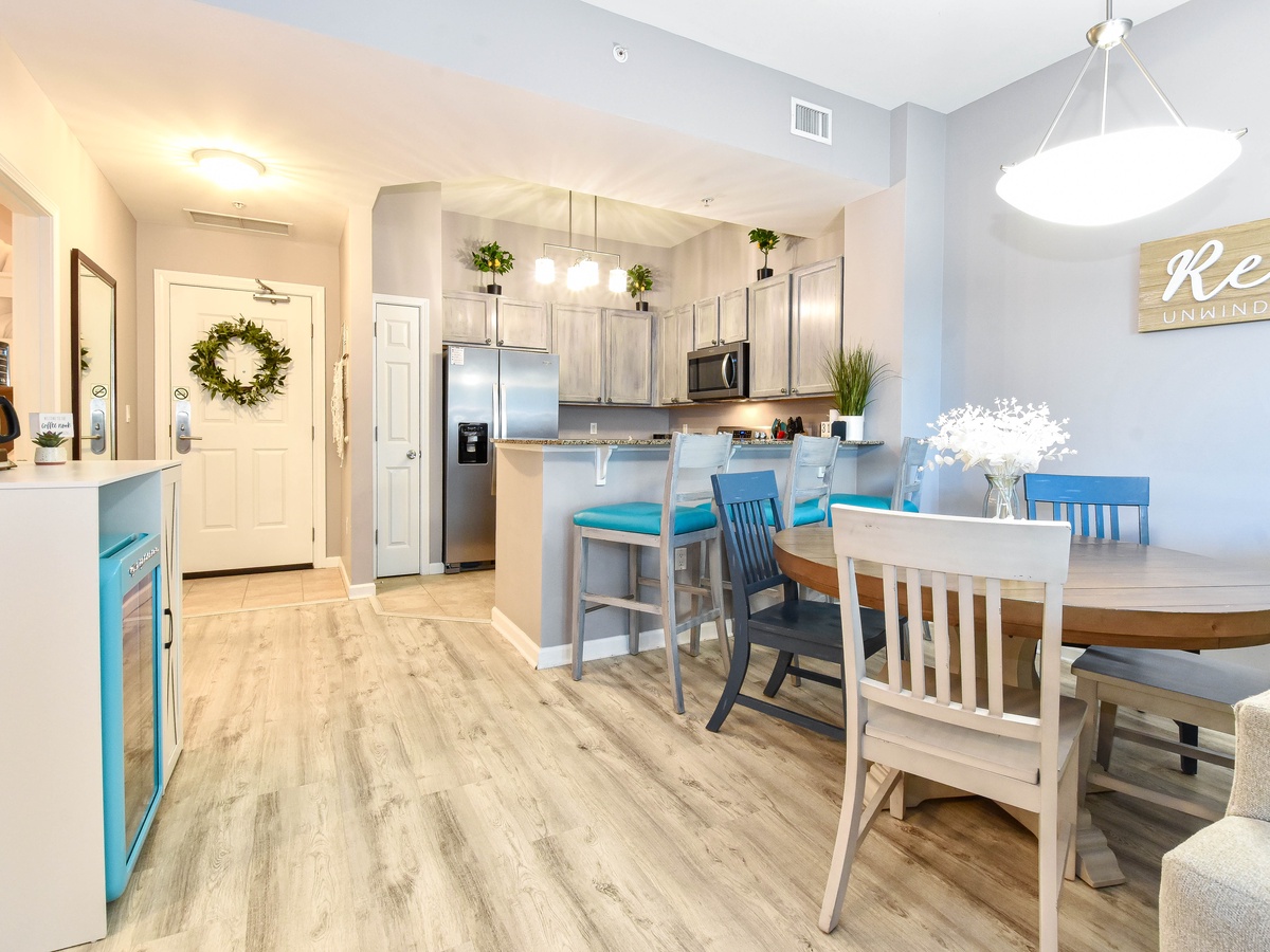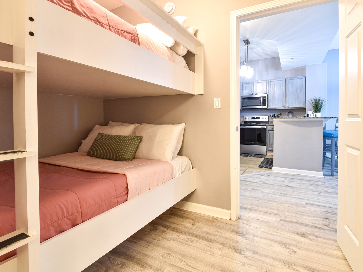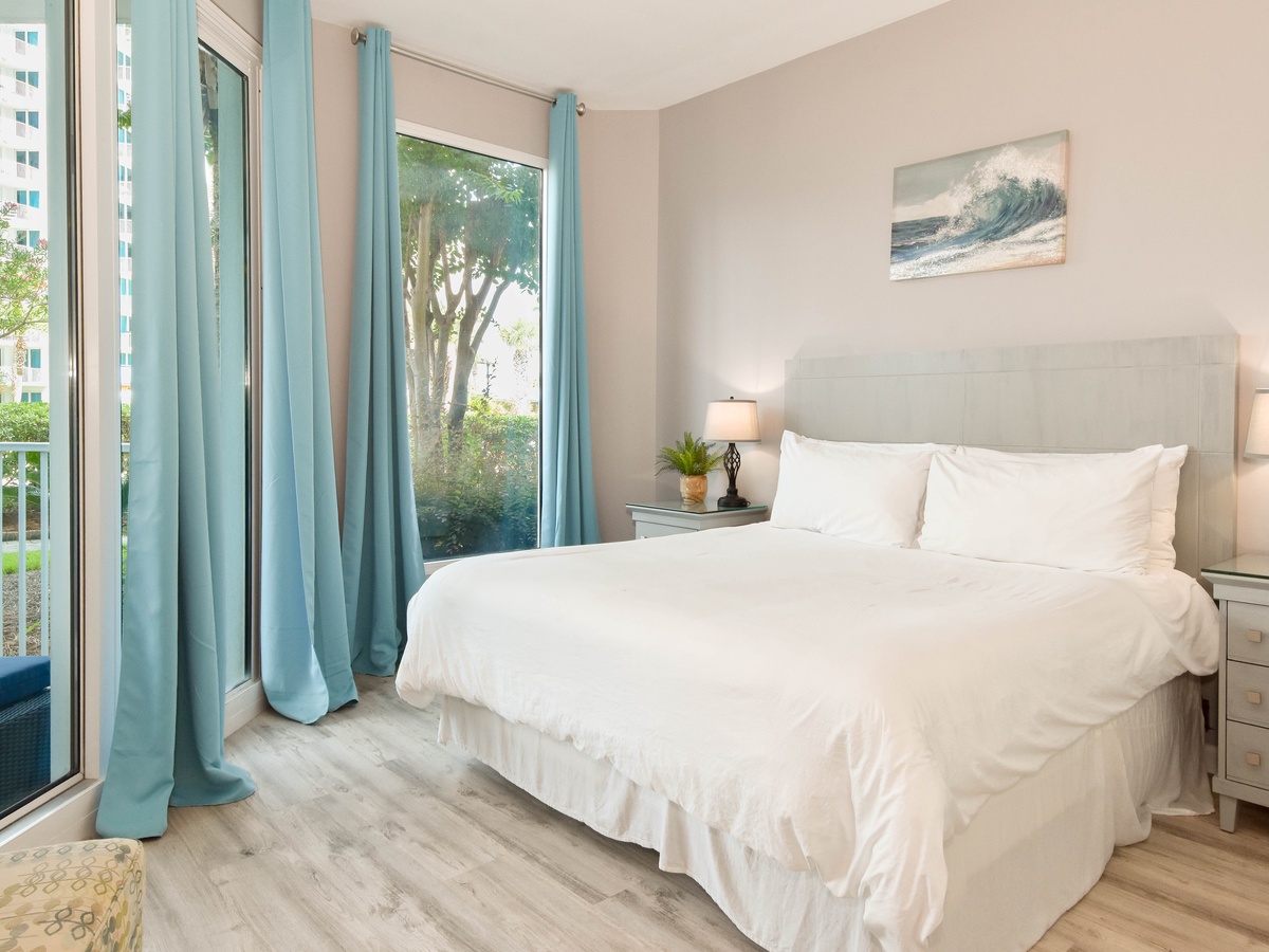 Welcome to The Palms of Destin 2107 Junior, your coastal retreat in the heart of Destin, Florida. This charming ground-floor condo offers the ultimate convenience for families, especially those with little ones, thanks to easy access without the need for an elevator. Just a short stroll from the resort’s famous lagoon pool and tropical grounds, you’ll love the blend of comfort, style, and location. Step inside this beautifully decorated two-bedroom, two-bathroom Destin vacation rental, where coastal charm meets modern amenities. The open-concept living and dining area is perfect for gathering after a day at the beach, with flat-screen TVs and a private patio for relaxing in the fresh salt air. The fully equipped kitchen features ample counter space and a breakfast bar, ideal for preparing home-cooked meals or quick snacks before heading out to the Emerald Coast's sugar-white beaches. Start your day right with the convenient coffee bar just off the kitchen, complete with a mini fridge, so your favorite creamer and cold brews are always within reach. Unwind in the spacious primary suite, complete with a king bed, private patio access, and an attached bathroom with a tub/shower combo. The guest bedroom offers a full-over-full bunk bed and is conveniently located next to the second bathroom with a walk-in shower. Additional perks include an in-unit washer and dryer, high-speed Wi-Fi, and full access to The Palms of Destin Resort’s premier amenities. Whether you're planning a family beach trip or a laid-back getaway, The Palms of Destin 2107 Junior is your perfect home away from home.