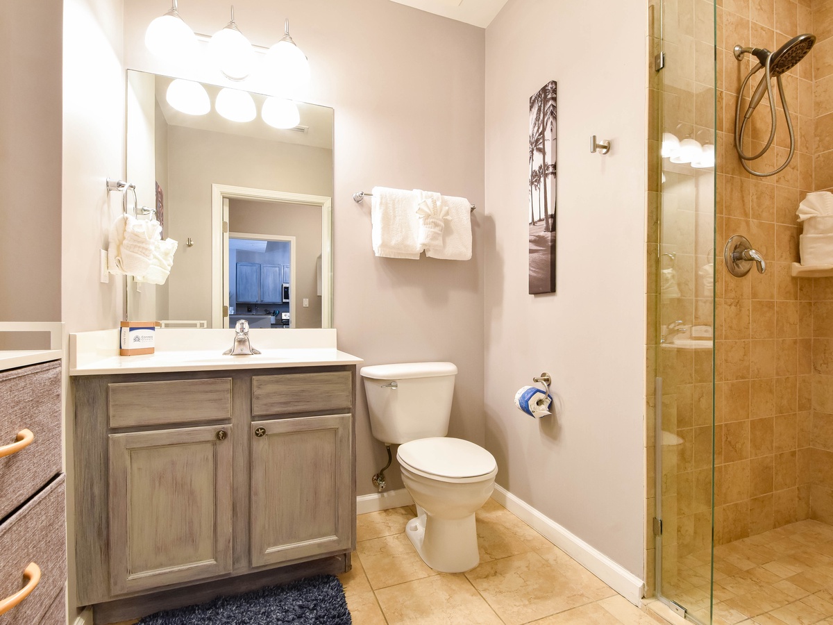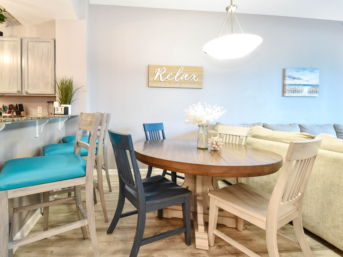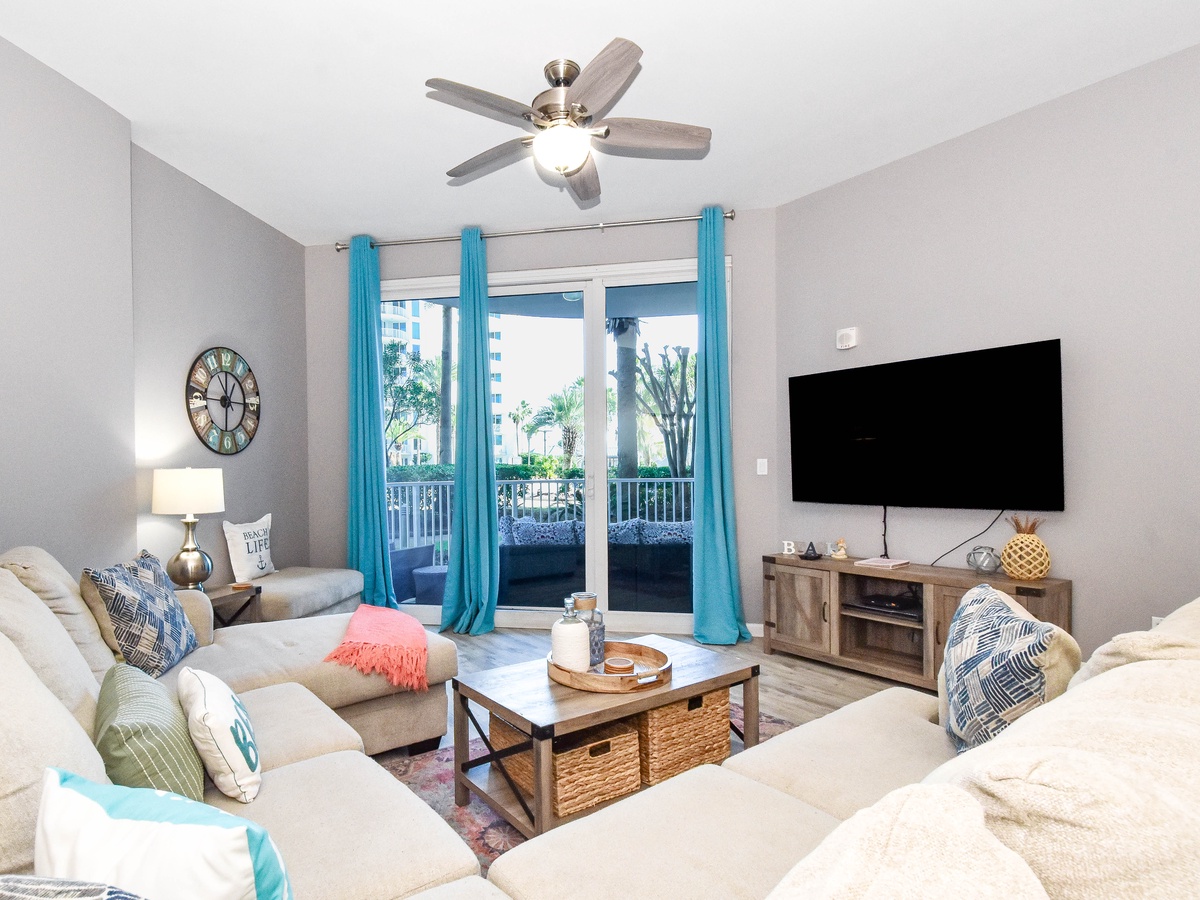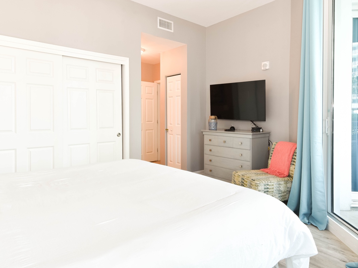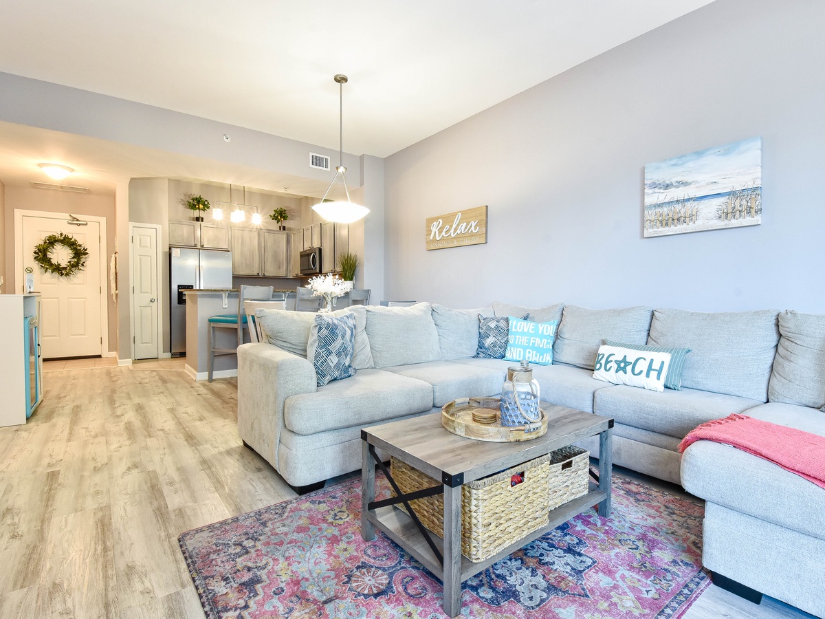 Welcome to The Palms of Destin 2107 Junior, your coastal retreat in the heart of Destin, Florida. This charming ground-floor condo offers the ultimate convenience for families, especially those with little ones, thanks to easy access without the need for an elevator. Just a short stroll from the resort’s famous lagoon pool and tropical grounds, you’ll love the blend of comfort, style, and location. Step inside this beautifully decorated two-bedroom, two-bathroom Destin vacation rental, where coastal charm meets modern amenities. The open-concept living and dining area is perfect for gathering after a day at the beach, with flat-screen TVs and a private patio for relaxing in the fresh salt air. The fully equipped kitchen features ample counter space and a breakfast bar, ideal for preparing home-cooked meals or quick snacks before heading out to the Emerald Coast's sugar-white beaches. Start your day right with the convenient coffee bar just off the kitchen, complete with a mini fridge, so your favorite creamer and cold brews are always within reach. Unwind in the spacious primary suite, complete with a king bed, private patio access, and an attached bathroom with a tub/shower combo. The guest bedroom offers a full-over-full bunk bed and is conveniently located next to the second bathroom with a walk-in shower. Additional perks include an in-unit washer and dryer, high-speed Wi-Fi, and full access to The Palms of Destin Resort’s premier amenities. Whether you're planning a family beach trip or a laid-back getaway, The Palms of Destin 2107 Junior is your perfect home away from home.