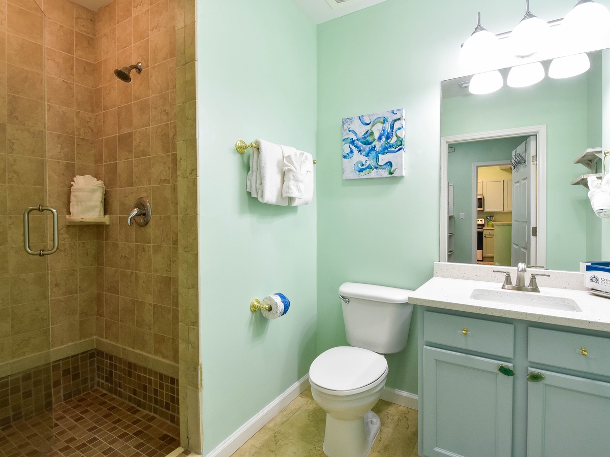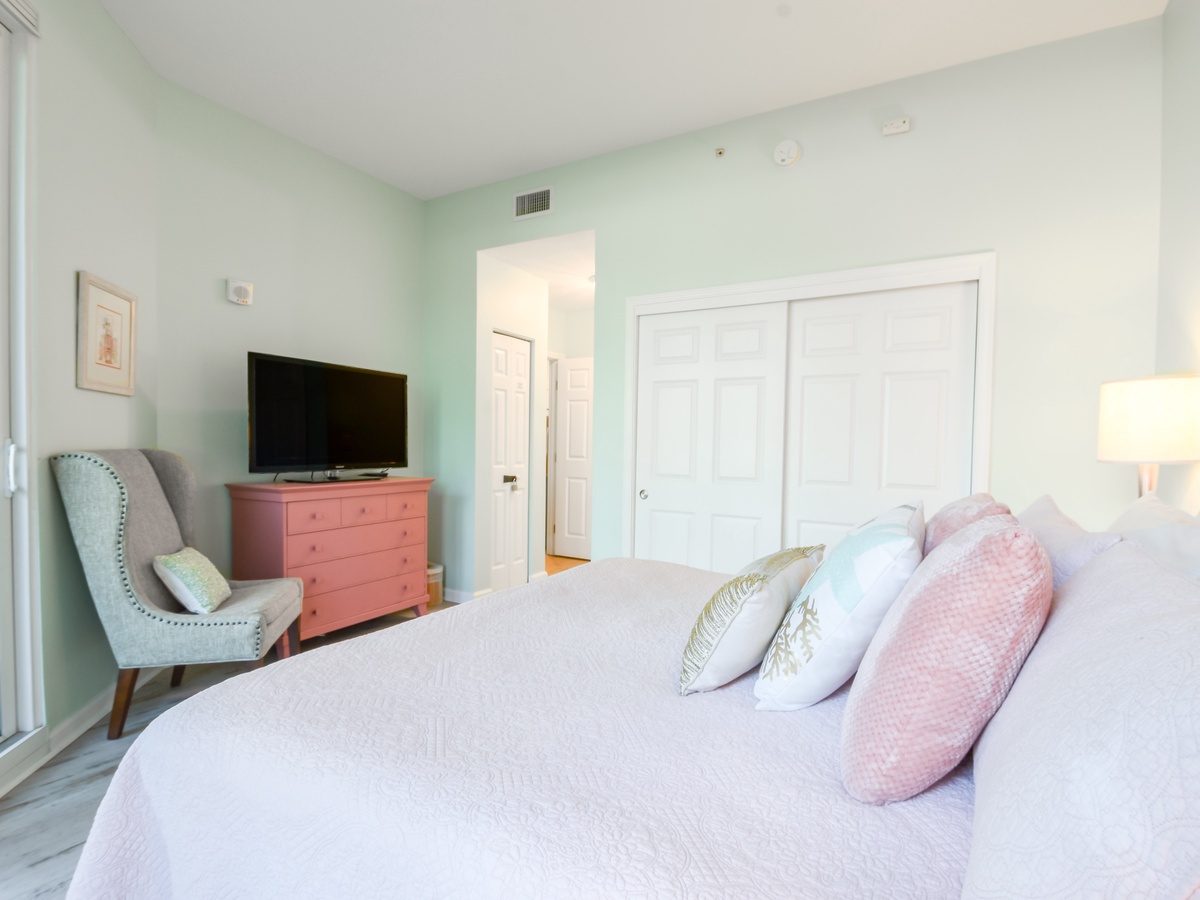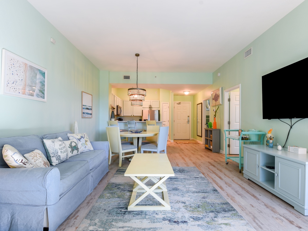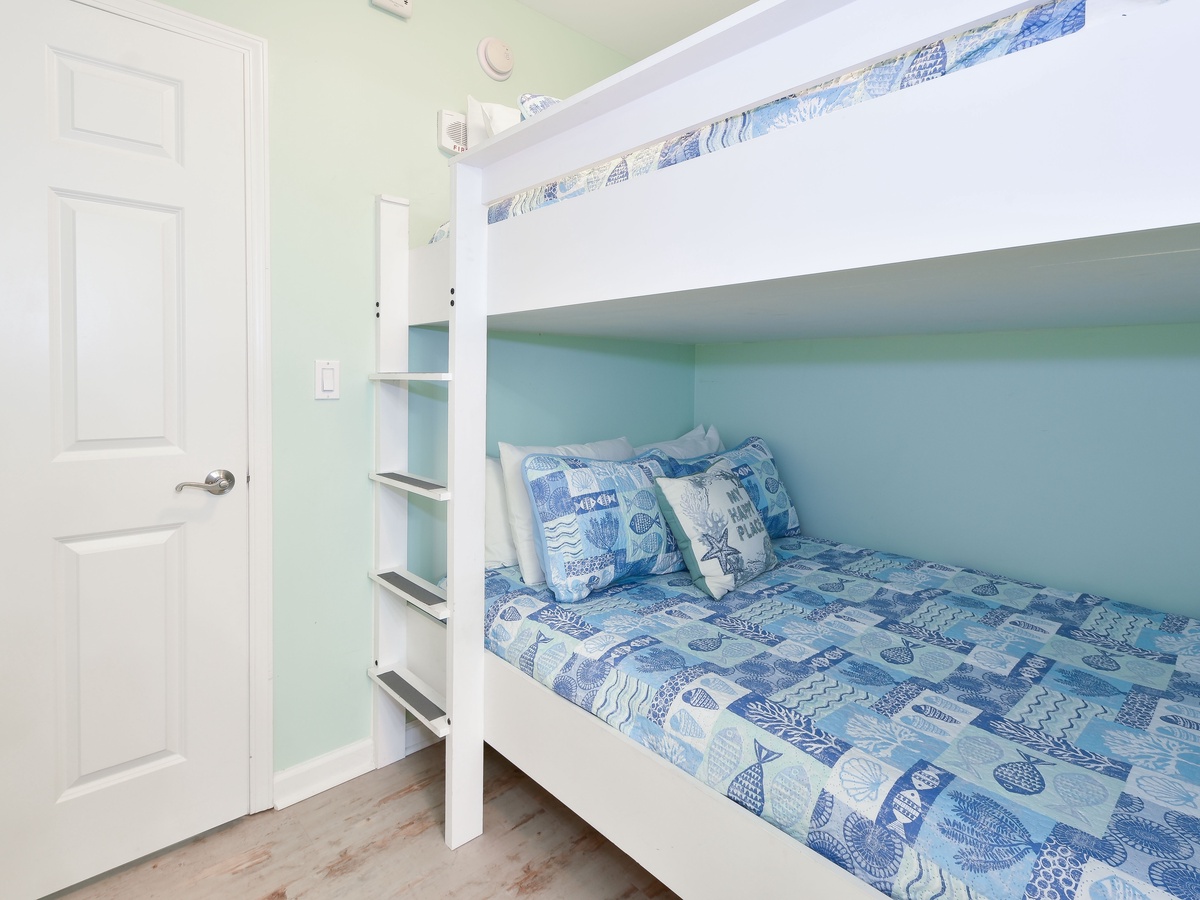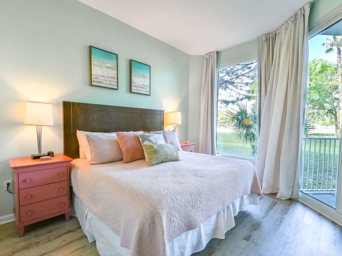 Welcome to The Palms of Destin 2110 Junior. Enjoying the conveniences of staying on the ground floor while being a short stroll away from the pool, families with young children will find ease in not having to use the elevator. This seaside inspired two-bedroom, two-bathroom condo features a large open floor plan, fully equipped kitchen, and flat screen TVs. A bar cart is available to make your favorite evening libation. Relax in the beautiful primary suite with a king bed, patio access, and attached bathroom with a tub/shower combo. The guest bedroom offers a full over full bunk bed plus an attached bath with a walk-in shower. With a sleeper sofa in the living room, this condo can sleep up to six guests comfortably. For added convenience there is a washer and dryer plus a welcoming starter kit. Find out why The Palms of Destin 2110 will become a family favorite for years to come.
