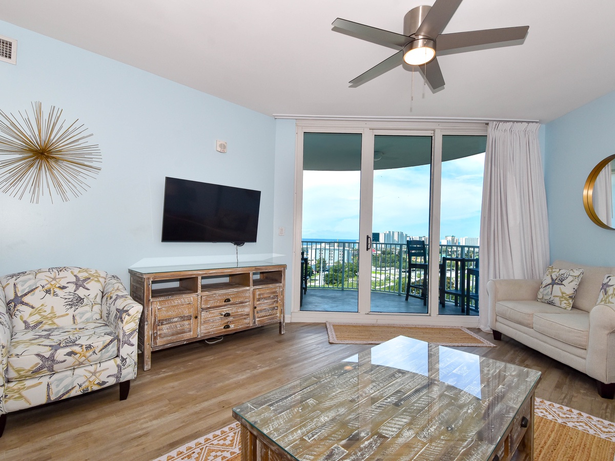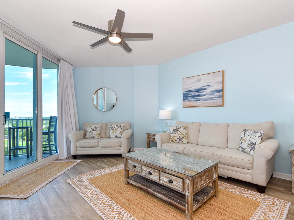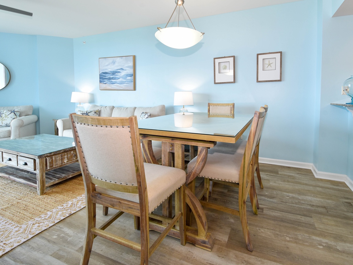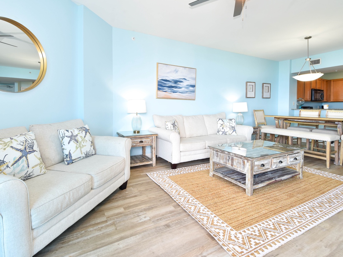 Escape to The Palms of Destin 21112 Junior! This 11th floor two-bedroom, two-bathroom serene coastal condo decorated in soft hues of blue comfortably sleeps up to six guests. A fully equipped kitchen has everything needed to prepare a delectable meal with plenty of prep space. Gather around the dining table that seats six, perfect for quick snacks or full meals. Floor to ceiling sliding glass doors open onto your private balcony where you can capture Destin’s famous sunsets nightly along with glimpses of the gulf. After a day of soaking up the sun, relax in the spacious living room on cozy furniture while enjoying a movie on the flat-screen TV or gather the group for a fun game night. Unwind in the tranquil primary bedroom with a king bed, flat-screen TV, balcony access, and an attached bathroom with a tub/shower combo. The guest bedroom includes a full-over-full bunk bed and flat screen TV and is just steps away from a second bathroom with a walk-in shower. For added conveniences there is also a sleeper sofa in the living room, a washer and dryer, complimentary WiFi, and full access to The Palms of Destin’s resort-style amenities, everything designed to make your vacation seamless and stress-free. Soak up the sun, savor the views, and make cherished memories at The Palms of Destin 21112!