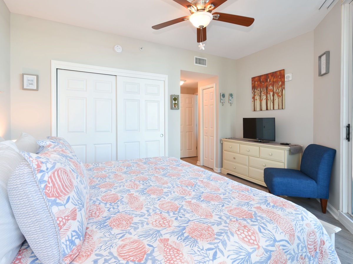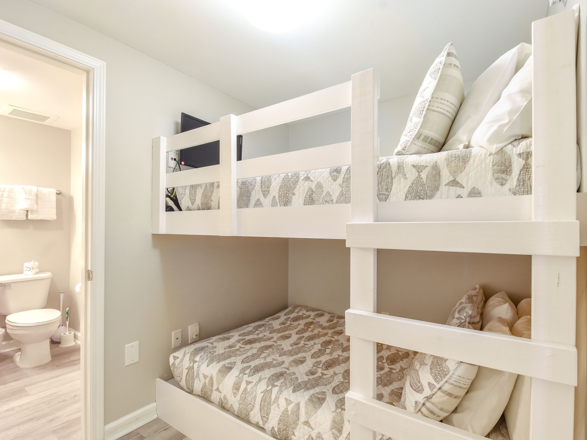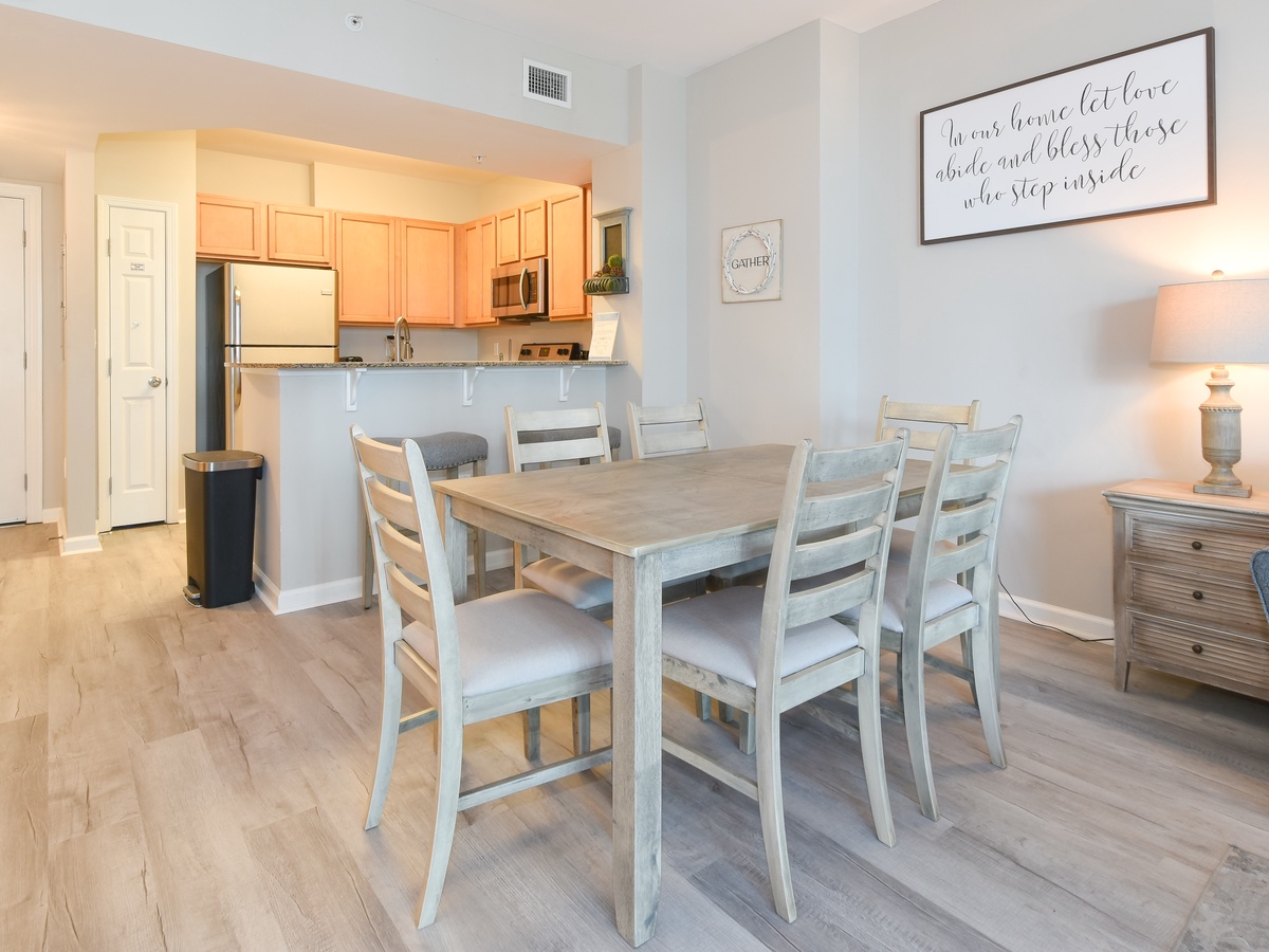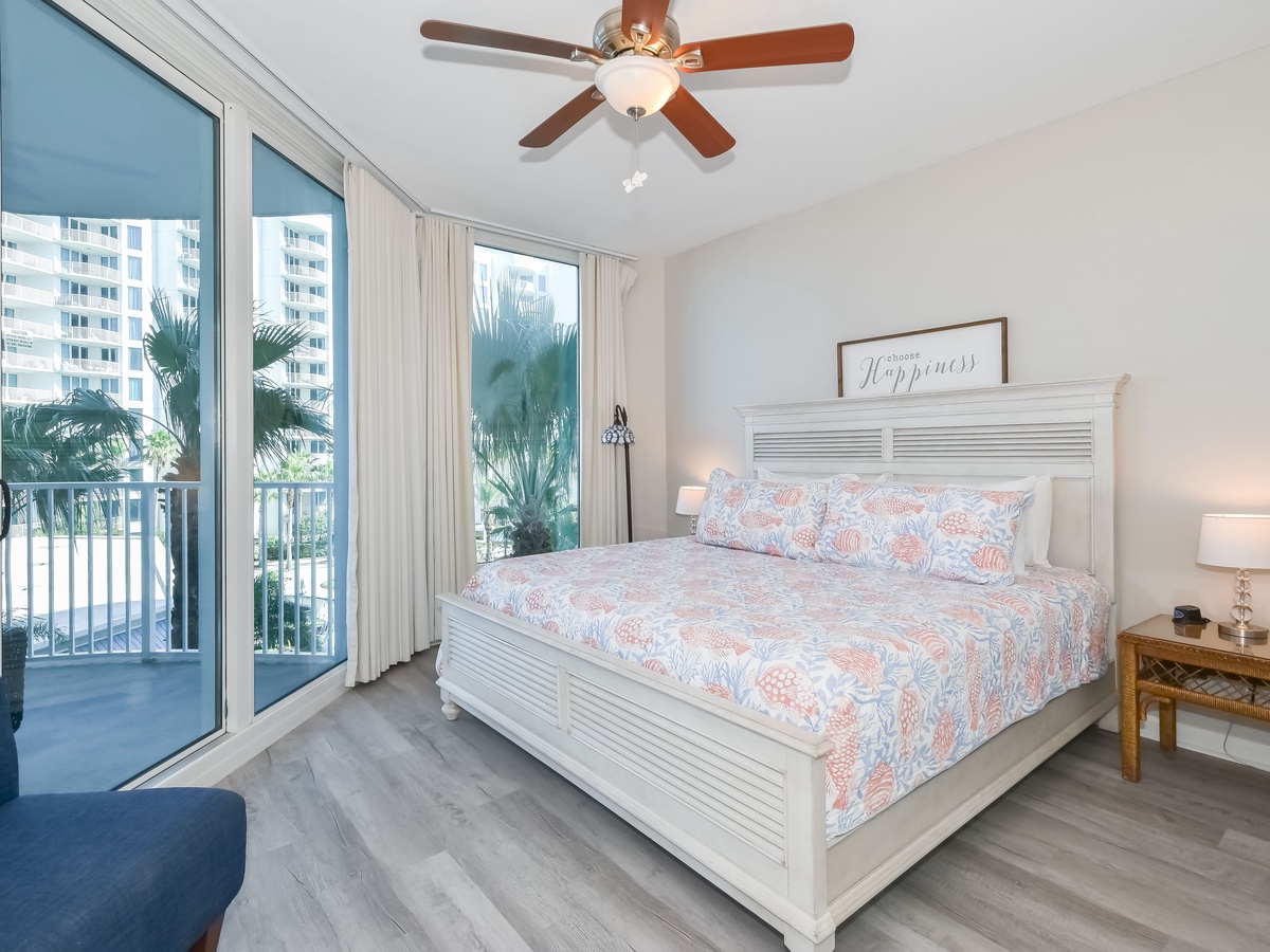 Welcome to The Palms of Destin 2403 Junior, your serene coastal retreat perched on the fourth floor in the vibrant heart of Destin! This two-bedroom, two-bathroom condo comfortably sleeps up to six guests and offers the perfect blend of comfort, style, and relaxation for your next beach vacation. Step into the fully equipped kitchen, where you’ll find everything you need to prepare anything from light beach snacks to hearty home-cooked meals. Gather around the dining table for six to share stories and laughs or enjoy a casual bite at the breakfast bar with seating for two, perfect for morning coffee or late-night treats. After a day of sunshine and salty air, unwind in the cozy living area, complete with a flat-screen TV and a sleeper sofa for extra guests. Slide open the doors to your private balcony and take in peaceful views of the lush resort pool area, a perfect backdrop for sunset cocktails or quiet morning moments. The spacious primary suite is a true haven, featuring a plush king bed, flat-screen TV, direct balcony access, and a private bathroom with a convenient tub/shower combo. The guest bedroom offers a full-over-full bunk bed and is just steps away from a second bathroom with a walk-in shower, making it ideal for families or friends. Enjoy all the comforts of home including a washer and dryer, complimentary WiFi, and full access to The Palms of Destin’s resort-style amenities, everything designed to make your vacation seamless and stress-free. Make unforgettable memories at The Palms of Destin 2403 where coastal charm and relaxation come together for the ultimate Destin beach vacation.