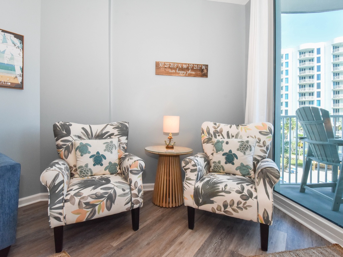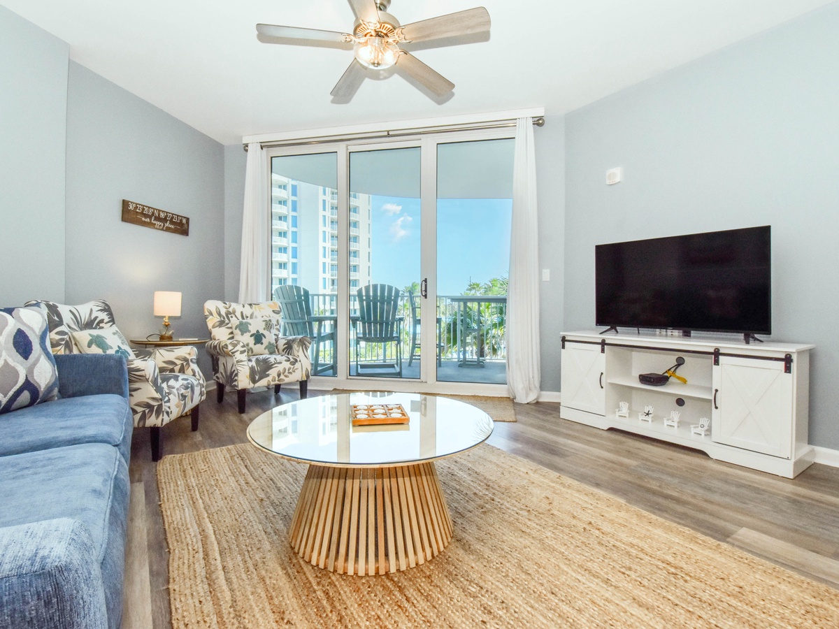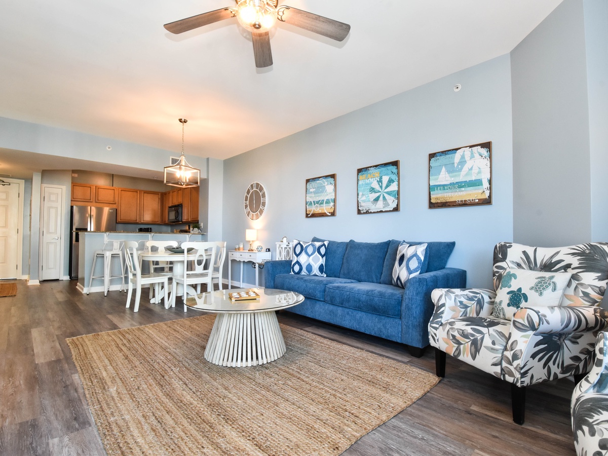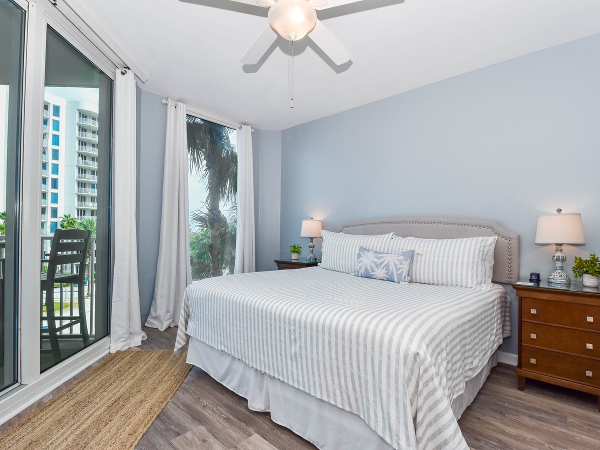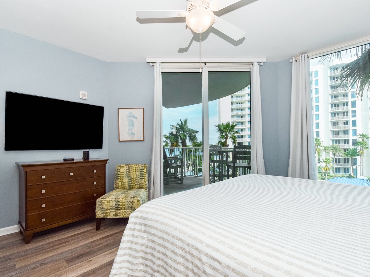 Welcome to The Palms of Destin 2409 Junior, your coastal retreat on the fourth floor in the heart of Destin! This stylish and comfortable two-bedroom, two-bathroom condo sleeps up to six guests and is the perfect home base for your next beachside getaway. Start your morning in the fully equipped kitchen, stocked with everything you need to whip up anything from quick beach snacks to hearty family dinners. Enjoy meals at the dining table for four or gather around the breakfast bar with seating for four ideal for casual bites or your morning coffee. After a fun-filled day in the sun, kick back in the cozy living area and catch your favorite show on the flat-screen TV, or step out onto the private balcony and soak in serene views of the resort’s sparkling lagoon pools. The spacious primary suite offers a king bed, balcony access, a flat-screen TV, and a private bathroom with a convenient tub/shower combo. The guest bedroom features a full-over-full bunk bed and is just steps from a second bathroom with a walk-in shower, plus an additional sleeper sofa in the living room for added guests. With added conveniences like a washer and dryer, free WiFi, and access to all of The Palms of Destin’s resort-style amenities, all designed to make your vacation easy and enjoyable. Make lasting memories at The Palms of Destin 2409 where coastal comfort meets carefree vacation living!