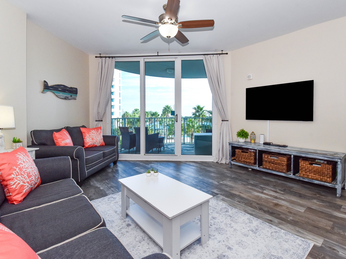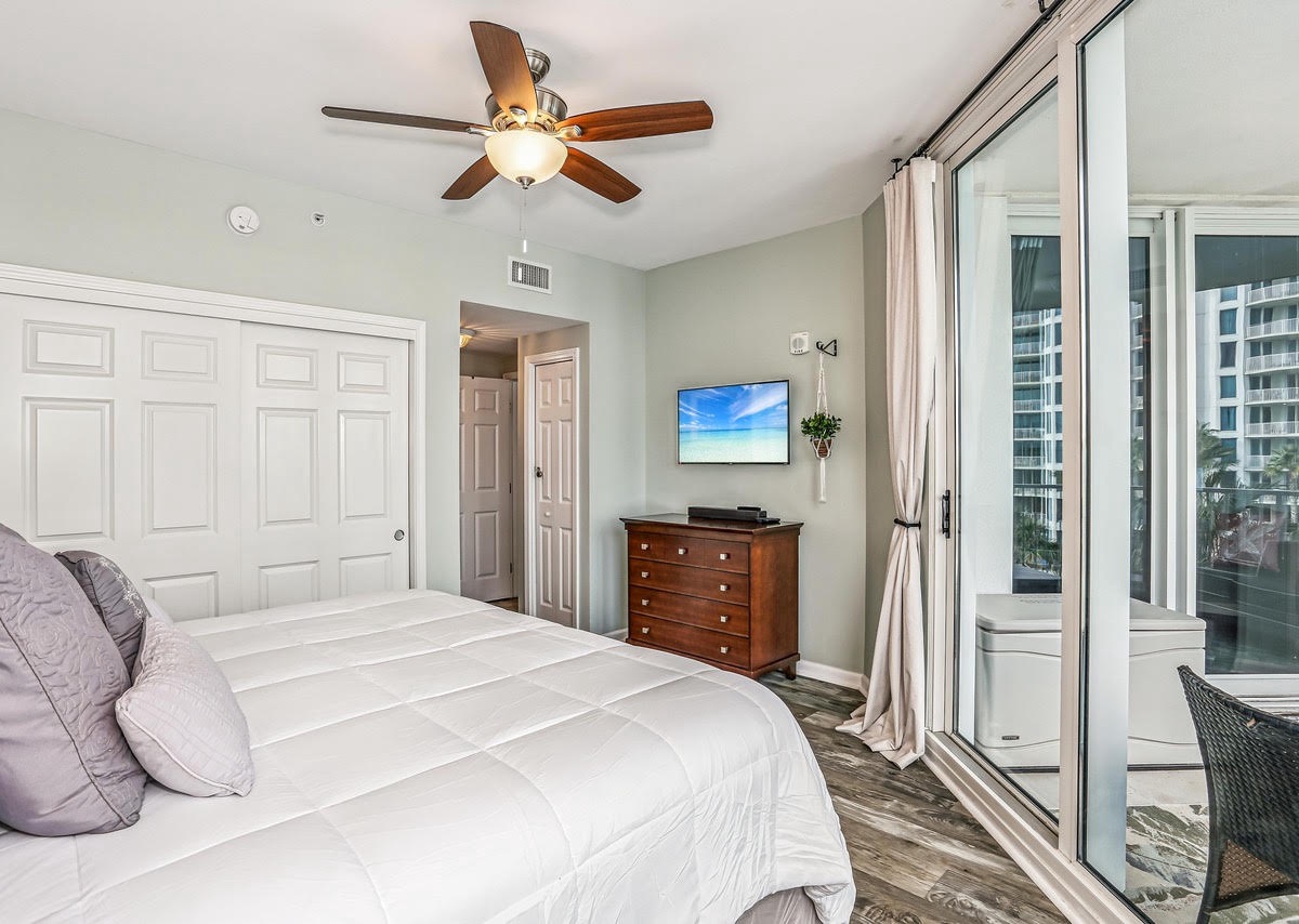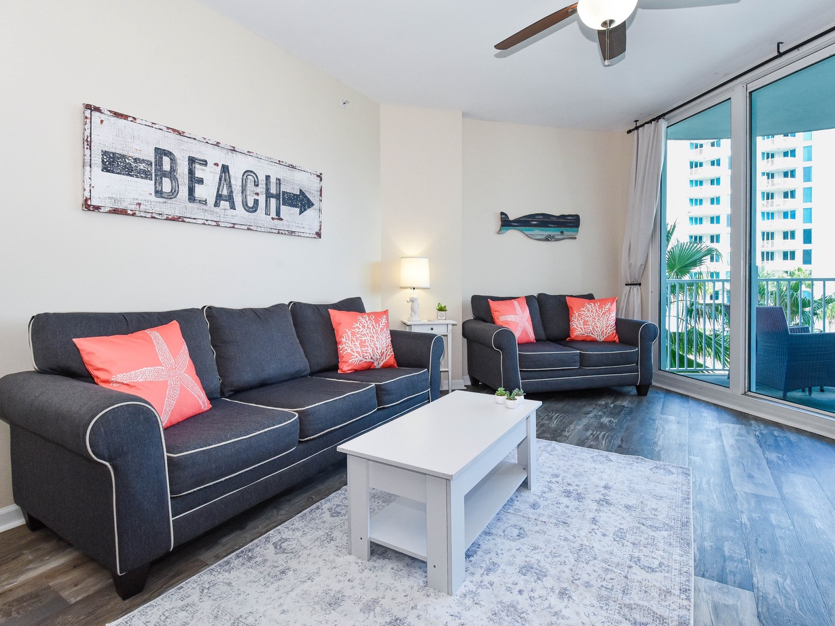 Welcome to The Palms of Destin 2411 Junior, your stylish and serene coastal getaway in the heart of Destin! This fourth-floor contemporary two-bedroom, two-bathroom condo comfortably sleeps up to six guests and offers everything you need for the perfect beach escape. After a sun-soaked day, kick back and relax in the cozy living area catching your favorite show on the flat-screen TV or step out onto the balcony to enjoy peaceful views of the sparkling lagoon pool area. The fully equipped kitchen has everything you need to whip up a quick bite or a family meal, with a dining table, that seats six with additional seating at the bar for four, nearby for gathering and reconnecting. The spacious primary suite features a king bed, private balcony access, a flat-screen TV, and an attached bathroom with a convenient tub/shower combo. The guest bedroom is perfect for kids or additional guests, with a twin-over-full bunk bed and access to a nearby bathroom with a walk-in shower. Enjoy all the comforts of home with a washer and dryer, free WiFi, and resort-style amenities just steps away. Make unforgettable memories at The Palms of Destin 2411 on your next Destin beach vacation!