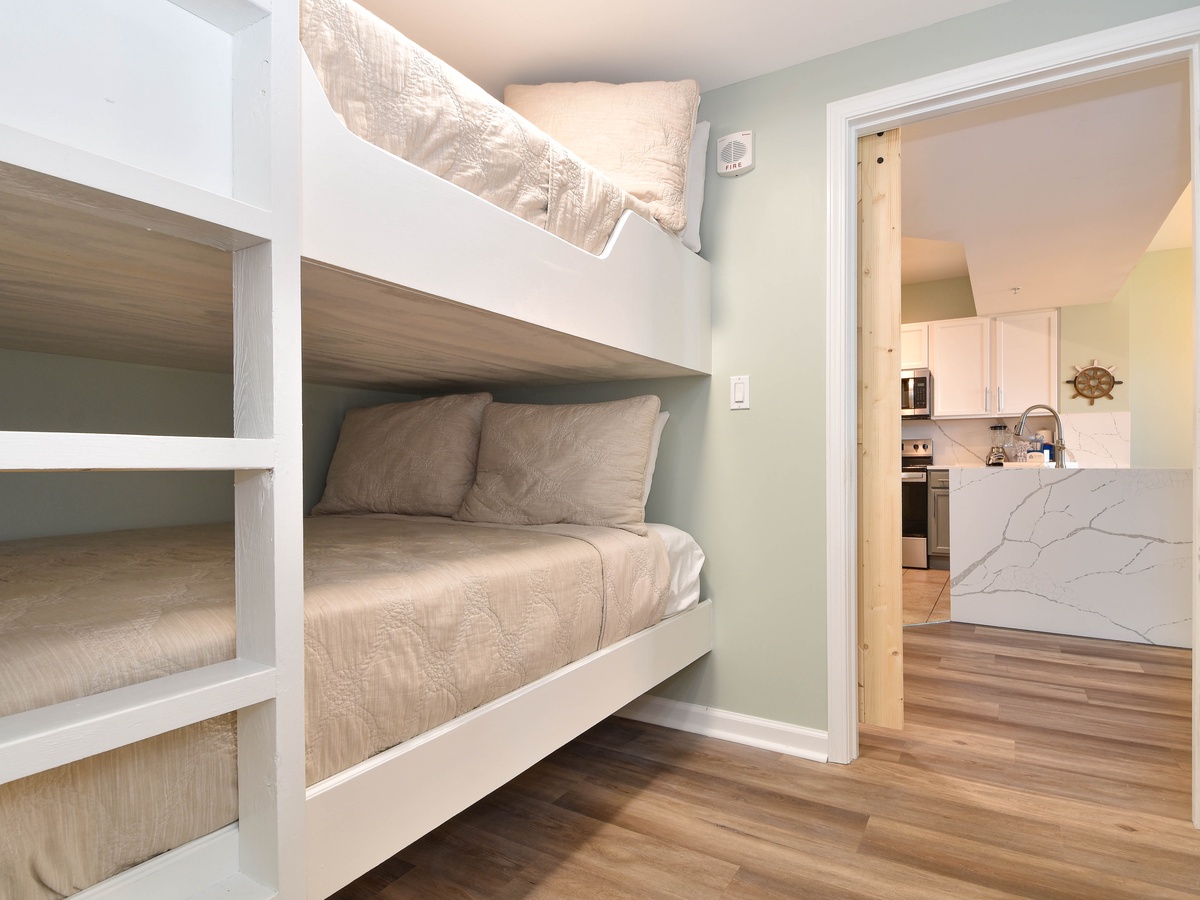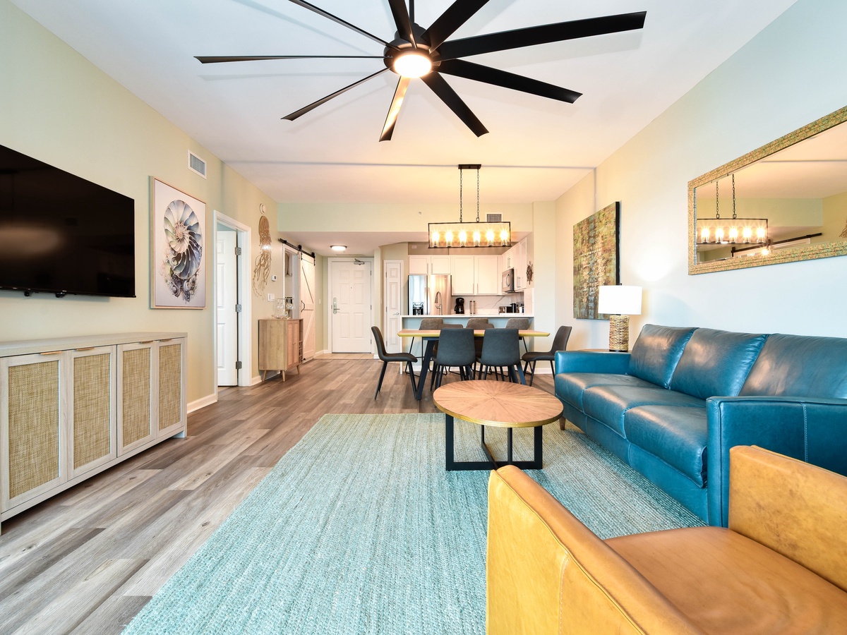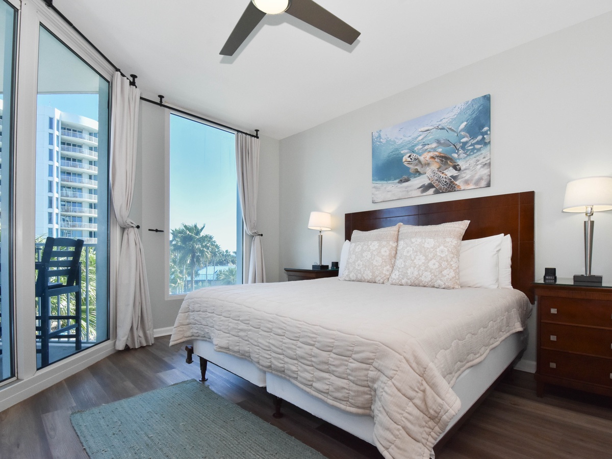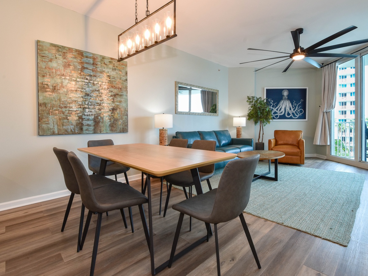 Welcome to The Palms of Destin 2413 Junior, a beautifully decorated two-bedroom two-bathroom condo that sleeps up to six guests. Relax in the modern living room after a full day in the sun on the couch while you watch your favorite show on the TV or sit on the balcony overlooking the resort's lagoon pool. Whip up a quick and easy meal in the gorgeous fully equipped kitchen with stainless steel appliances and quartz countertops. Gather around the dining table with seating for six, plus room for three more at the breakfast bar, perfect for meals, games, and good conversation. Unwind in the primary bedroom, complete with a king bed, balcony access, flat screen TV, and attached bathroom with a tub/shower combo. The guest bedroom offers a full over full bunk bed and a nearby guest bathroom with a walk-in shower. For added convenience there is a washer and dryer and WIFI within the condo. Make your next Destin beach vacation a memorable one at The Palms of Destin 2413.