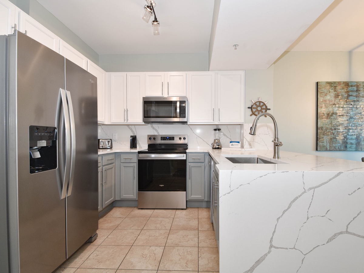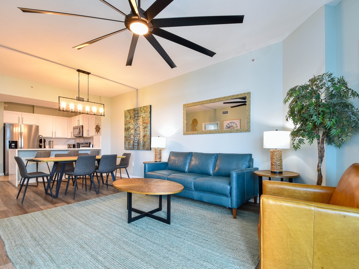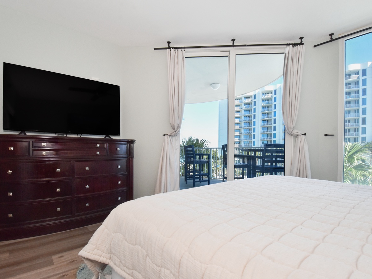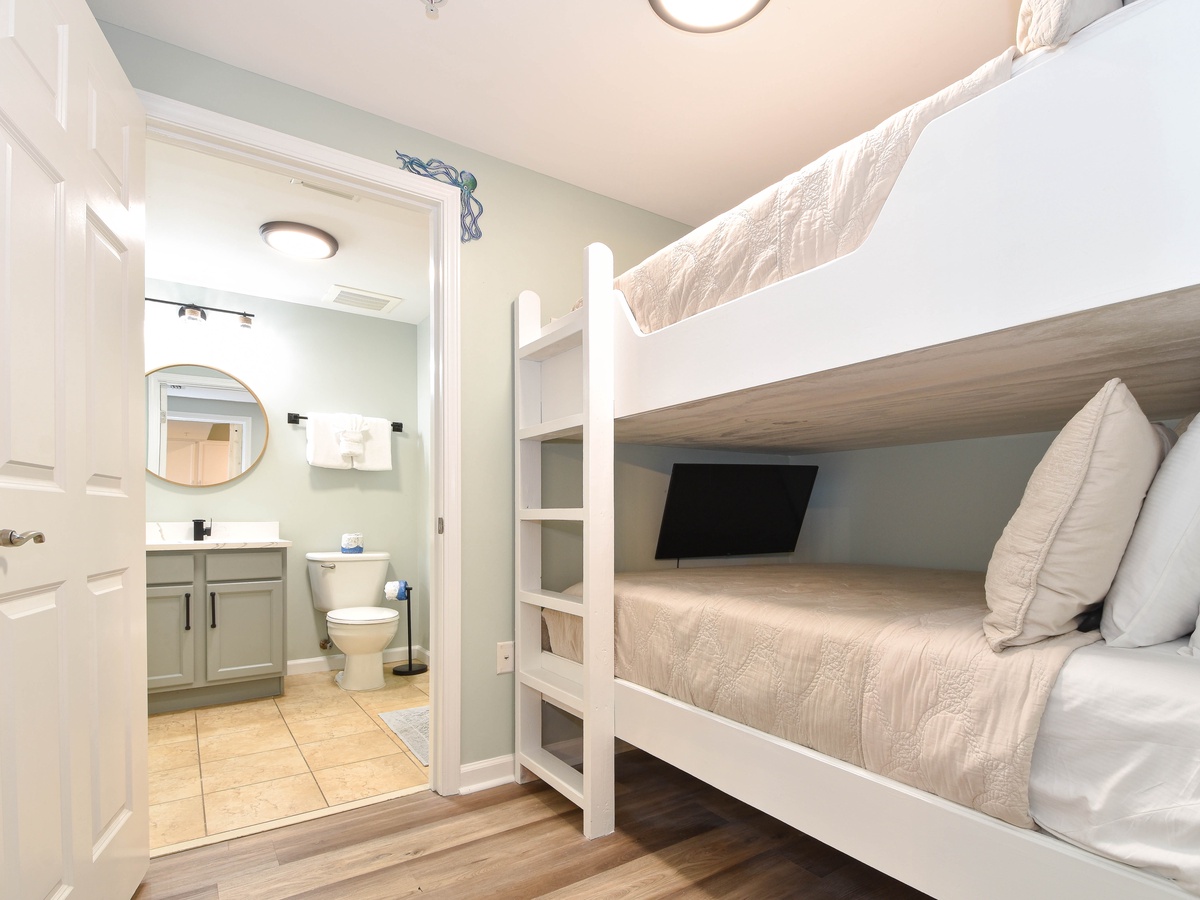 Welcome to The Palms of Destin 2413 Junior, a beautifully decorated two-bedroom two-bathroom condo that sleeps up to six guests. Relax in the modern living room after a full day in the sun on the couch while you watch your favorite show on the TV or sit on the balcony overlooking the resort's lagoon pool. Whip up a quick and easy meal in the gorgeous fully equipped kitchen with stainless steel appliances and quartz countertops. Gather around the dining table with seating for six, plus room for three more at the breakfast bar, perfect for meals, games, and good conversation. Unwind in the primary bedroom, complete with a king bed, balcony access, flat screen TV, and attached bathroom with a tub/shower combo. The guest bedroom offers a full over full bunk bed and a nearby guest bathroom with a walk-in shower. For added convenience there is a washer and dryer and WIFI within the condo. Make your next Destin beach vacation a memorable one at The Palms of Destin 2413.
