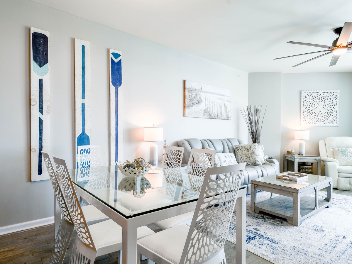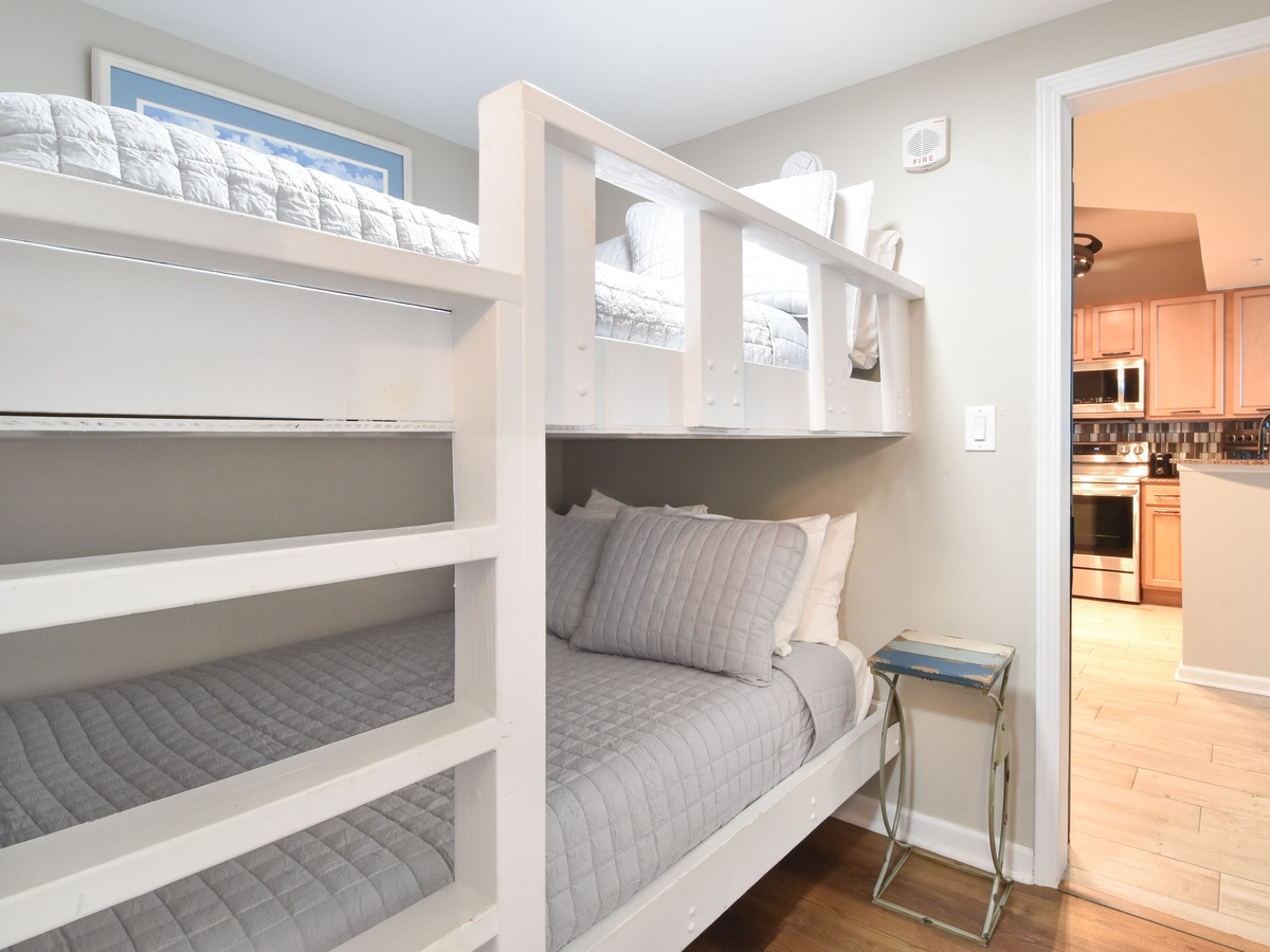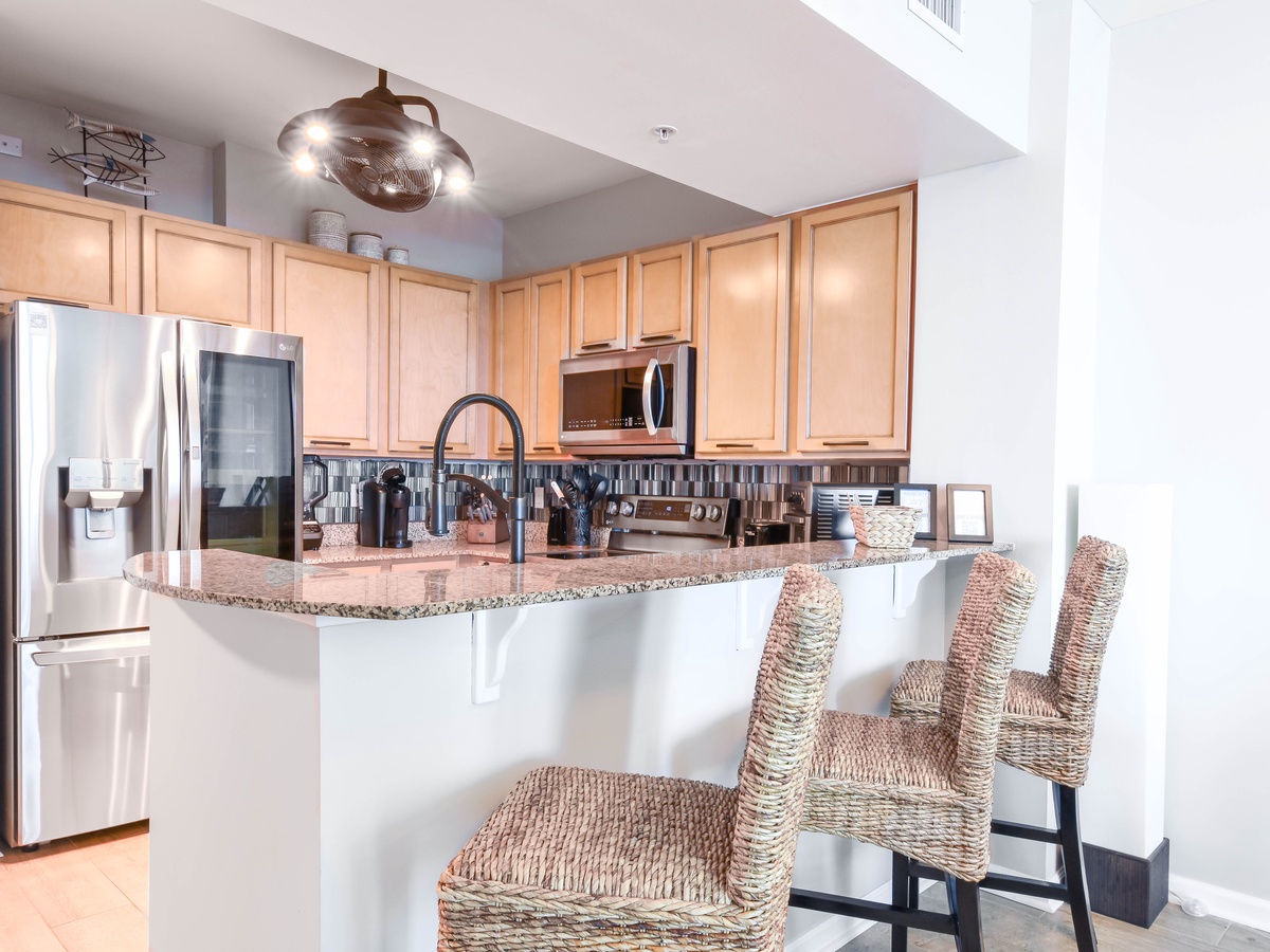 Take a step into your perfect coastal modern escape at The Palms of Destin 2513 Junior, one of the most stylish Destin vacation rentals. This two-bedroom, two-bath vacation condo comfortably sleeps up to six guests, making it an ideal family-friendly getaway. From remote-controlled blinds to wireless chargers built right into the sofa, this beach rental is packed with modern tech touches designed for comfort and convenience. A beautifully upgraded fully equipped kitchen makes meal prep easy whether you are packing a cooler for the beach or whipping up a delectable meal to be shared around the table. Stainless steel appliances, including a full-size fridge that makes orb shaped ice cubes, granite countertops, Le Creuset stoneware dishes, plus specialty appliances like a juicer, Ninja Blender, and an air fryer all perfect for elevating your beach vacation experience. The beautiful costal modern dining table seats six guests, plus additional seating for three at the breakfast bar before heading out to enjoy the resort amenities or what all Destin has to offer. Unwind in the living area with a movie on the flat-screen TV with popcorn and your favorite candies. Guests will find that the entertainment stand converts into a murphy bed for additional sleeping options in the living area. Unwind in the primary bedroom with a serene, coastal-inspired retreat that brings the beauty of the shore inside. Enjoy the comforts of a plush king bed, private balcony access, a flat-screen TV, and attached bathroom featuring a tub/shower combination. The primary bathroom features a body sprayer with multiple heads such as waterfall, rain, shower and jets, perfect for pampering after a day at the beach. The second bedroom offers a full-over-full bunk bed with easy access to the second bathroom with a walk-in shower and the kitchen. For added convenience this condo features in unit laundry, secure WIFI, and fabulous resort amenities. Start making your favorite Destin beach memories today at The Palms of Destin 2513.
