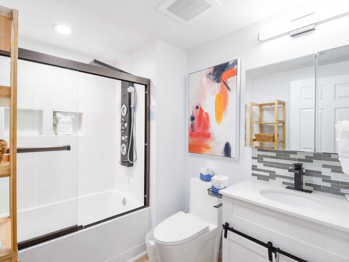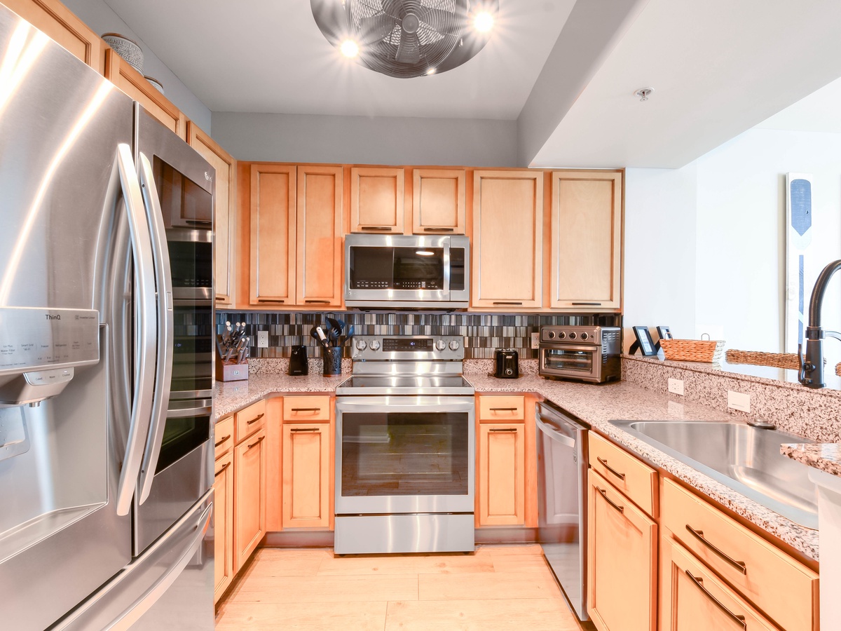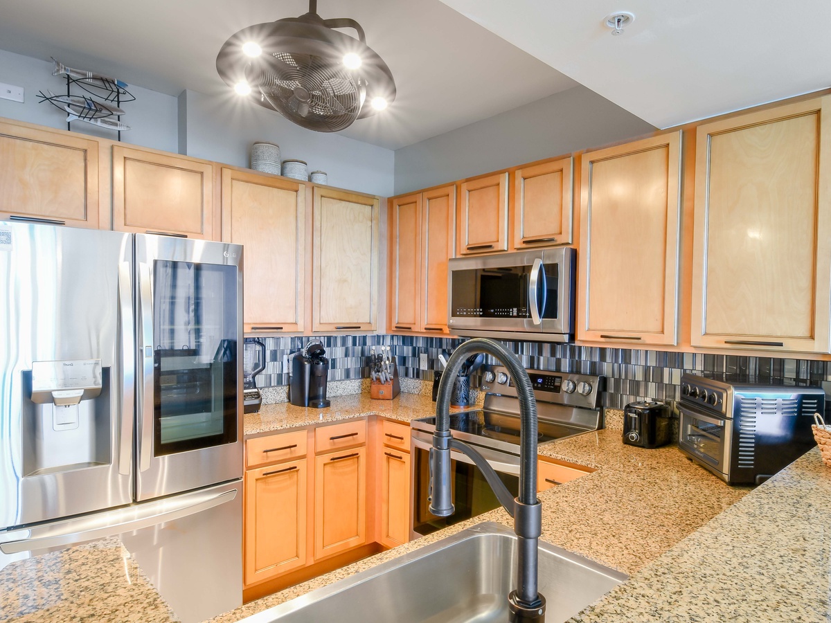 Take a step into your perfect coastal modern escape at The Palms of Destin 2513 Junior, one of the most stylish Destin vacation rentals. This two-bedroom, two-bath vacation condo comfortably sleeps up to six guests, making it an ideal family-friendly getaway. From remote-controlled blinds to wireless chargers built right into the sofa, this beach rental is packed with modern tech touches designed for comfort and convenience. A beautifully upgraded fully equipped kitchen makes meal prep easy whether you are packing a cooler for the beach or whipping up a delectable meal to be shared around the table. Stainless steel appliances, including a full-size fridge that makes orb shaped ice cubes, granite countertops, Le Creuset stoneware dishes, plus specialty appliances like a juicer, Ninja Blender, and an air fryer all perfect for elevating your beach vacation experience. The beautiful costal modern dining table seats six guests, plus additional seating for three at the breakfast bar before heading out to enjoy the resort amenities or what all Destin has to offer. Unwind in the living area with a movie on the flat-screen TV with popcorn and your favorite candies. Guests will find that the entertainment stand converts into a murphy bed for additional sleeping options in the living area. Unwind in the primary bedroom with a serene, coastal-inspired retreat that brings the beauty of the shore inside. Enjoy the comforts of a plush king bed, private balcony access, a flat-screen TV, and attached bathroom featuring a tub/shower combination. The primary bathroom features a body sprayer with multiple heads such as waterfall, rain, shower and jets, perfect for pampering after a day at the beach. The second bedroom offers a full-over-full bunk bed with easy access to the second bathroom with a walk-in shower and the kitchen. For added convenience this condo features in unit laundry, secure WIFI, and fabulous resort amenities. Start making your favorite Destin beach memories today at The Palms of Destin 2513.