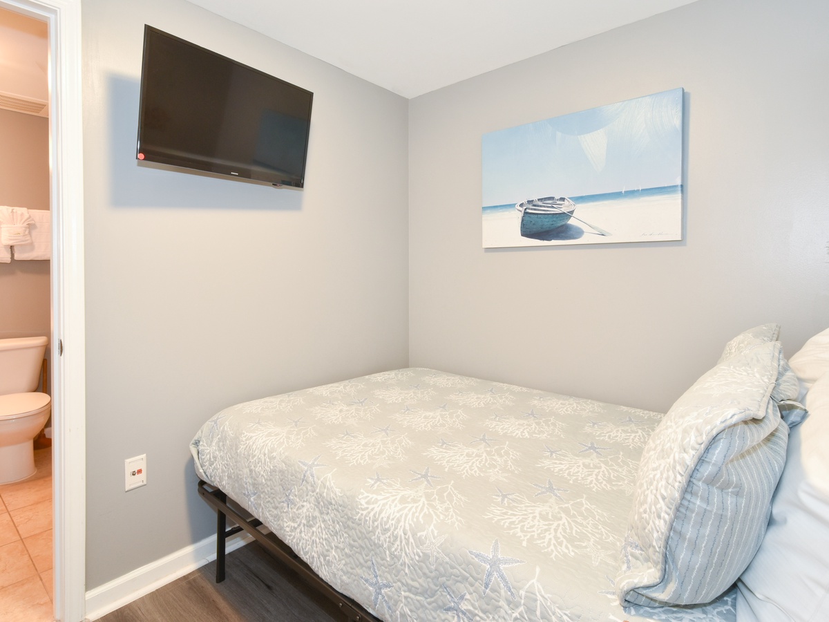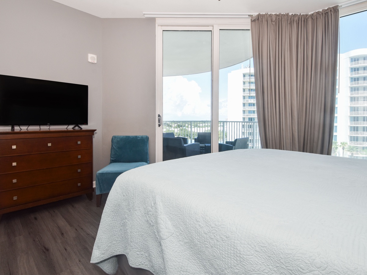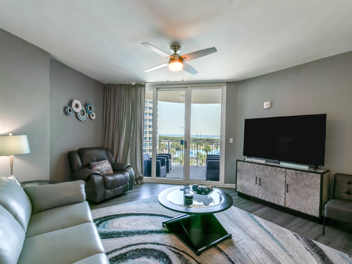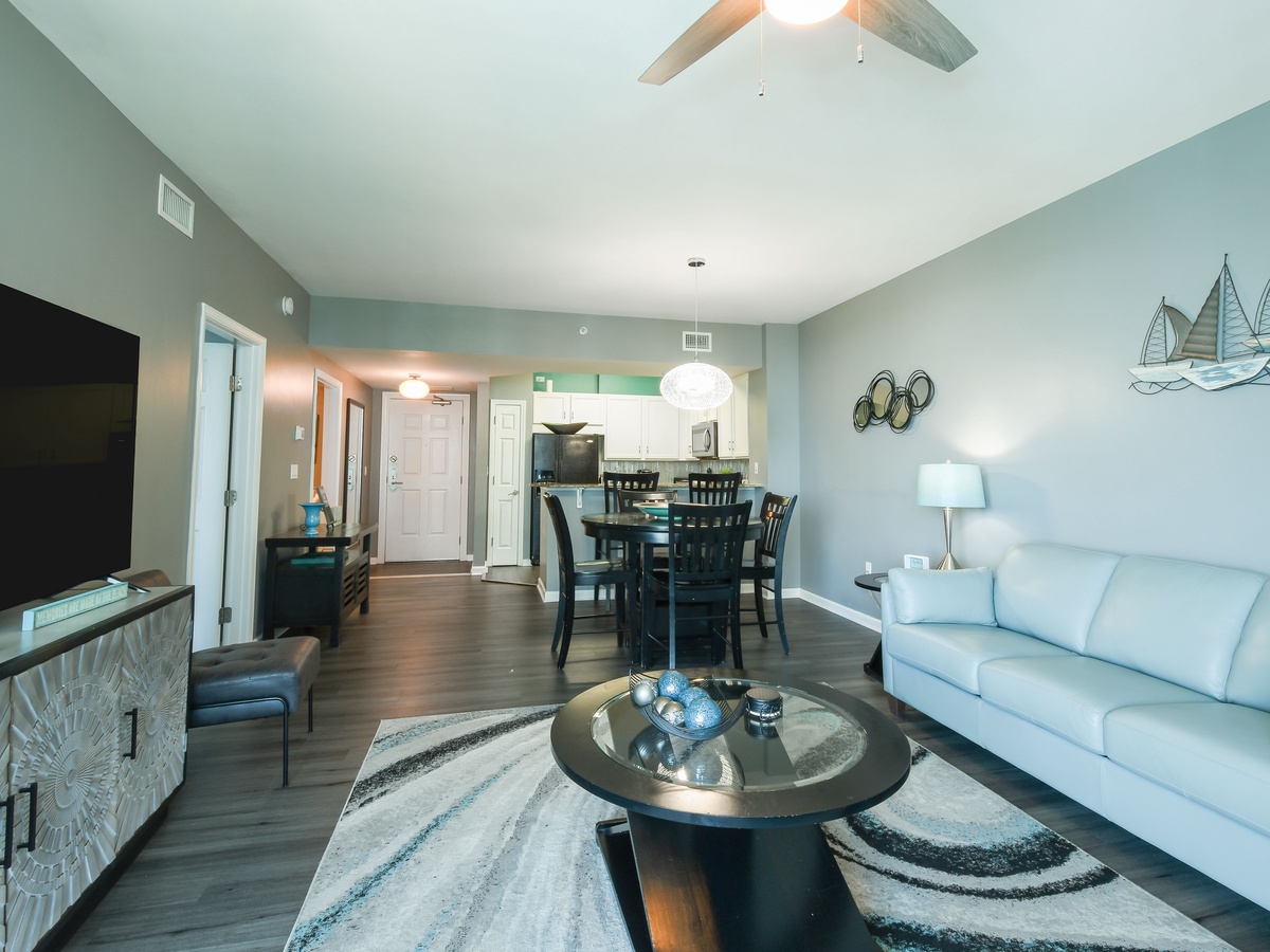 Welcome to The Palms of Destin 2609 Junior, a modern two-bedroom two-bath coastal condo that sleeps up to six guests comfortably. Relax on the sixth-floor balcony, where comfortable seating lets you take in views of Destin’s largest lagoon pool, along with a glimpse of the Gulf. Whether you’re whipping up quick snacks for the beach or preparing a full meal, the fully equipped kitchen has everything you need. The charming dining table seats four, while two extra seats at the breakfast bar offer a cozy spot for casual bites or coffee to start the day. After a day in the sun, kick back in the stylish living area and gather for a game or sink into the sofa and stream your favorite movie. An inviting primary bedroom includes a king bed, balcony access, flat-screen TV, and an attached bathroom with a tub/shower combo. The second bedroom offers a cozy full bed and a flat-screen TV, while extra sleeping space on the sleeper sofa in the living area is perfect for laid-back beach nights. For added convenience, there is an additional bathroom off the guest bedroom with a walk-in shower, in-unit laundry, and secure WIFI. Secure your stay at The Palms of Destin 2609 today and enjoy a laid-back, beachside escape like no other.