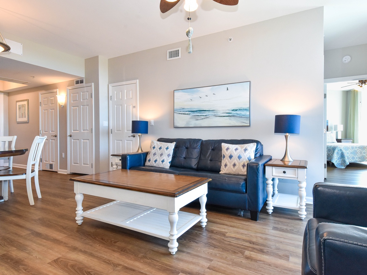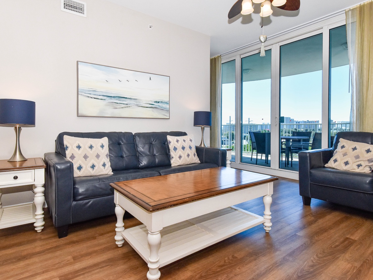 Welcome to The Palms of Destin 2616! This relaxing two-bedroom two-bath condo sleeps up to six guests comfortably. Relax on the sixth-floor balcony and enjoy a front row view of the spectacular sunsets Destin is known for. The fully equipped kitchen provides everything you will need to pack quick eats for the beach or delicious meals. The cozy dining table comfortably seats four, with two extra spots at the breakfast bar, perfect for casual meals or morning coffee. After a full day in the sun, unwind in the living room with a game or curl up on the couch with your favorite movie. The welcoming primary bedroom features a cozy king bed, balcony access, flat screen TV, and a desk when work follows you to the beach. An attached bathroom with a walk-in shower completes the primary suite. The second bedroom includes another king bed with additional sleeping options on a sleeper sofa in the living area. For added convenience there is an additional bathroom with a tub/shower combo, in unit laundry, and secure WIFI. Reserve your perfect Destin beach vacation rental today at The Palms of Destin 2616.
