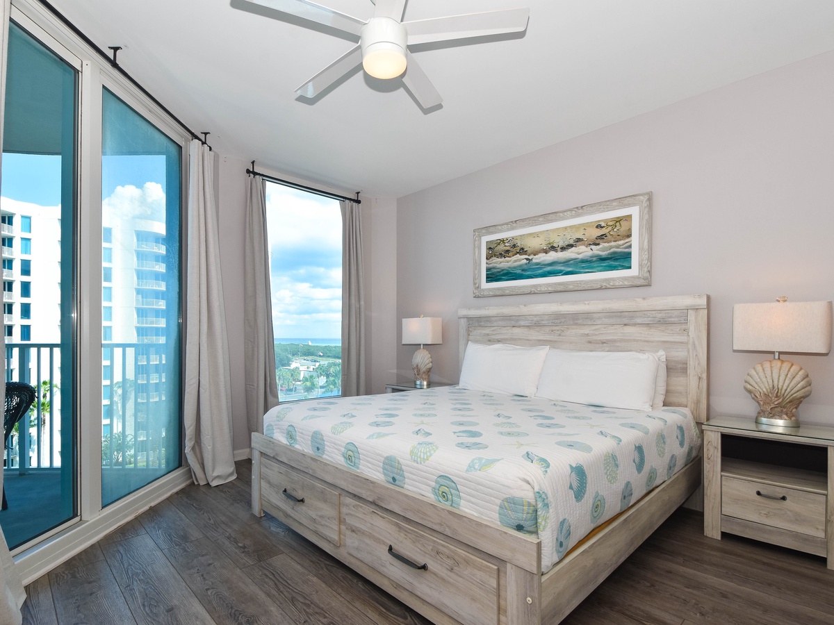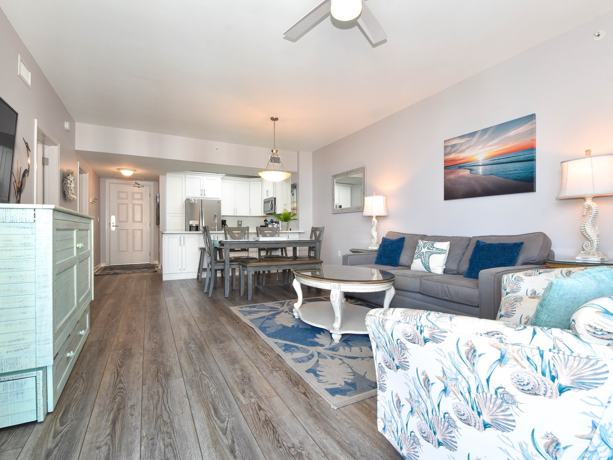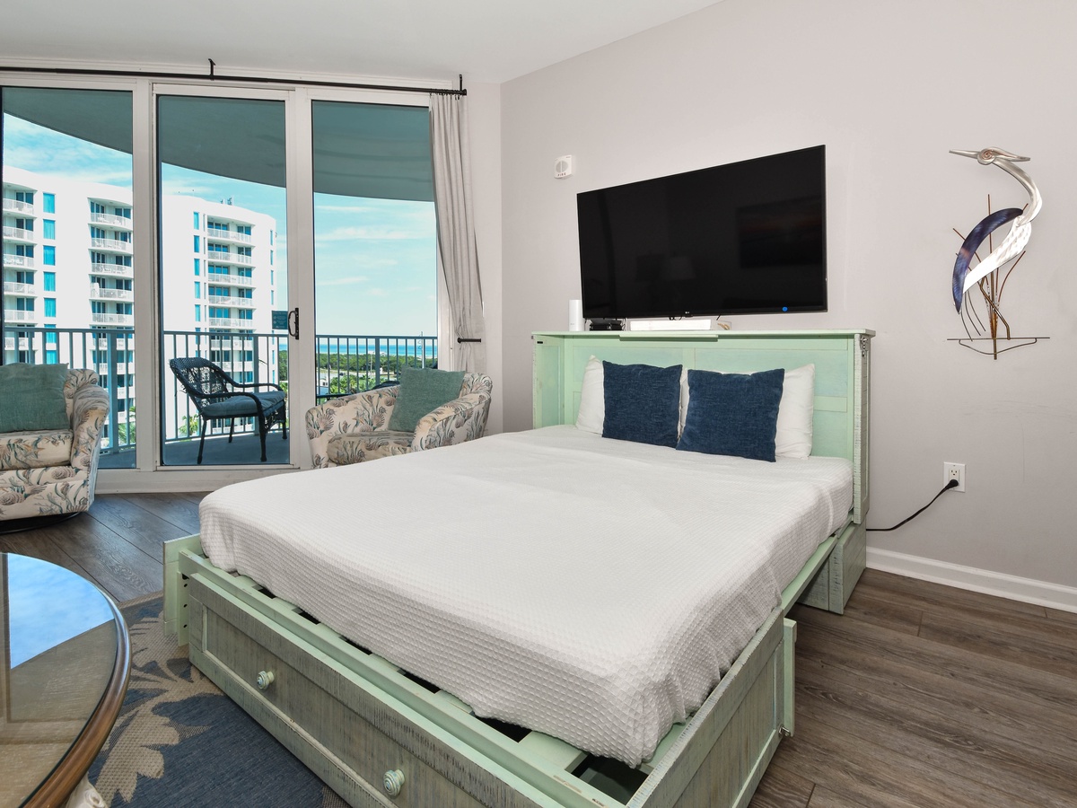 Welcome to your perfect coastal escape, The Palms of Destin 2709 Junior. This two-bedroom two bath sleeps up to six guests comfortably. Unwind on the seventh-floor balcony and enjoy easygoing views of the lagoon pool and the Gulf. A beautifully upgraded fully equipped kitchen makes meal prep easy whether you are packing a cooler for the beach or whipping up a delectable meal to be shared around the table. Stainless steel appliances, quartz countertops, and plenty of storage add a touch of modern flair to this coastal escape. The dining table seats six guests with a bench seat, plus additional seating for two at the breakfast bar. Unwind in the living area with a movie on the flat-screen TV with popcorn and your favorite candies. Additional sleeping is available in the living room where the entertainment stand converts into a murphy bed. Unwind in the primary bedroom, where soothing blue and gray tones create a serene, coastal-inspired retreat that brings the beauty of the shore inside. Enjoy the comforts of a king bed, private balcony access, a flat-screen TV, and attached bathroom featuring a tub/shower combination. The second bedroom offers a twin-over-full bunk bed with easy access to the second bathroom with a walk-in shower and the kitchen. For added convenience this condo features in unit laundry and secure WIFI. Start making your favorite Destin beach memories today at The Palms of Destin 2709.