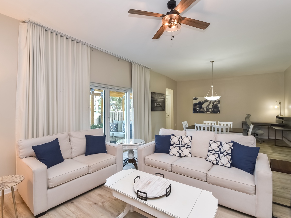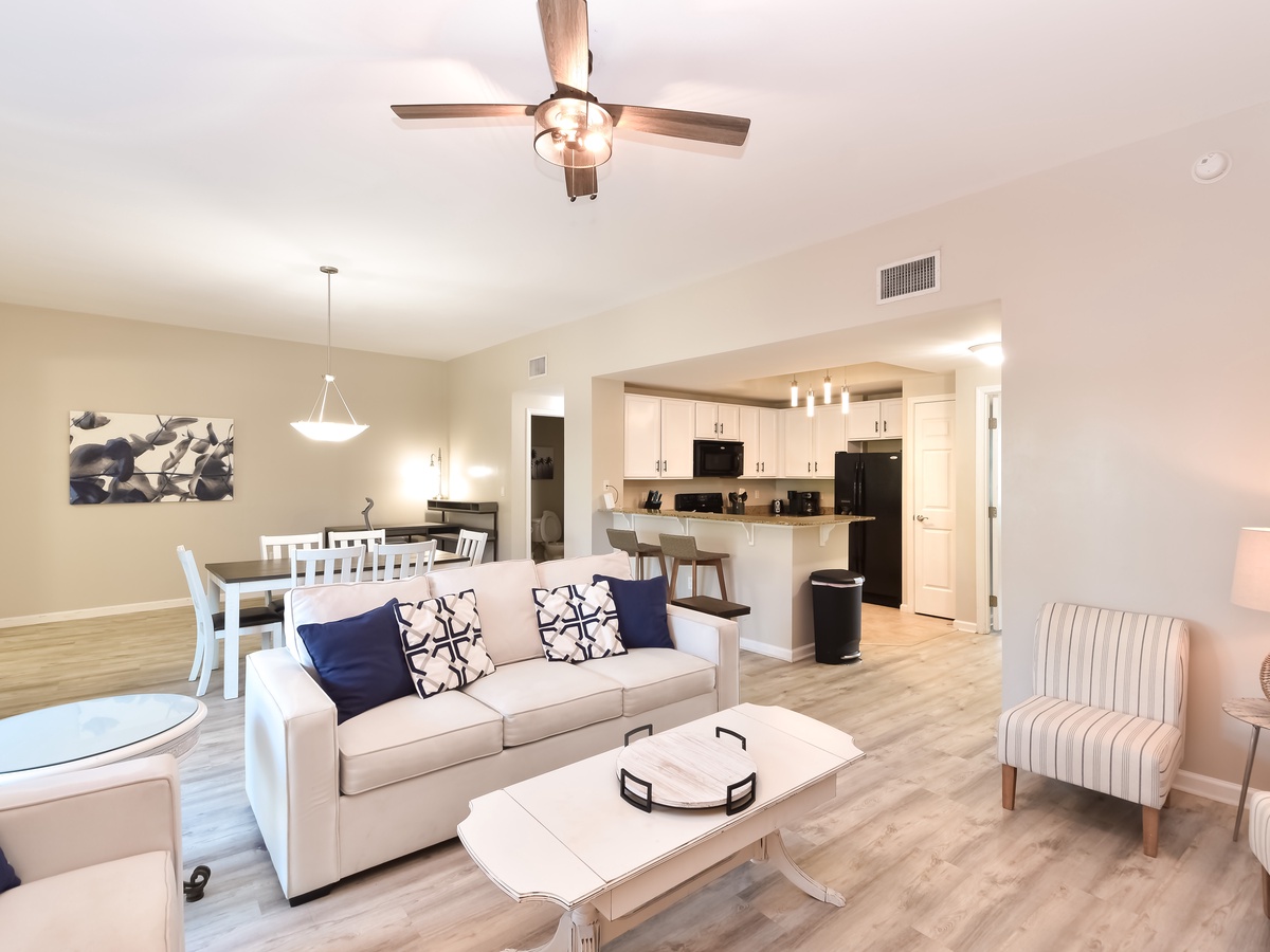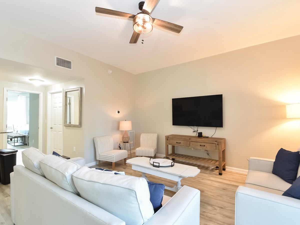 Welcome to The Palms of Destin Villa 3103. Perfectly positioned on the ground floor, this charming villa is ideal for families and guests who want to skip the elevators and enjoy easy access to all the fun. With the sparkling pool just outside your door, vacation mode kicks in the moment you arrive. Inside, you'll find a fully equipped kitchen that’s ready for anything from beach day snacks to full family dinners. Share meals around the dining table for six or enjoy casual bites at the bar with seating for two. The spacious living area is designed for together time, whether it's movie night, board games, or just unwinding after a sunny day at the beach. The primary suite offers a relaxing retreat with a king bed, flat-screen TV, and a private bath featuring a tub/shower combo. A second bedroom with a queen bed, plus a sleeper sofa in the living room, allows this villa to comfortably sleep up to six guests. Additional perks include a second hallway bathroom with a walk-in shower, in-unit washer and dryer, secure WiFi, and even a dedicated workspace, perfect for those blending business with beachside bliss. Come make unforgettable memories at The Palms of Destin 3103.