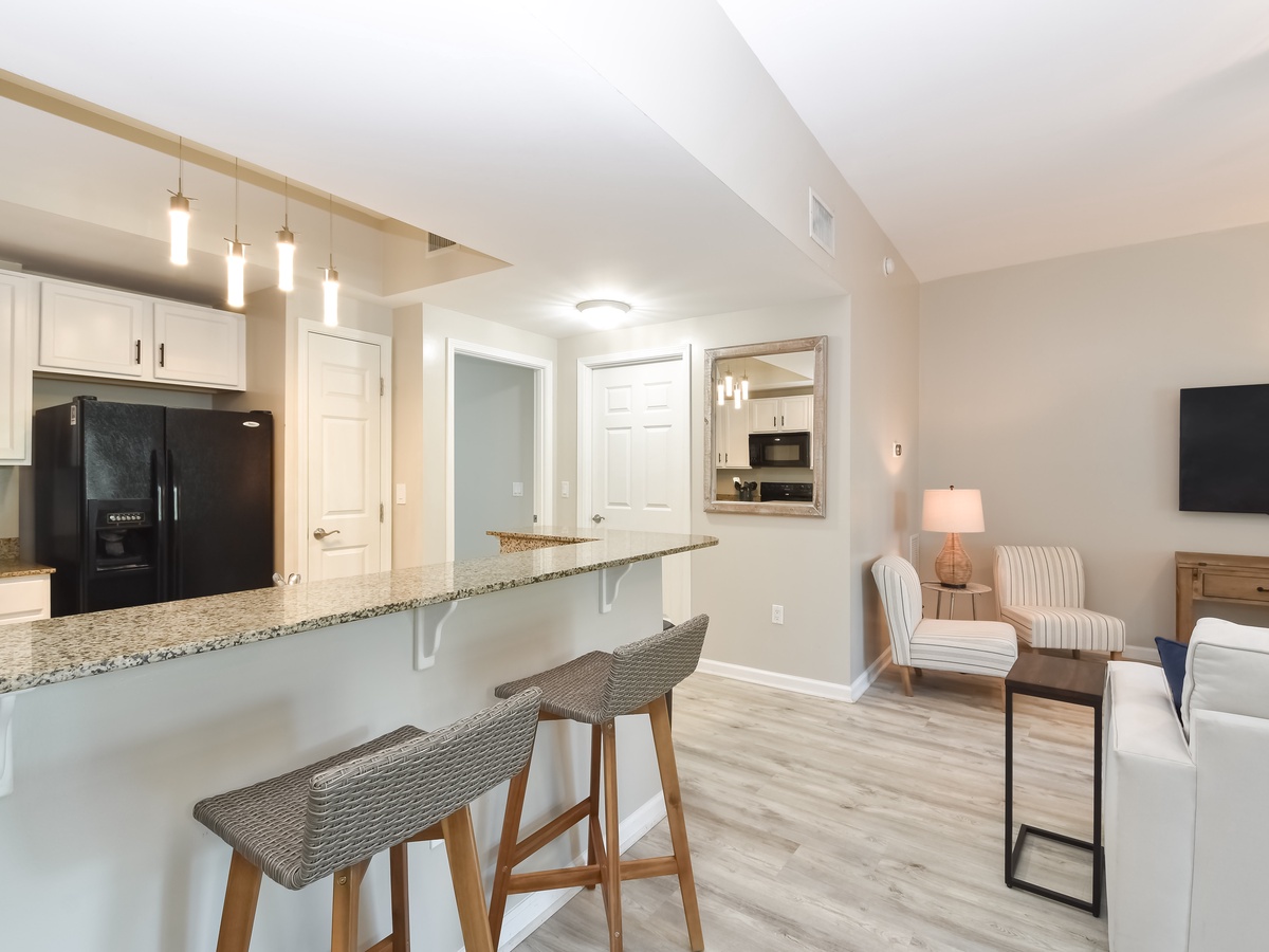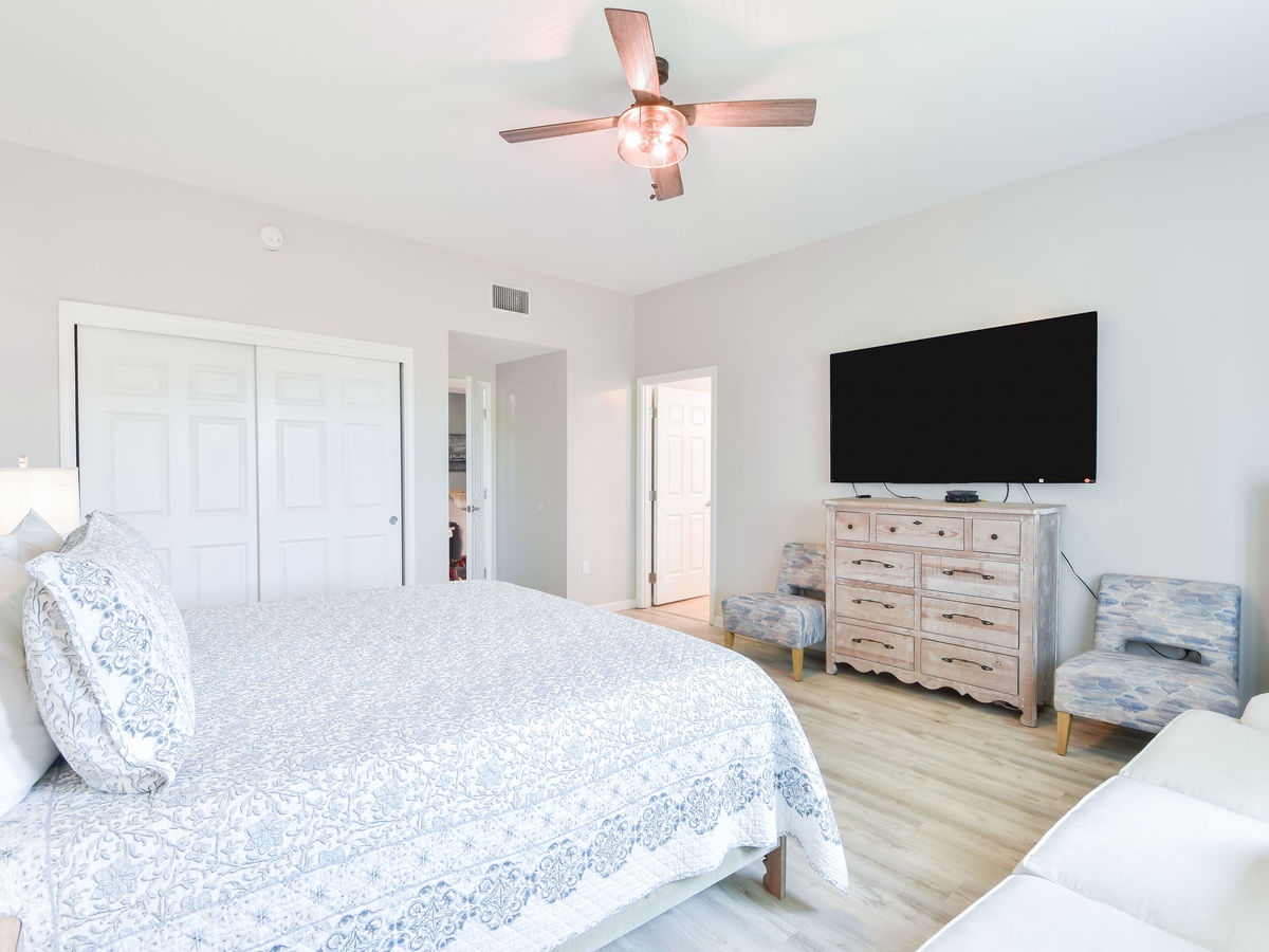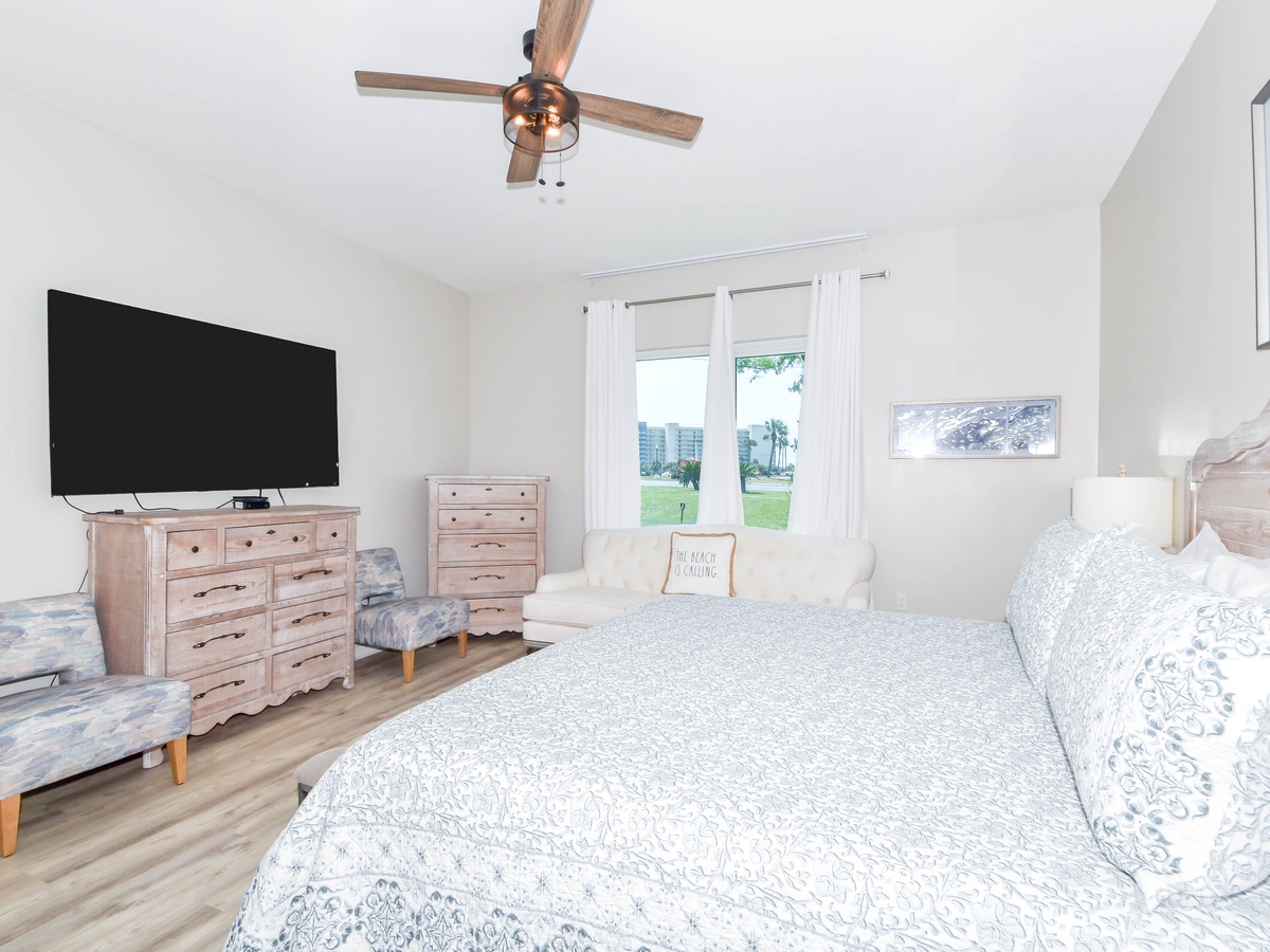 Welcome to The Palms of Destin Villa 3103. Perfectly positioned on the ground floor, this charming villa is ideal for families and guests who want to skip the elevators and enjoy easy access to all the fun. With the sparkling pool just outside your door, vacation mode kicks in the moment you arrive. Inside, you'll find a fully equipped kitchen that’s ready for anything from beach day snacks to full family dinners. Share meals around the dining table for six or enjoy casual bites at the bar with seating for two. The spacious living area is designed for together time, whether it's movie night, board games, or just unwinding after a sunny day at the beach. The primary suite offers a relaxing retreat with a king bed, flat-screen TV, and a private bath featuring a tub/shower combo. A second bedroom with a queen bed, plus a sleeper sofa in the living room, allows this villa to comfortably sleep up to six guests. Additional perks include a second hallway bathroom with a walk-in shower, in-unit washer and dryer, secure WiFi, and even a dedicated workspace, perfect for those blending business with beachside bliss. Come make unforgettable memories at The Palms of Destin 3103.
